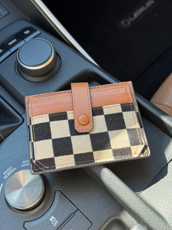 Keep your essentials stylishly in check with the playful brown and black Checkmate Card Holder Wallet, perfect for quick moves and smart grooves.