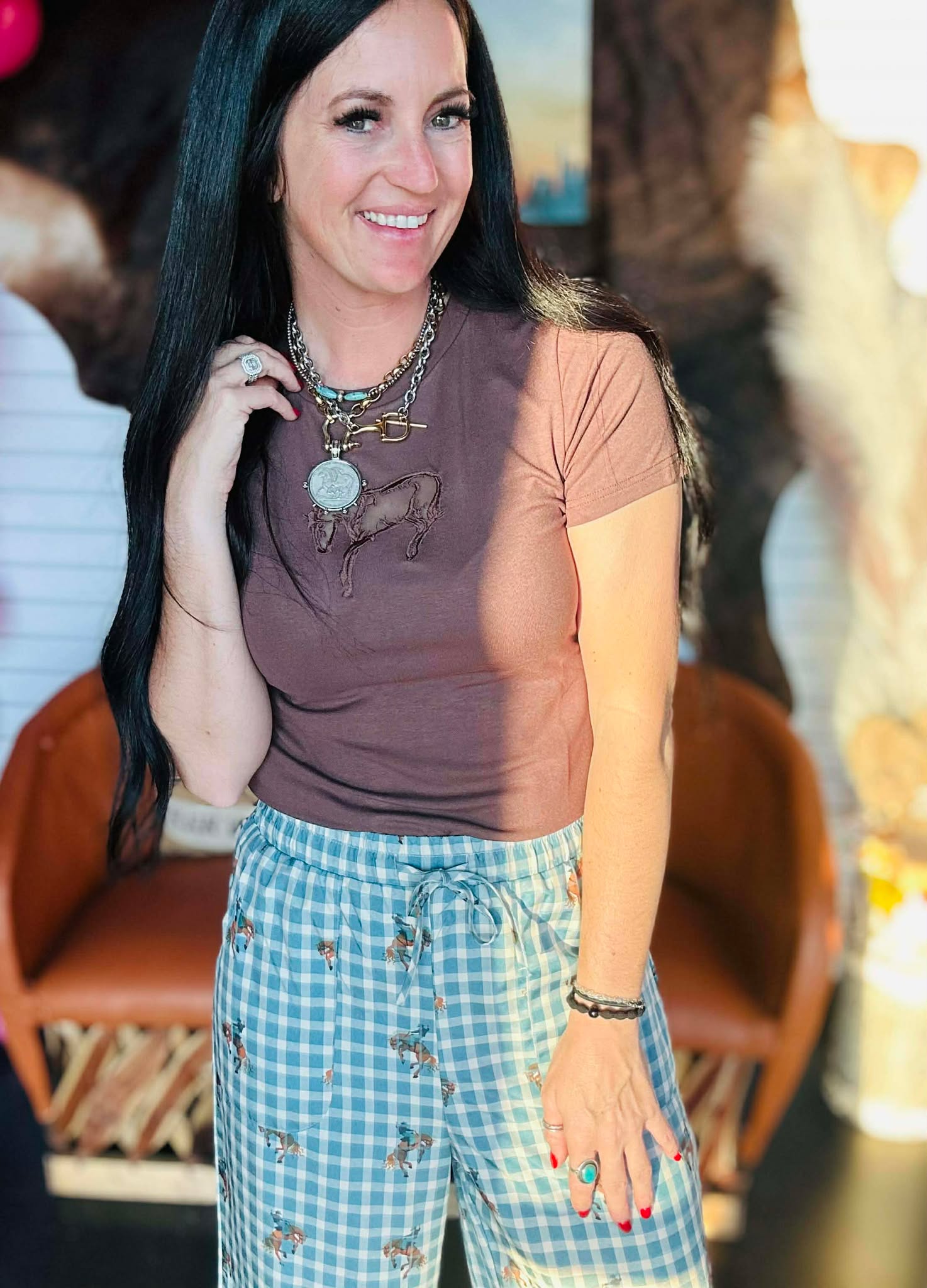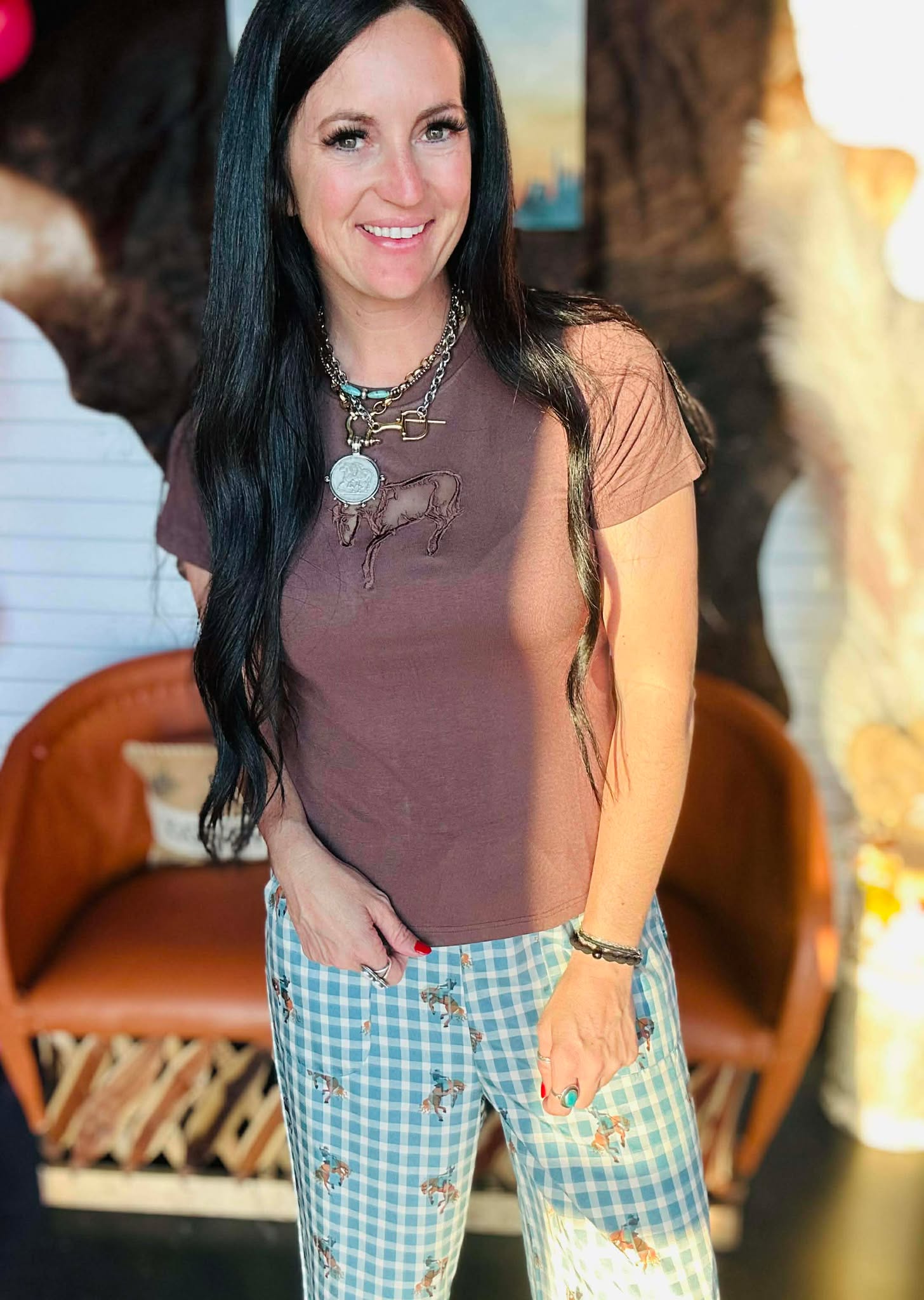 The rich brown base makes it easy to style with denim, skirts, or layered under a shacket. It’s more fitted than our typical flowy tees, but not snug and not clingy — just structured enough to feel polished while still giving you comfortable stretch.