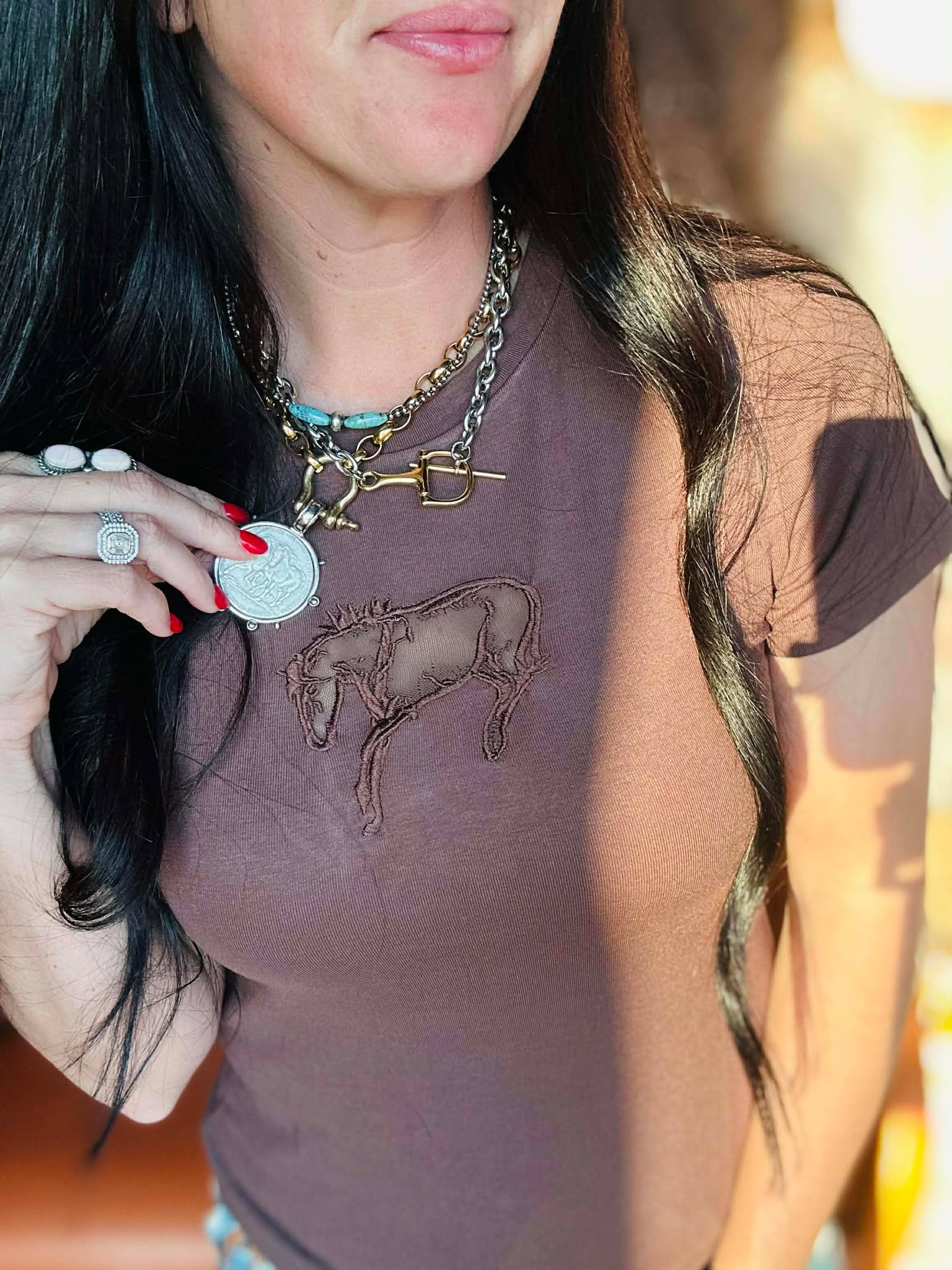 This is not the plain chocolate basic. The Buck Out Cut Out Brown Tee features a bold bucking horse graphic with a mesh cutout right in the center — and it’s placed perfectly. You get that little edgy moment without showing too much, so yes… even our modest gals can rock it confidently.