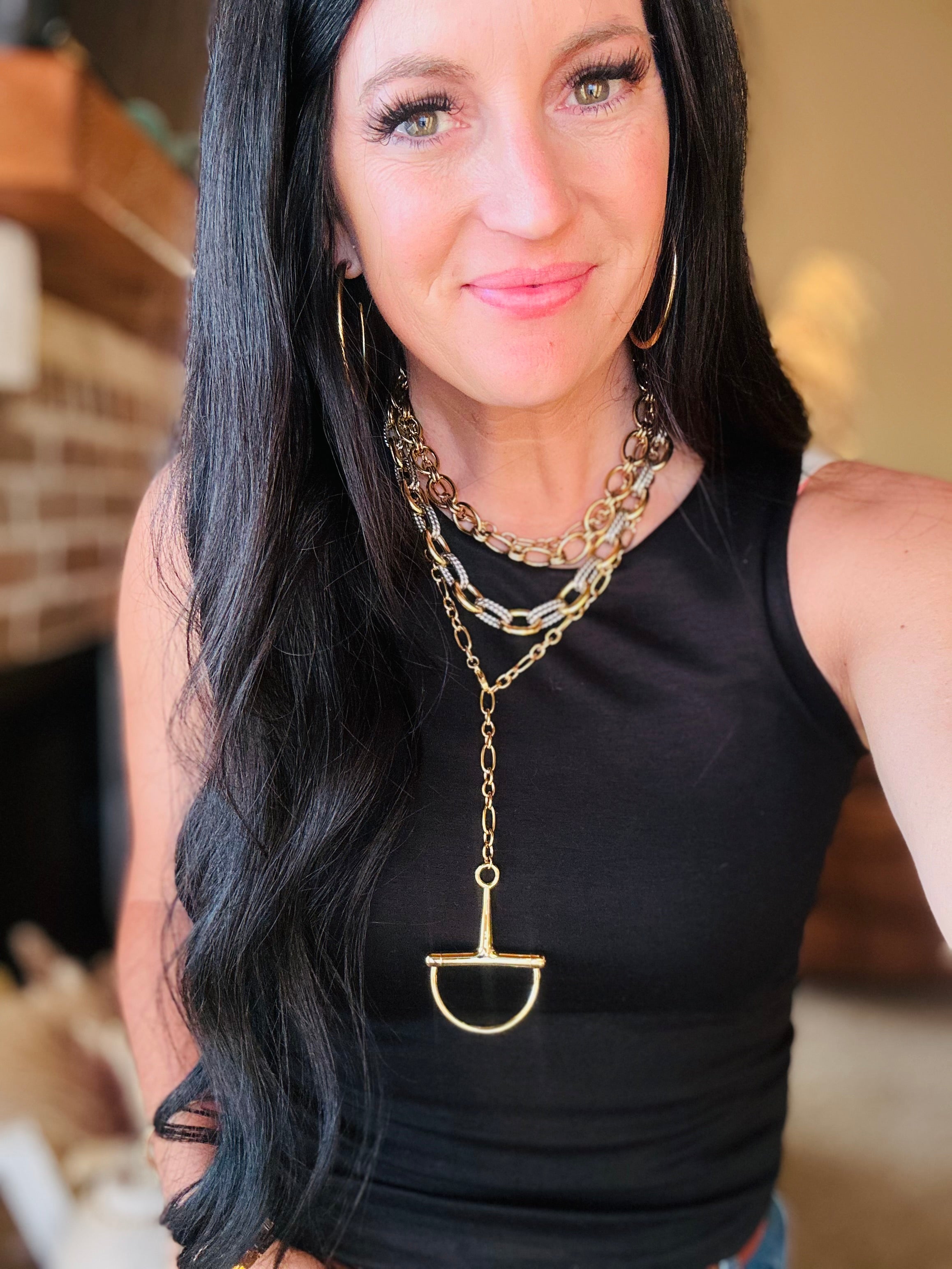 You know that feeling when your outfit is almost there… but it needs something? This is that something. The D Ring Snaffle Bit Necklace instantly pulls your look together with classic western charm and a modern, elevated feel. The extra-long chain gives you options — wear it long and effortless or wrap it for that layered look without having to stack multiple necklaces.