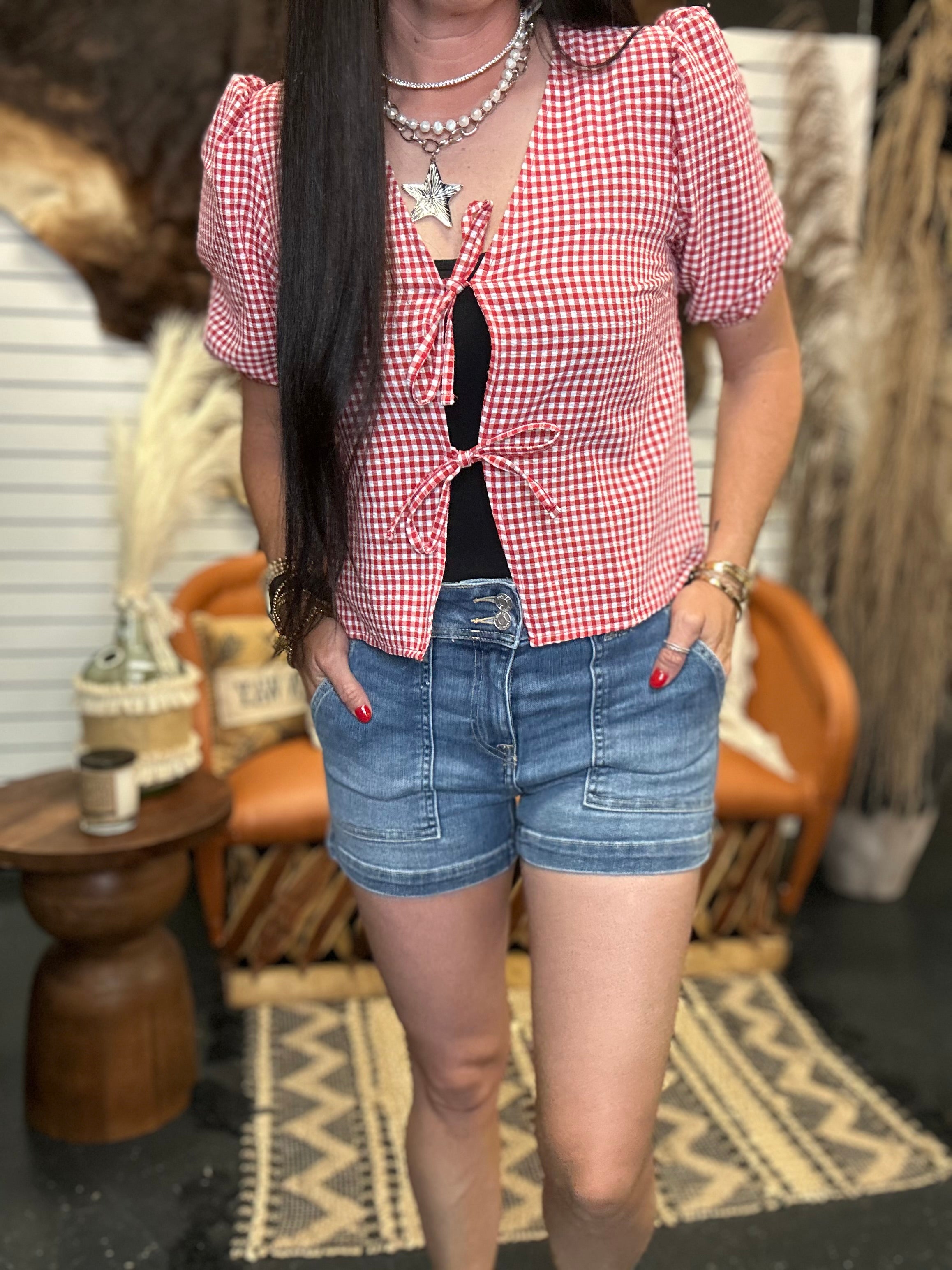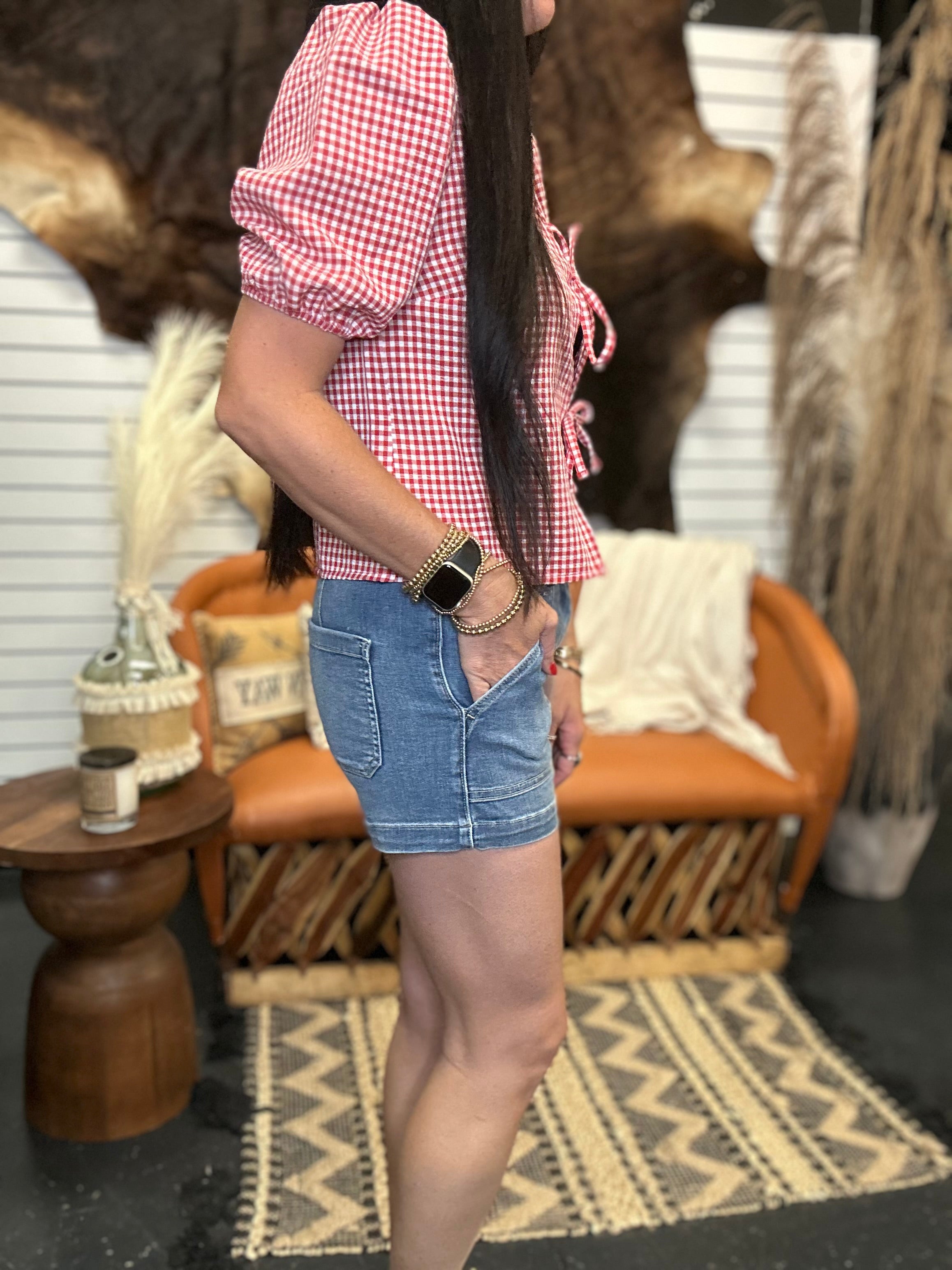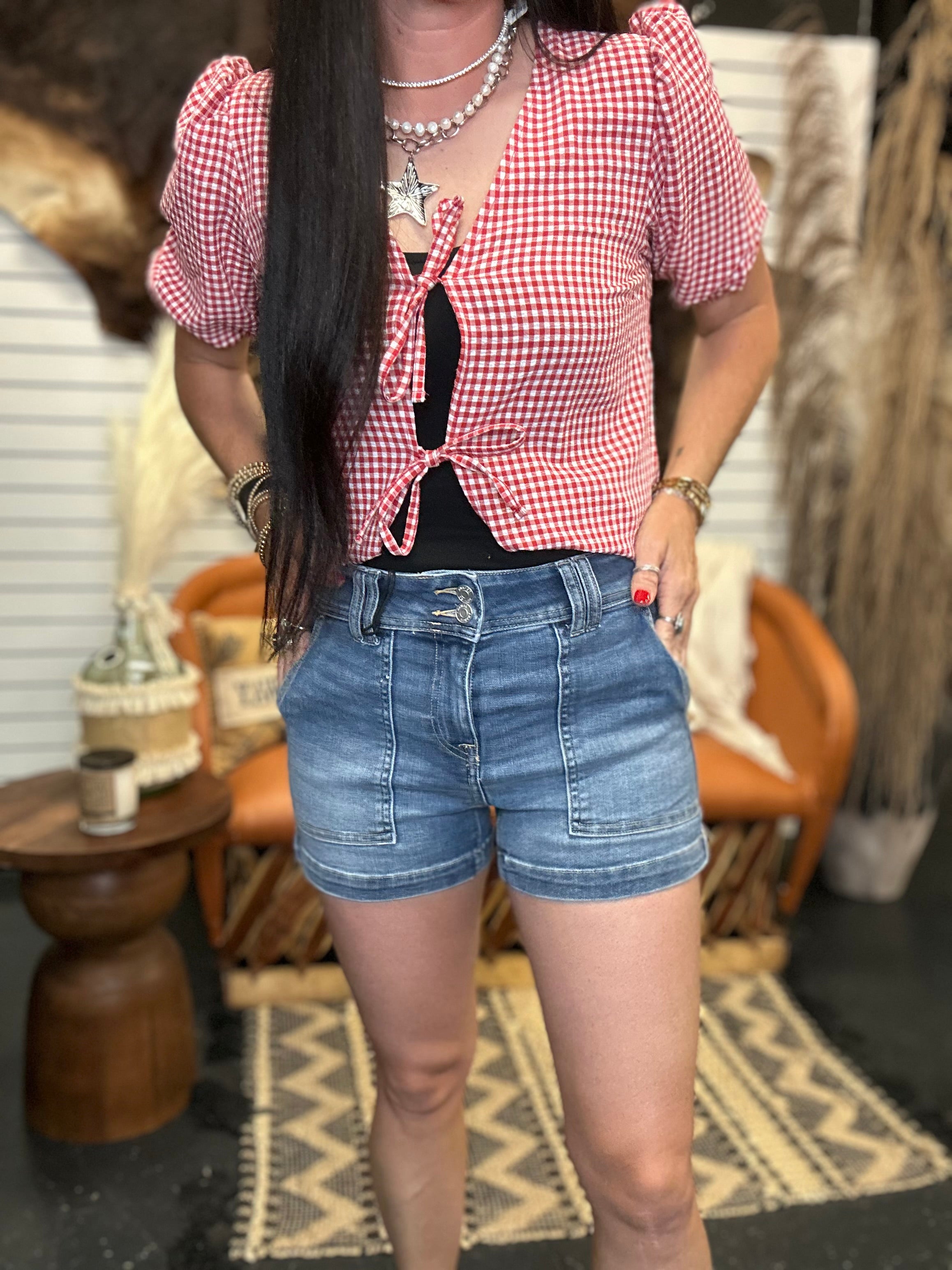 If you love the look of a classic denim short but need something that feels a little more “real life” friendly, you’re going to be obsessed with the Slate Utility Pocket Denim Shorts. The utility pocket detail gives them that cool, laid-back vibe, while the mid rise and stretchy denim keep them comfy for busy days on the go. Easy, flattering, and made for summer plans—without feeling too short or too stiff..