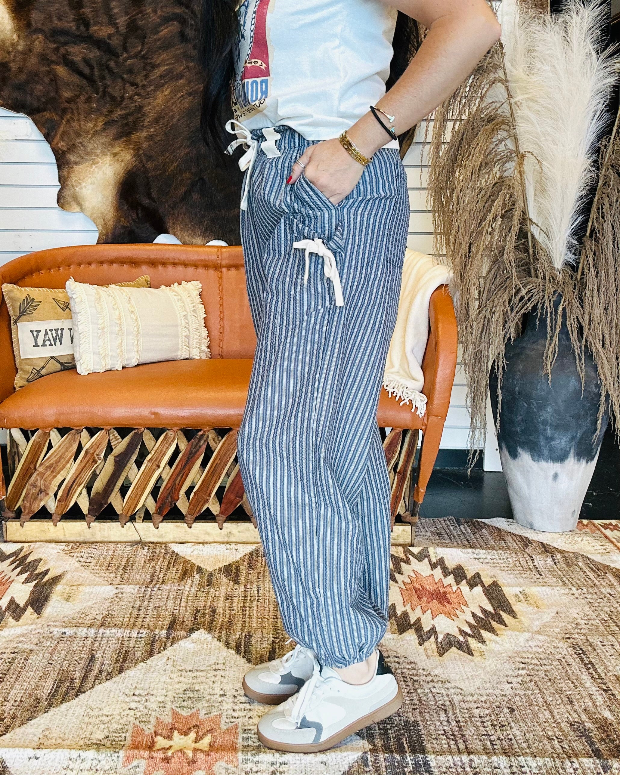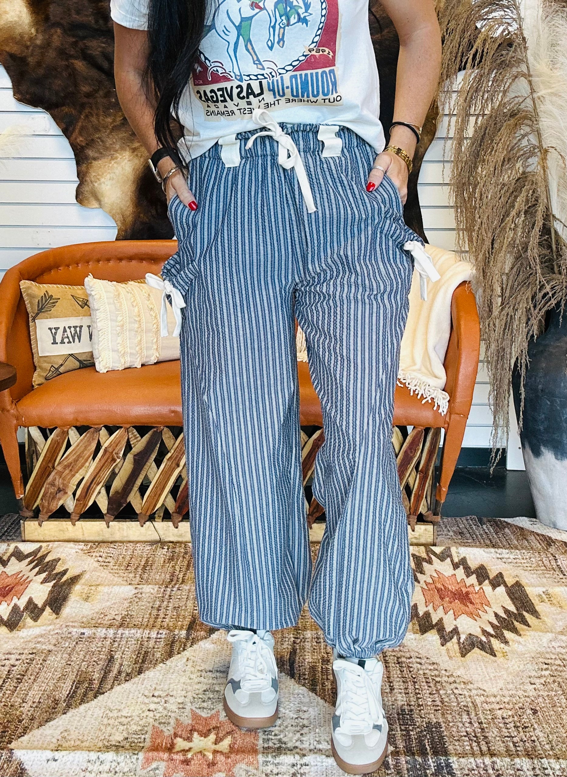 Women’s Navy Striped Textured Woven Jogger Pants with Bow Pocket Detail