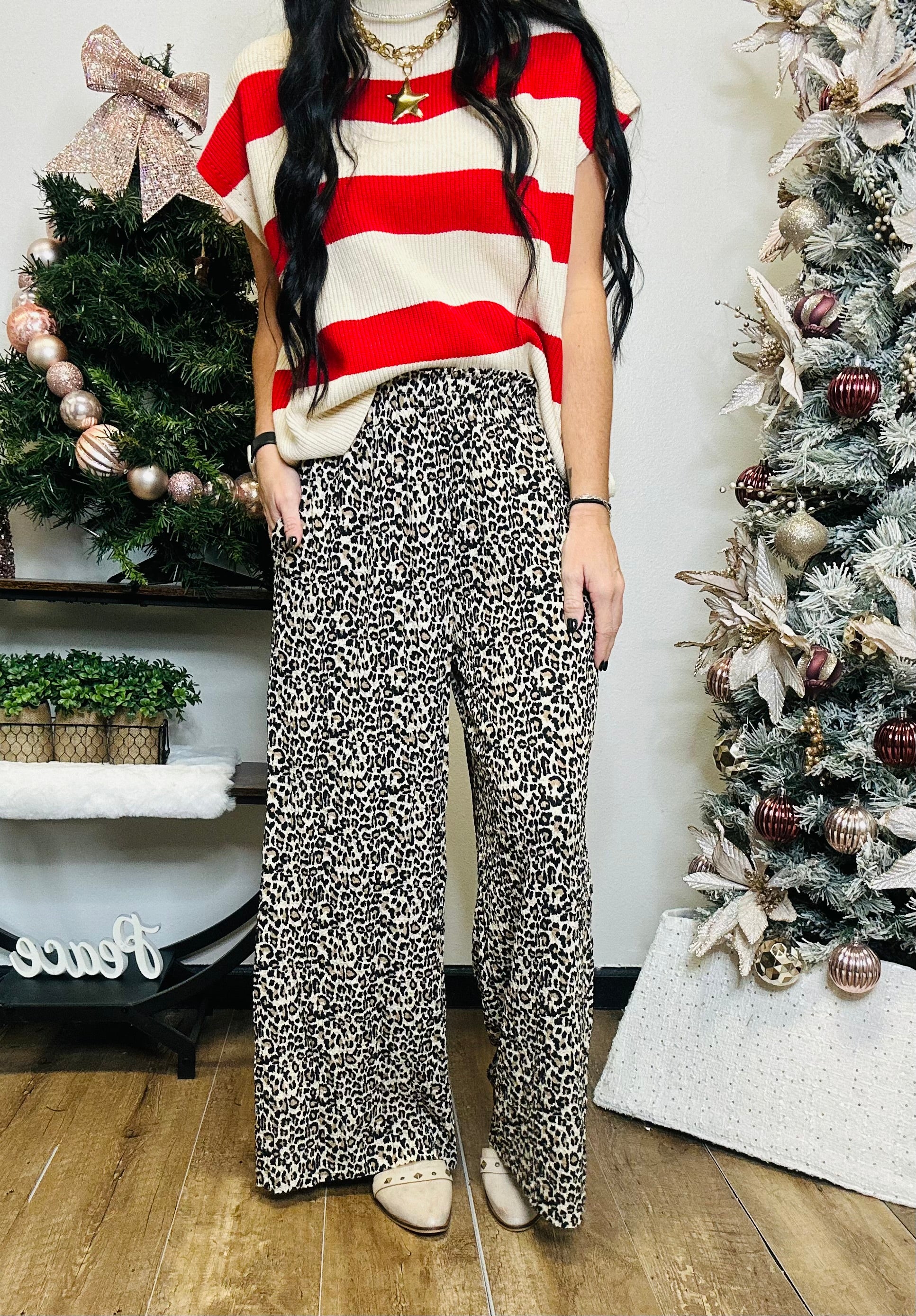 Women's Wide Leg Leopard Print Pants with Elastic Waist