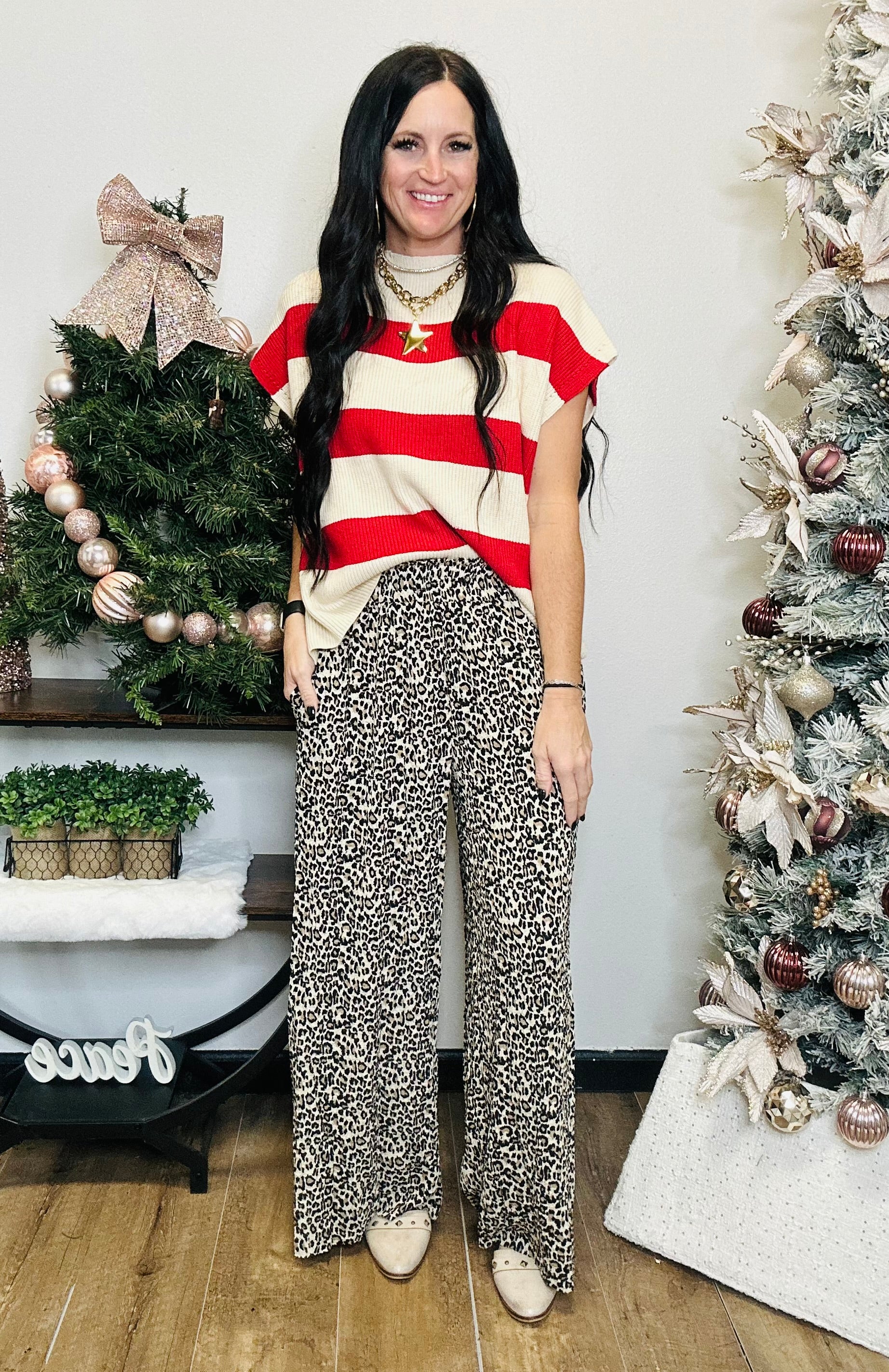 Turn heads and own your wild side with our Lex Leopard Print Wide Leg Pants — the perfect mix of bold style and laid-back comfort. These high-waisted beauties feature a flattering elastic waist with a soft ruffle detail, giving you that easy, confident fit Motis gals love. The wide leg silhouette and flowy drape make them perfect for pairing with a fitted tank, a simple tee, or even a cropped sweater. Whether you’re headed to brunch, a concert, or a night out with the girls, these pants bring that signature western-chic edge with a touch of boho sass.