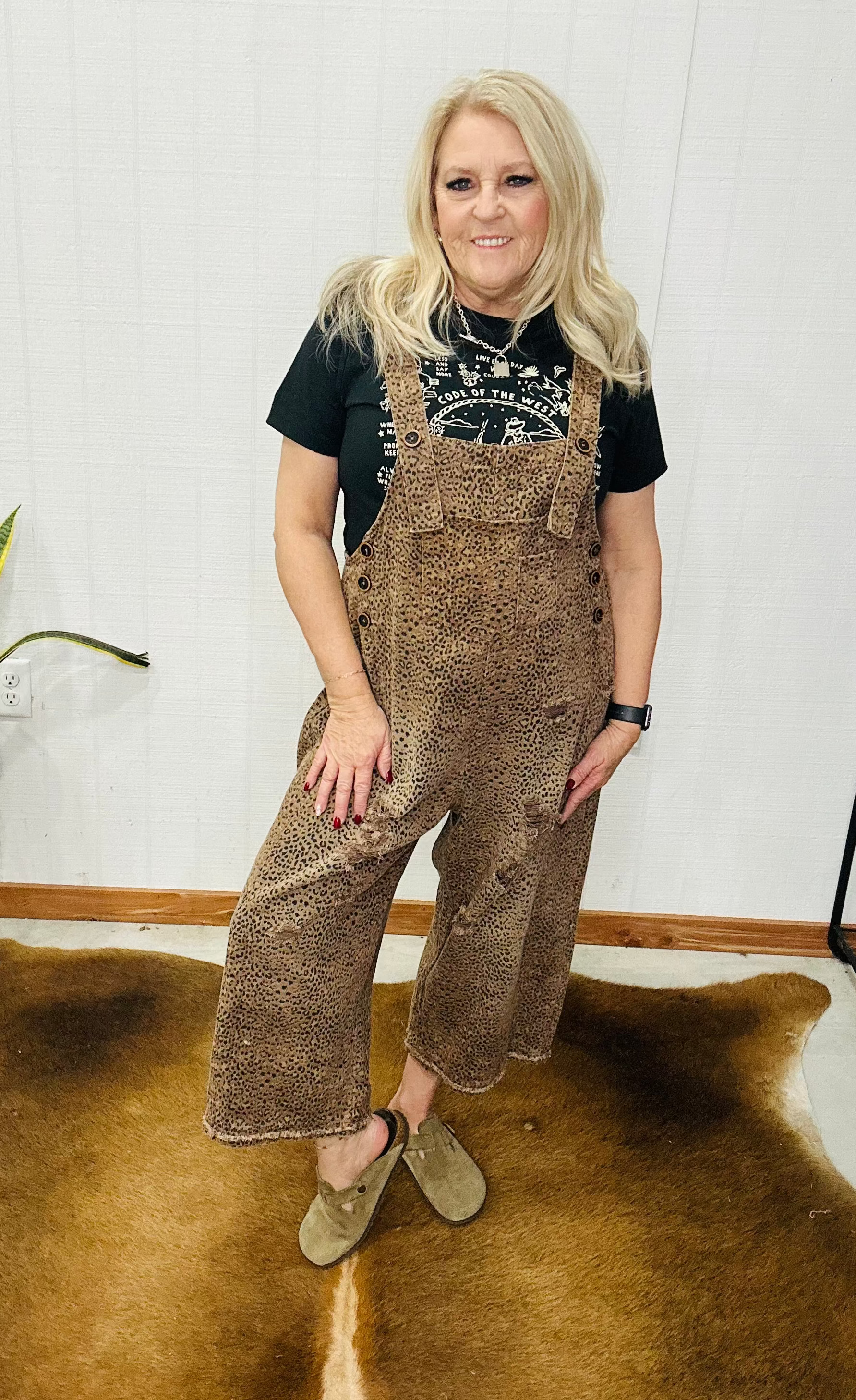 The Lindsay Destroyed Leopard Overalls are that “throw on and look cool” piece your closet’s been begging for. The wide leg, baggy fit gives all the comfy, off-duty vibes while the leopard print and distressing keep it edgy and fun. Wear them with a fitted bodysuit and sneakers for school pick-up, toss on a graphic tee and boots for a casual concert, or layer over a long sleeve when the temps drop. Easy, comfortable, and full of personality — just like our Motis girls. 💛