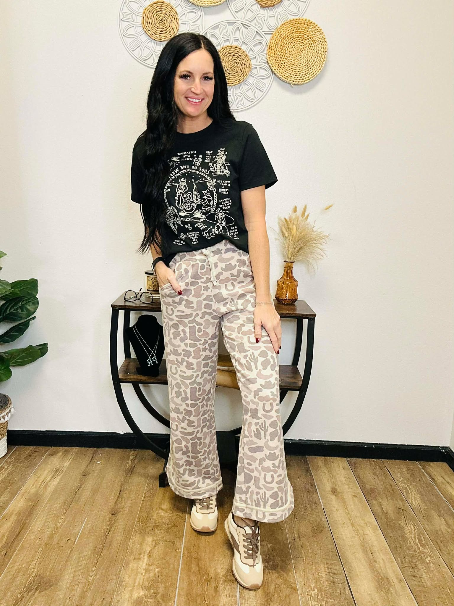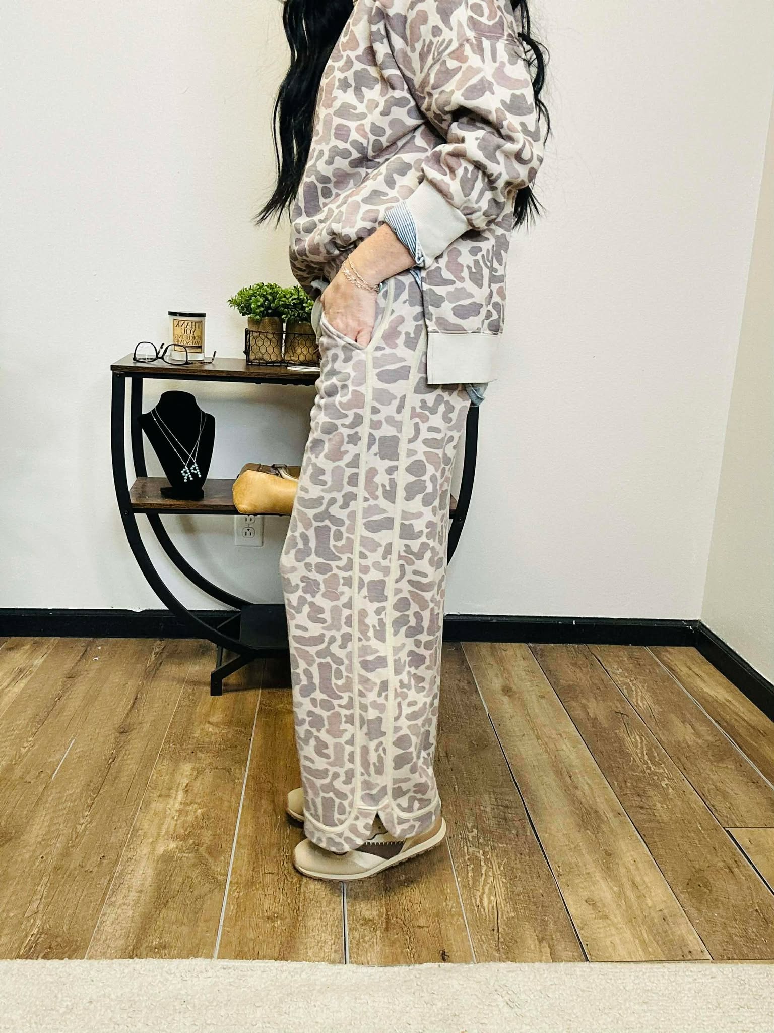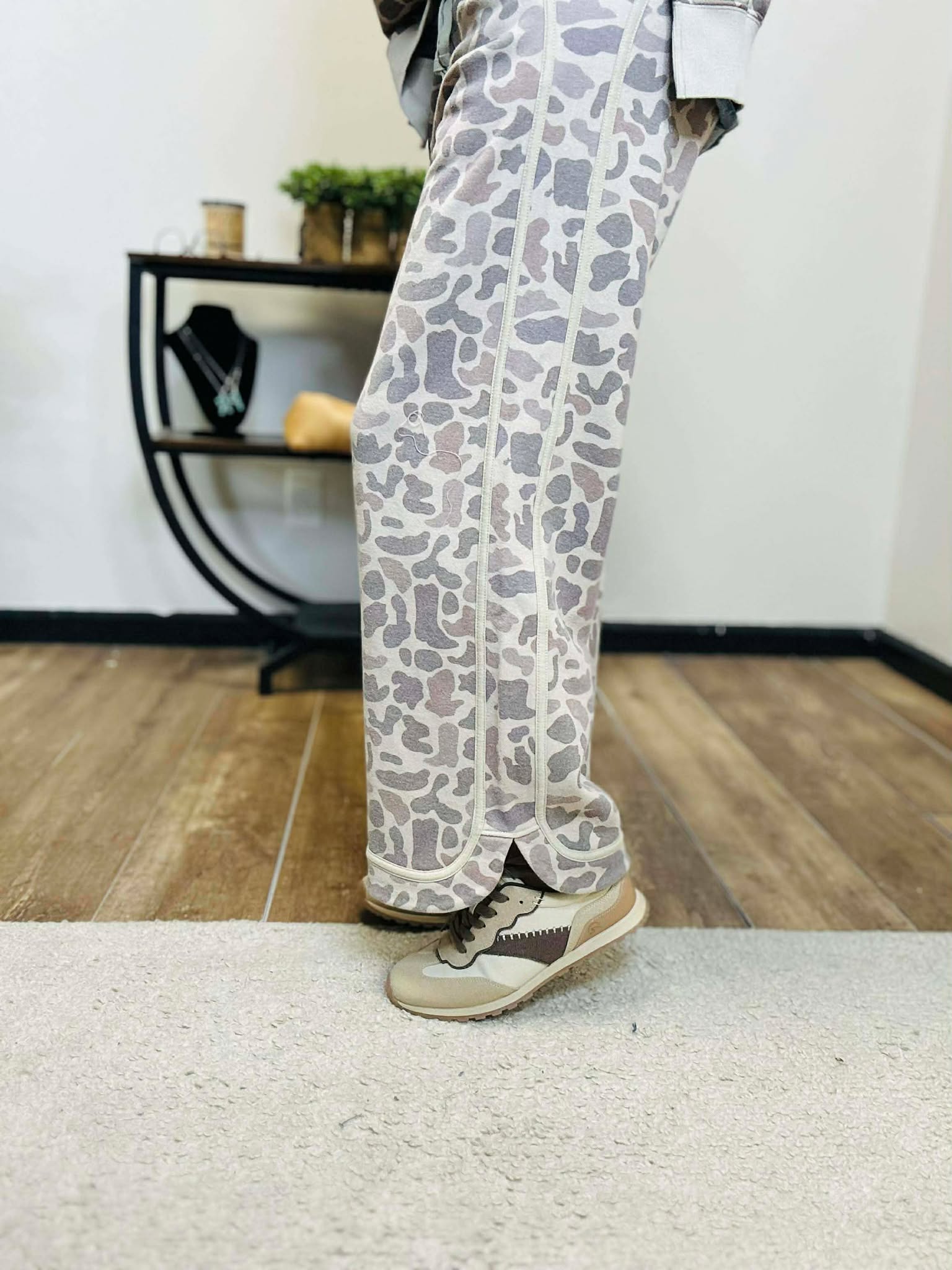 Wes is your off-duty western vibe in sweatpant form. These wide leg camo pants bring the cozy and the cool, with a western-inspired print and sleek side piping that instantly levels up a simple tee or sweatshirt. The rounded bottoms give them a more finished look than your average joggers—cute with sneakers, slides, or boots for busy days on the go.