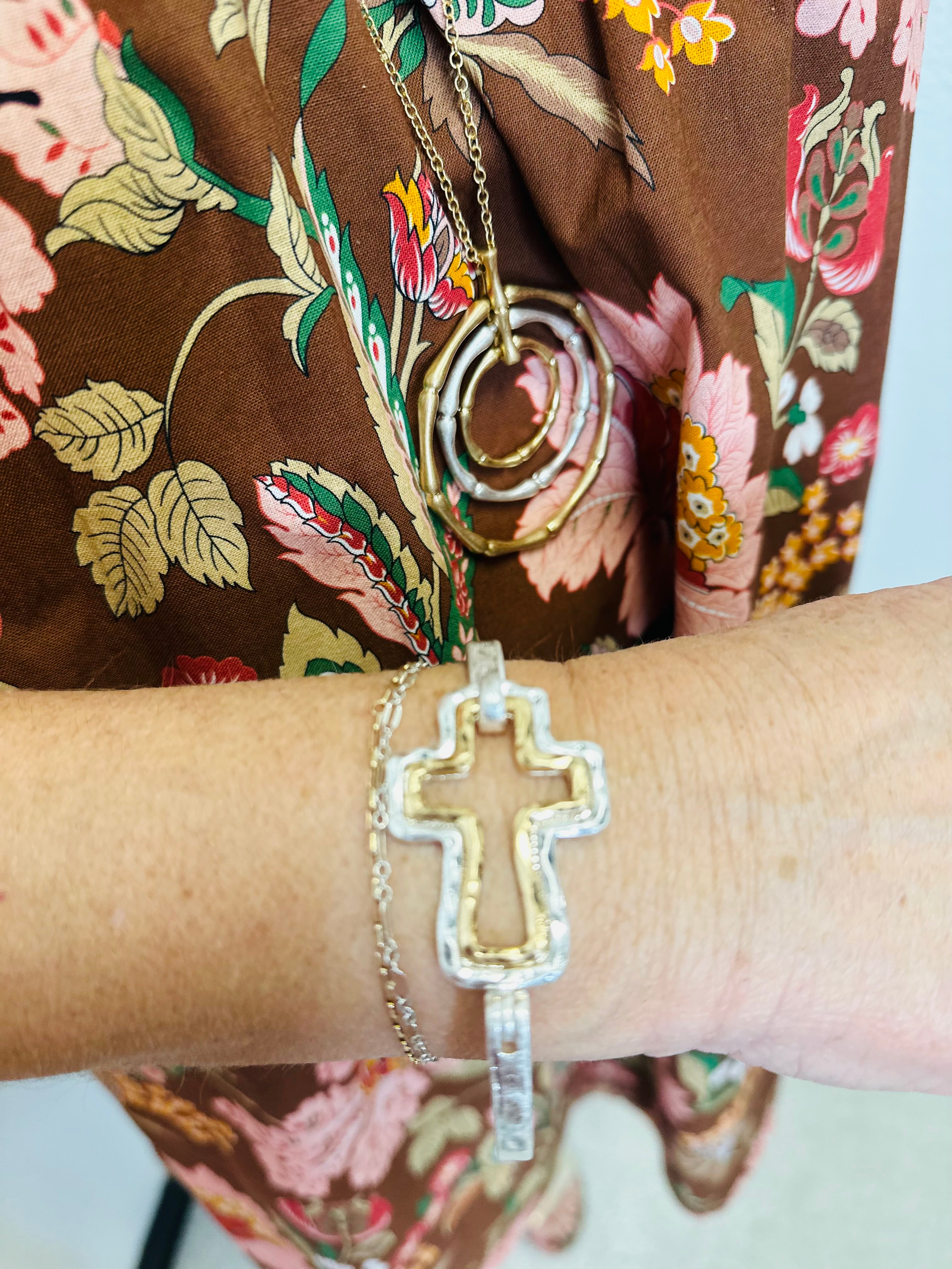 Get hammered in style with our Two Tone Hammered Cross Spring Bracelet! This bracelet features silver tone cuff with a trendy cross design in gold and silver with an easy hook fastener and comfortable spring style cuff. We love mixing silver and gold tones. Perfect for adding some spiritual flair to your outfit!