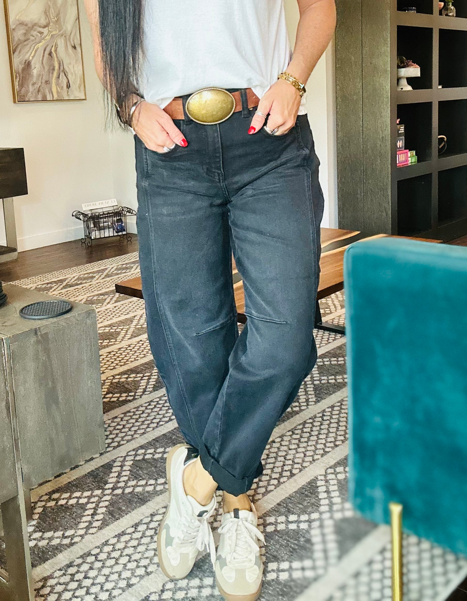 If you want denim that feels fresh, flattering, and a little edgy (without trying too hard), the Jake Black Cropped Barrel Jeans are the move. The high rise gives you that held-in, confident fit, while the barrel shape keeps it modern and easy to wear. The best part? The cuff is adjustable—keep it cuffed for a cropped look or release it for a little extra length. These are the jeans you grab when you want to look put together fast, but still feel comfortable all day.
