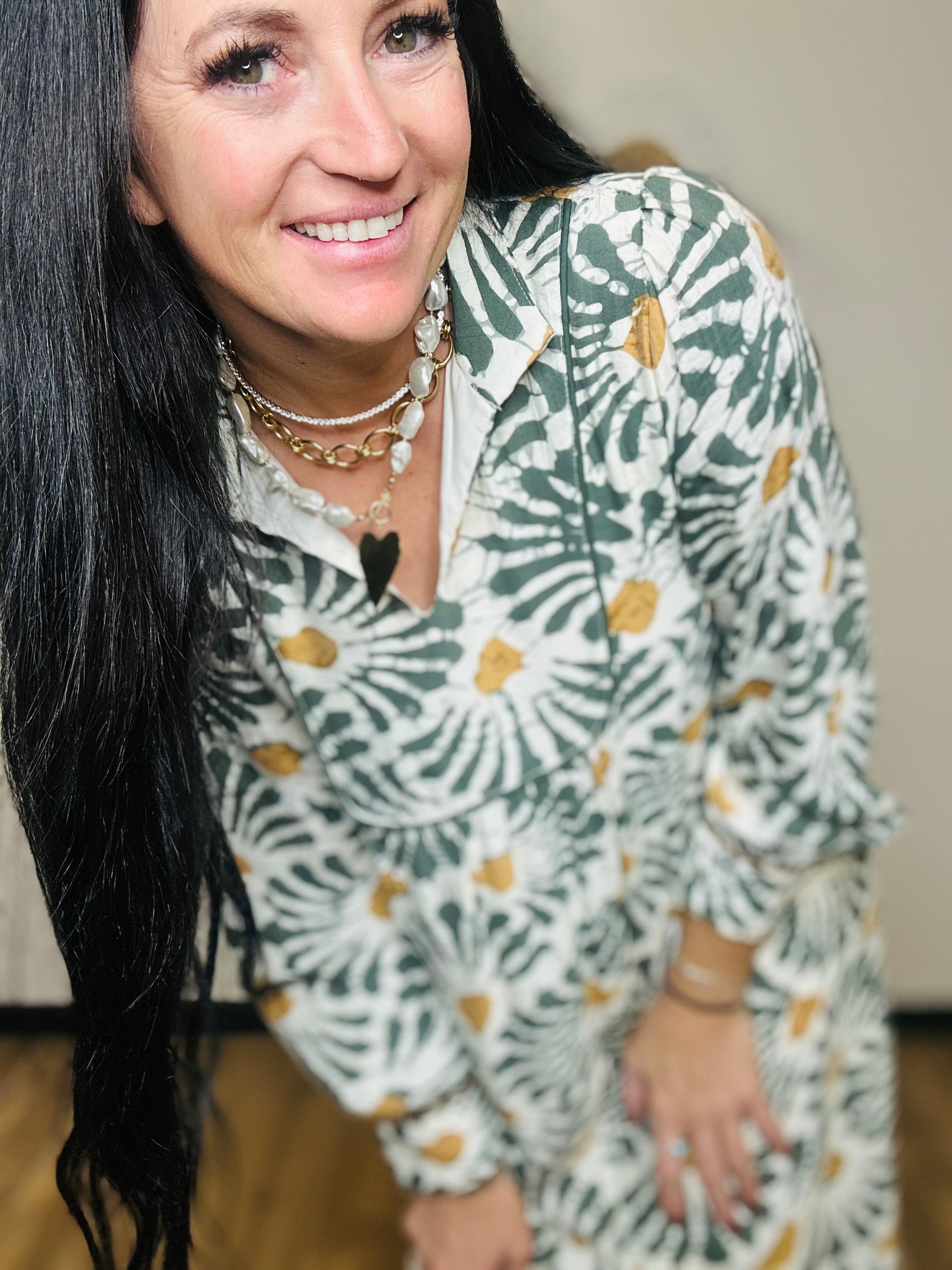 The Danna Dress is that effortless beauty you’ll reach for again and again. With soft olive and gold tones and a boho-inspired print, it’s flowy, flattering, and full of personality. The standing neckline and long sleeves give it that perfectly put-together look, while the easy fit makes it comfortable enough for all-day wear.