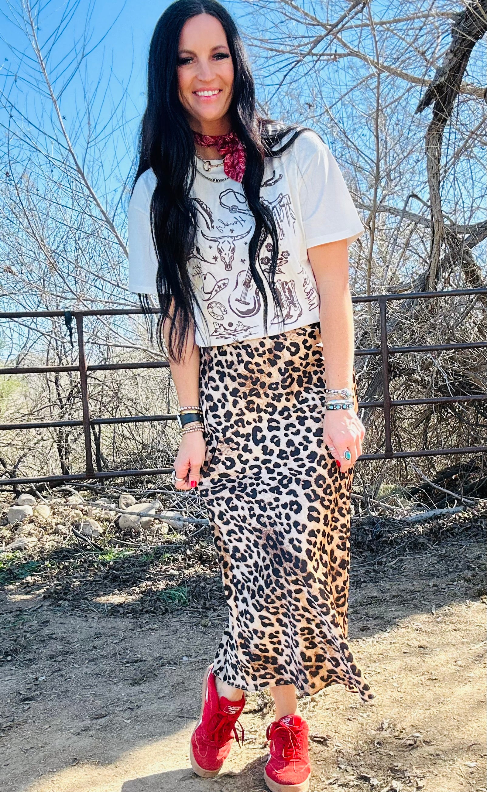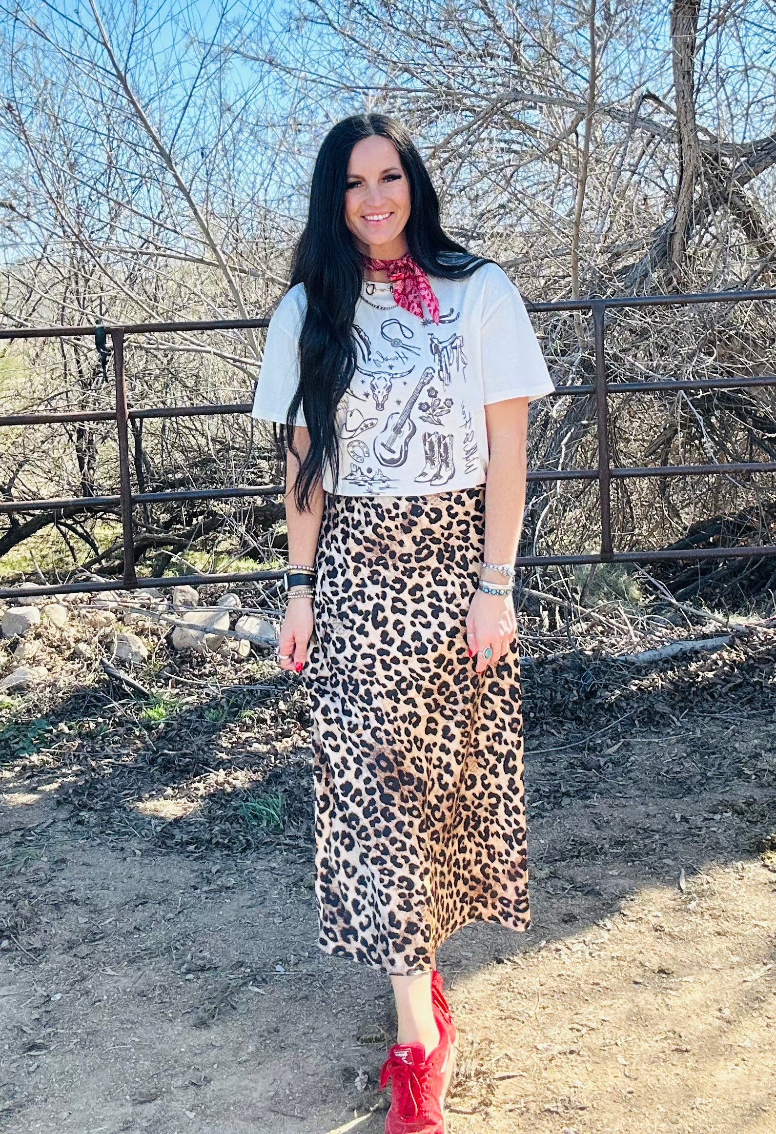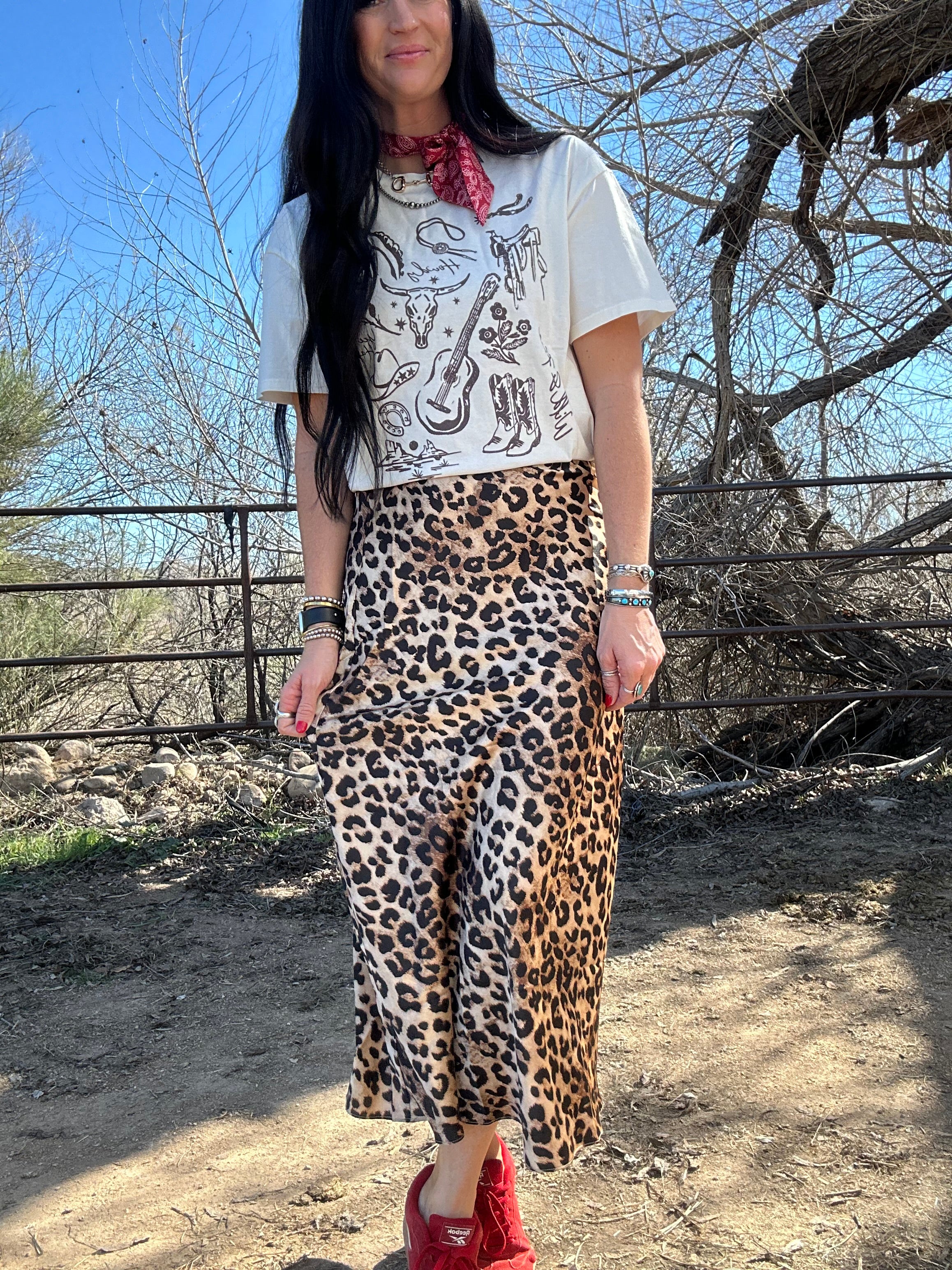 The Lenny Skirt brings effortless elegance with a touch of boldness. Designed in a silky satin fabric with a timeless leopard print, this midi skirt moves beautifully with every step. The stretch waistband makes it incredibly comfortable and easy to wear, while the soft sheen gives it that elevated, boutique feel. Dress it up with a fitted top and heels or keep it casual with a graphic tee and sneakers—Lenny is the kind of versatile piece that works for any season and any occasion.