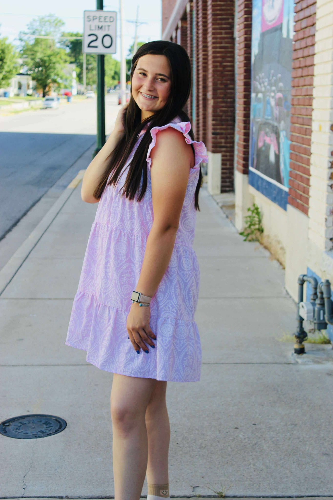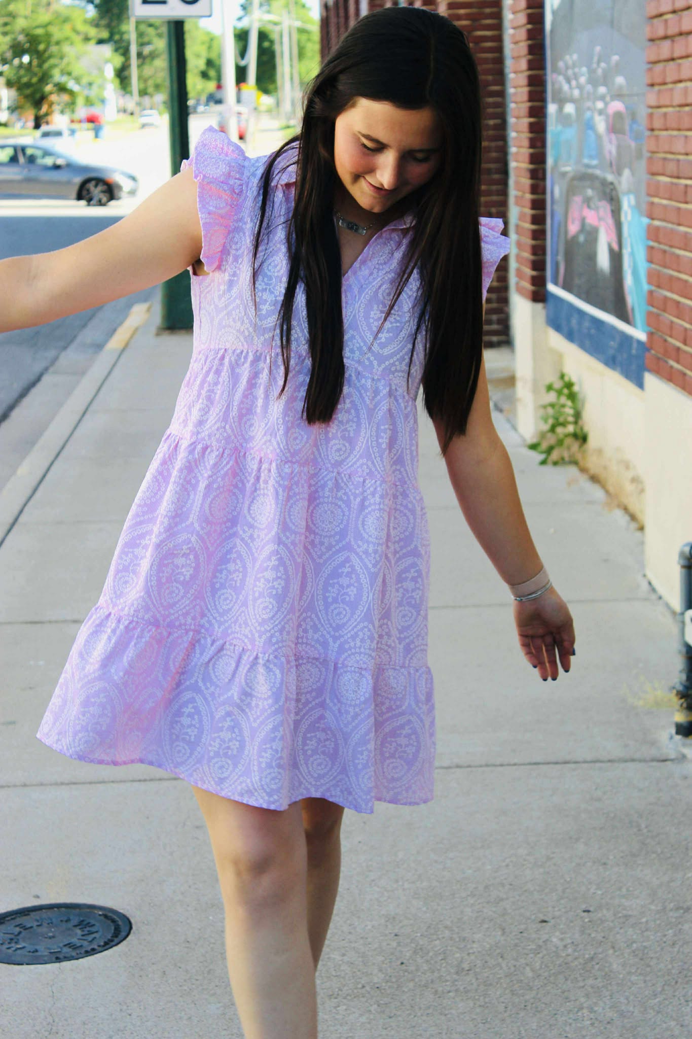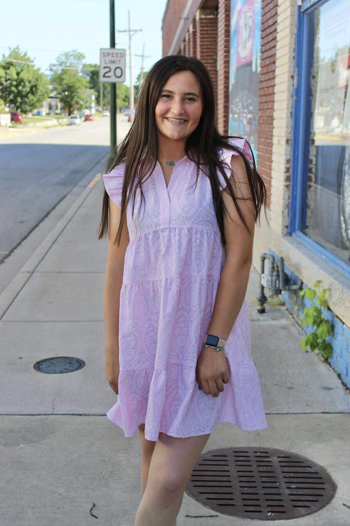 Get your frill on with the Isabella Pink Tired Dress. This women's dress features a playful ruffled cap sleeve and a soft pink tiered design. With a v neckline and raised faux-embroidered print, this dress is perfect for adding some fun to your wardrobe.