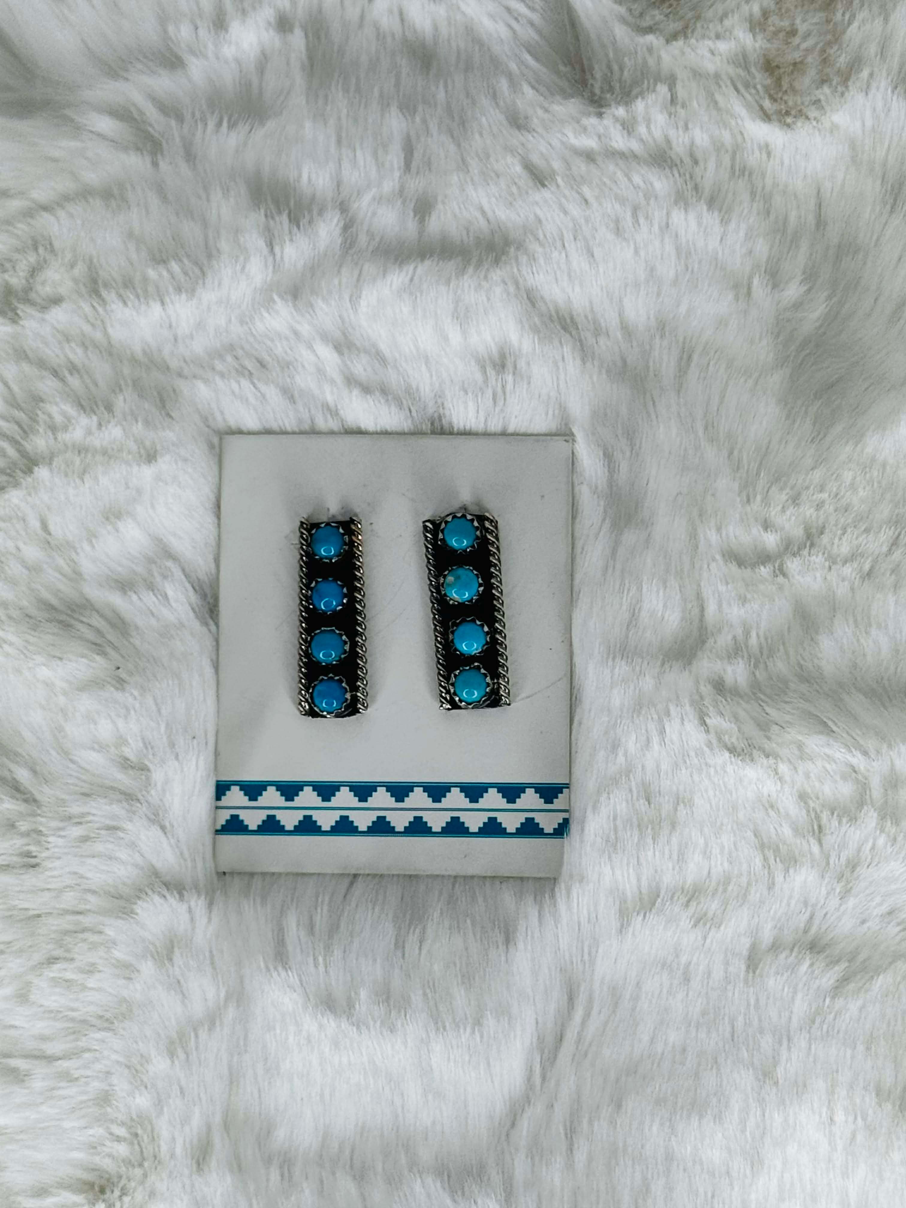 Meet Esther—the earring that proves good things come in petite packages! These minimalist bar studs showcase four genuine Kingman turquoise stones set in gleaming sterling silver, creating a modern take on Southwestern style. Lightweight and versatile, they slip seamlessly from office to weekend adventures. The authentic turquoise brings natural color variation and character to every wear, while the sleek bar design keeps things effortlessly chic. Stack them, mix them, or let them shine solo—these little beauties are ready for anything.