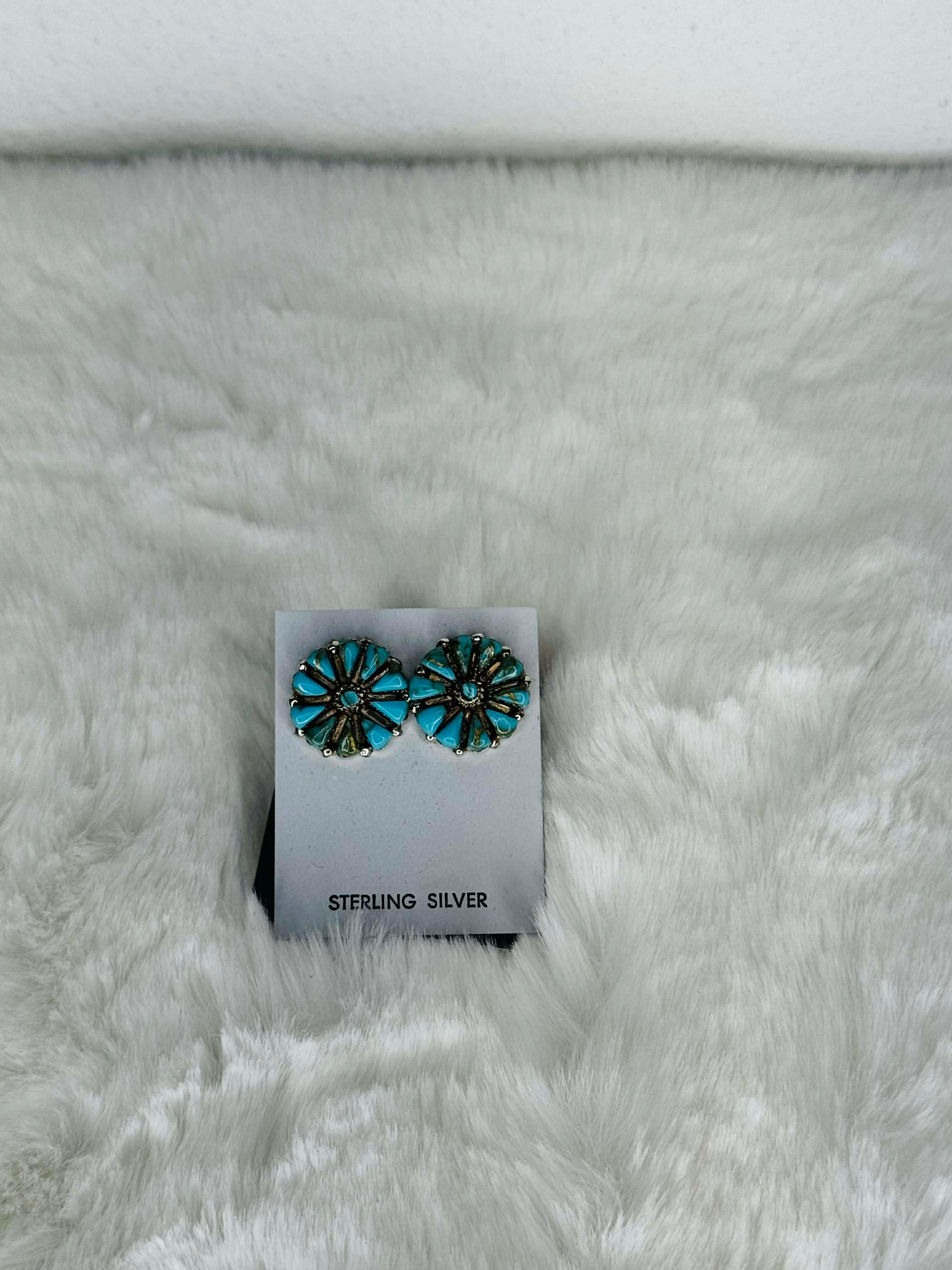 Meet Tricia's mini masterpieces—petite clusters that pack serious style! Handcrafted by Zuni artist Tricia Leekity, these sterling silver studs feature authentic Kingman turquoise stones arranged in a charming cluster design. At approximately half an inch, they're the perfect size for stacking, layering, or wearing solo. Each pair showcases the artisan's meticulous attention to detail and celebrates the natural beauty of genuine turquoise. Lightweight and wearable, these little gems bring authentic Southwestern artistry to your everyday rotation—proof that good things really do come in small packages.