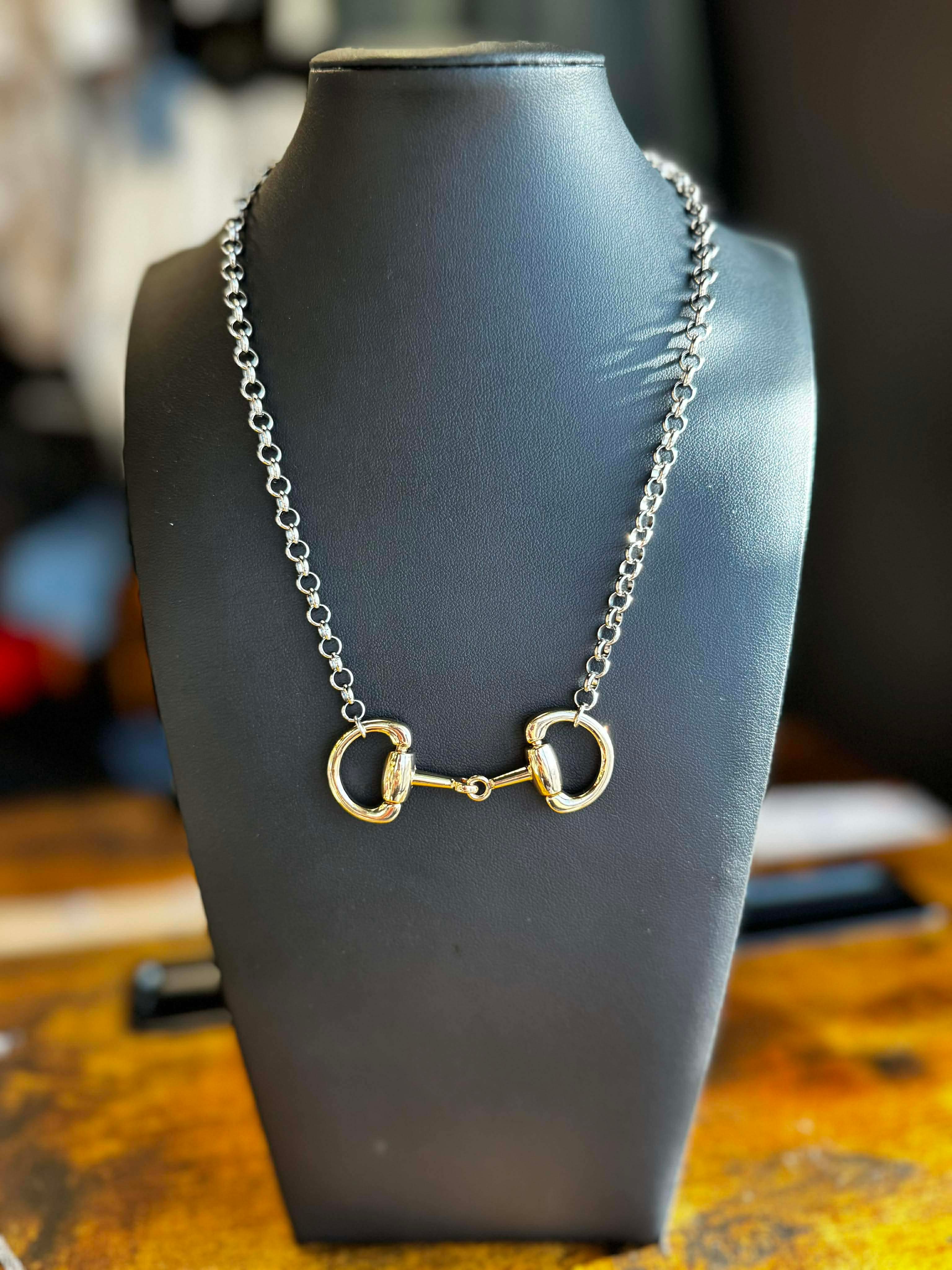 Color: Silver chain with gold-tone snaffle bit centerpiece
