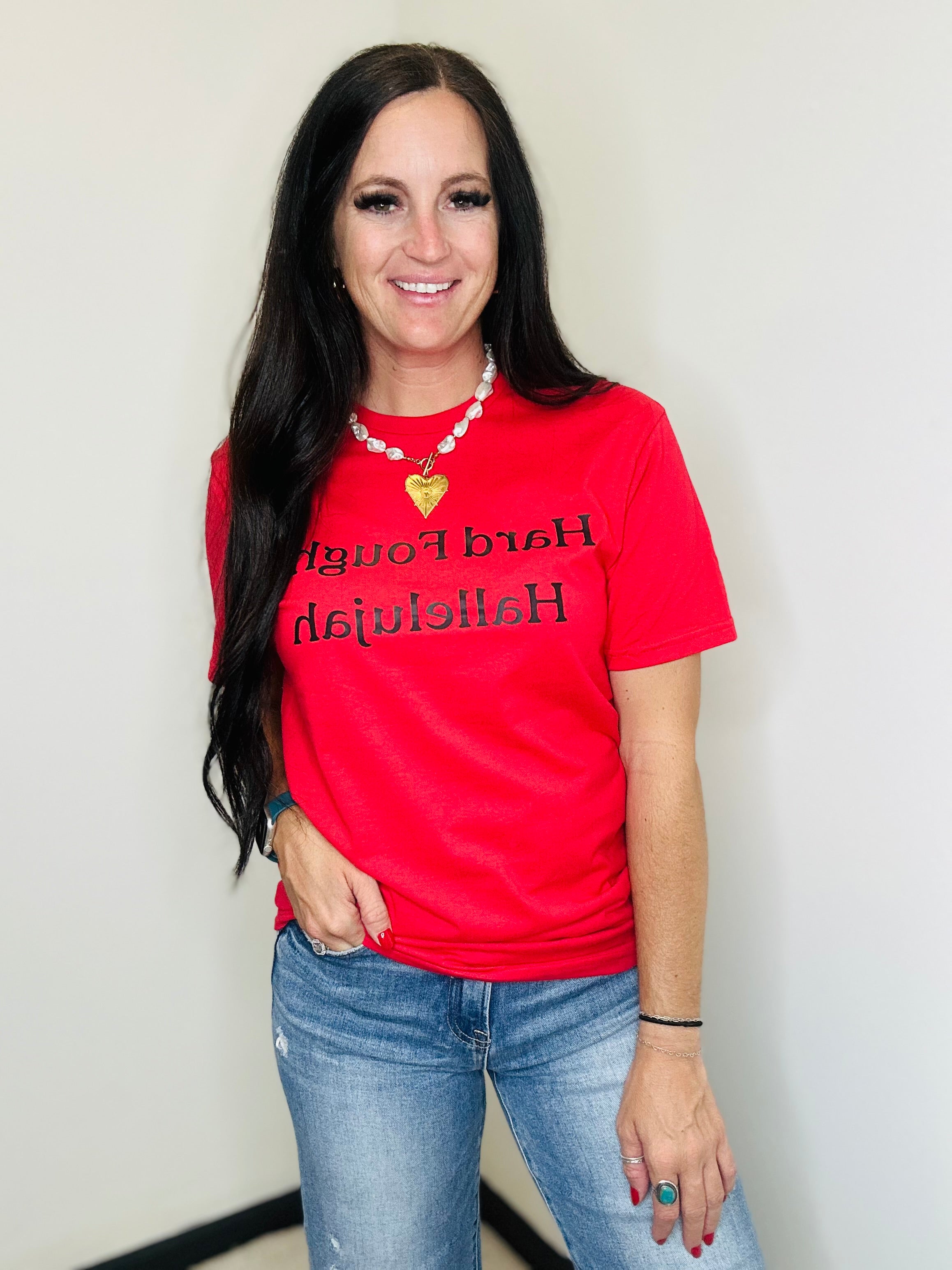 Women's Red Short Sleeve Crew Neck "Hard Fought Hallelujah" Graphic T-shirt