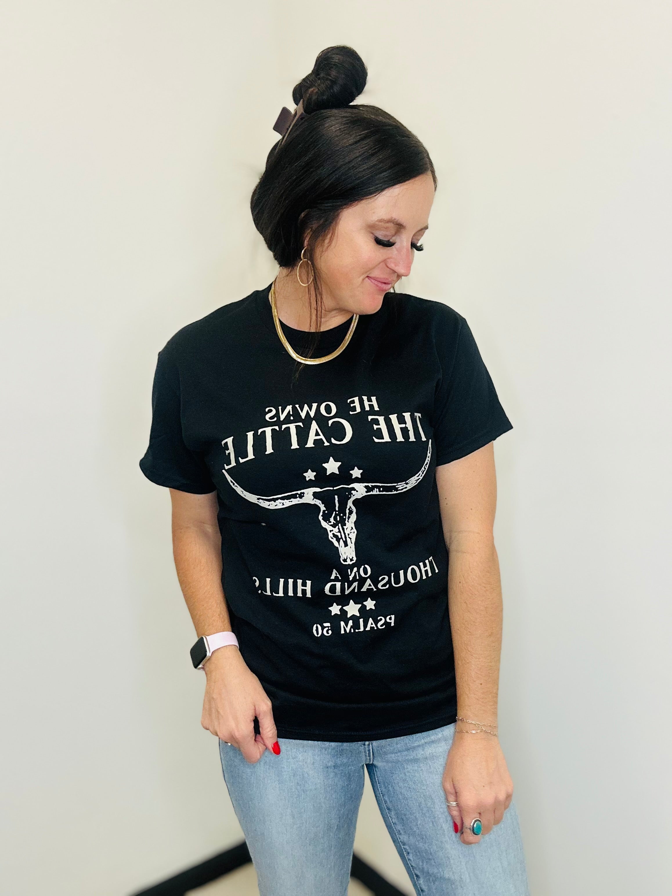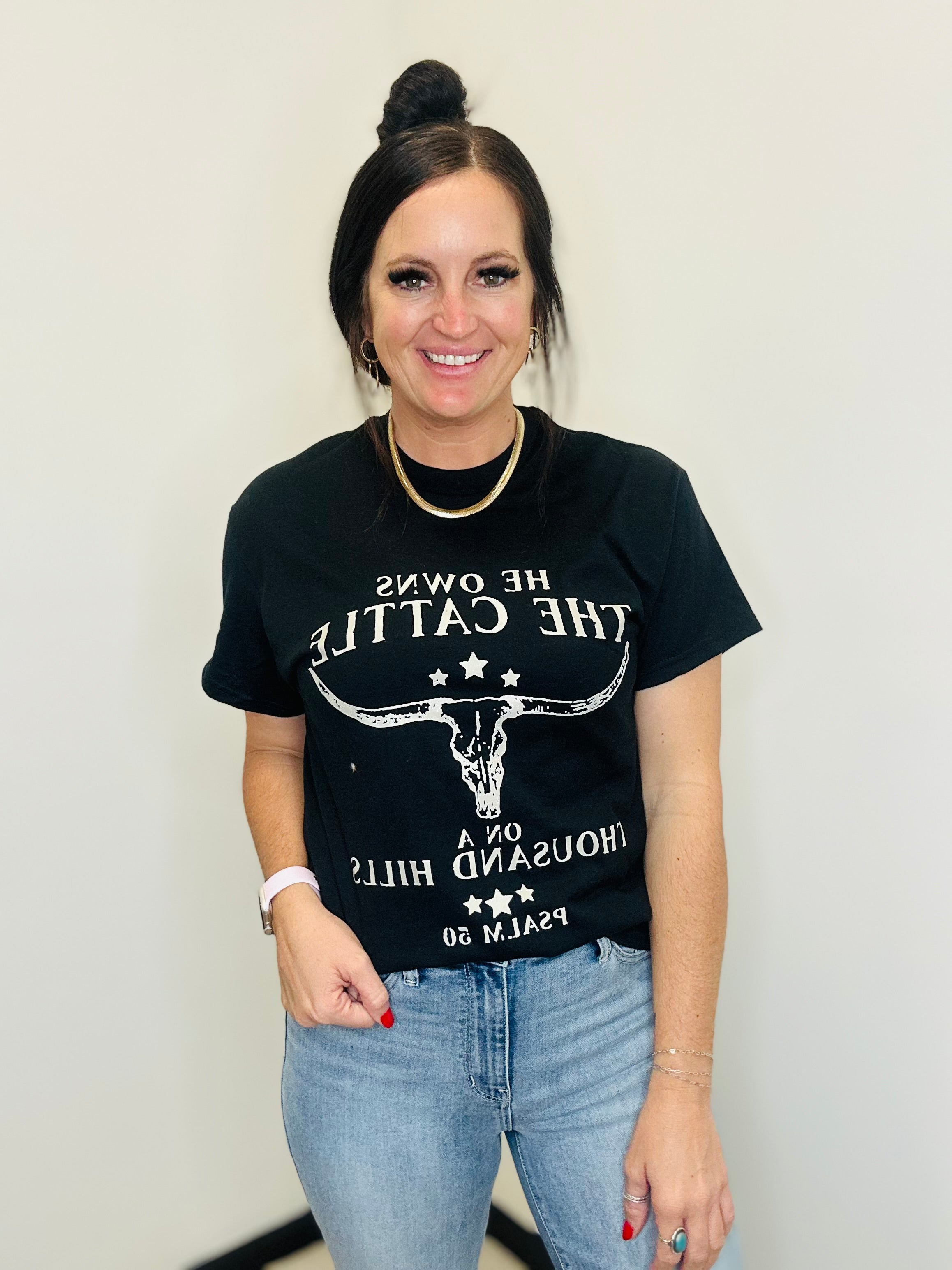 He Owns The Cattle on a Thousand Hills - the perfect way to combine your passion for faith with western fashion. We are in love with the western style graphic printed on a crew neck tee. This t-shirt is not just a piece of clothing; it's a statement of your faith and your unique style. Wear it proudly and inspire others with its powerful message.