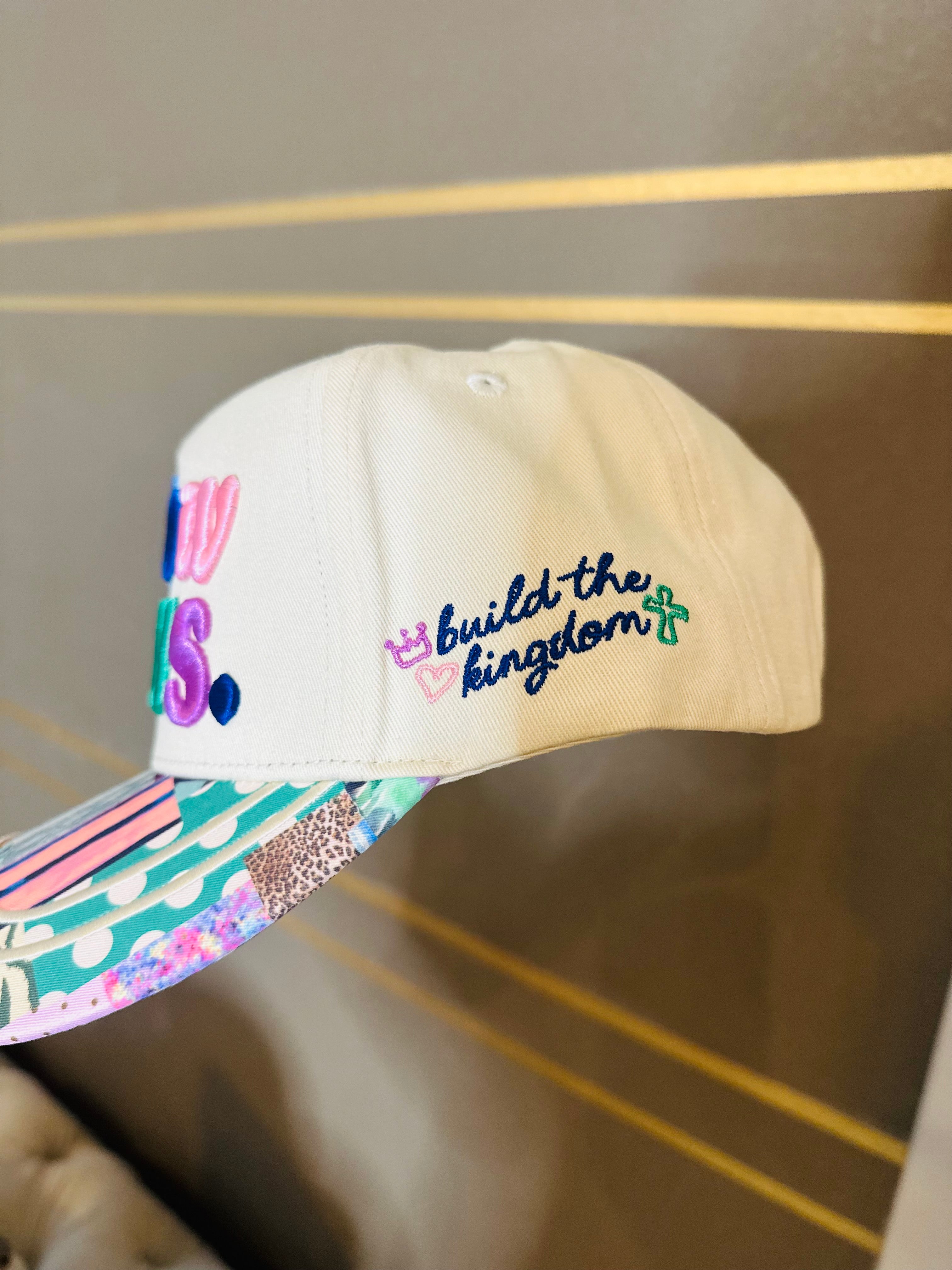 Faith meets fun in our follow Jesus Trucker Hat. This canvas-style cap features bold puff-stitch embroidery on the front and "build the kingdom" delicately stitched on the side as a daily reminder to trust big and dream bigger. The colorful patchwork bill and playful embroidered symbols add a vibrant, uplifting touch, while the adjustable snapback ensures the perfect fit. Whether you’re headed to the ball field, running errands, or just out spreading positivity, this hat adds meaning and style to every outfit.
