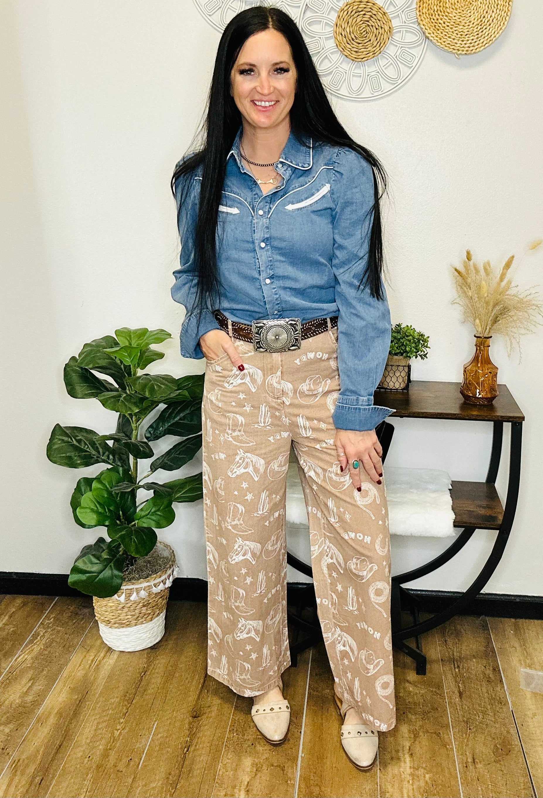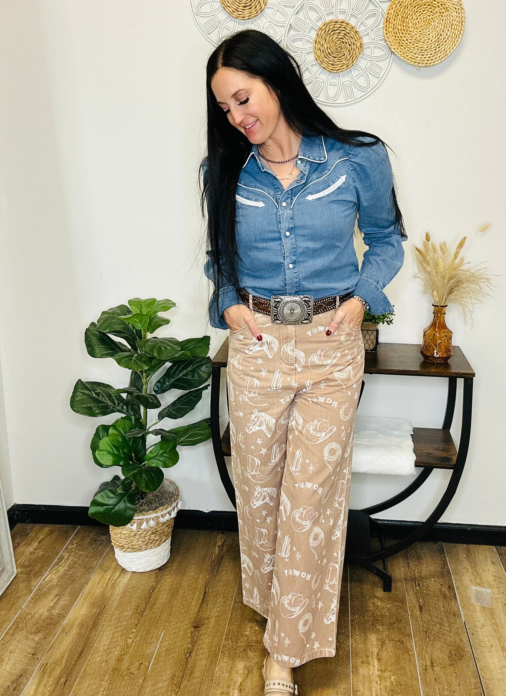 A true western classic—made softer, cuter, and ready for everyday wear. The Diamond Denim Blouse features that timeless pearl-snap look we all adore, paired with cream western yokes that instantly elevate the whole vibe. The soft denim fabric makes it an easy all-day piece, and the tailored-yet-relaxed silhouette keeps you looking put together without feeling restricted. Pair it with trousers, a great pair of boots, or your favorite wide-leg denim for that effortless western-chic style.
