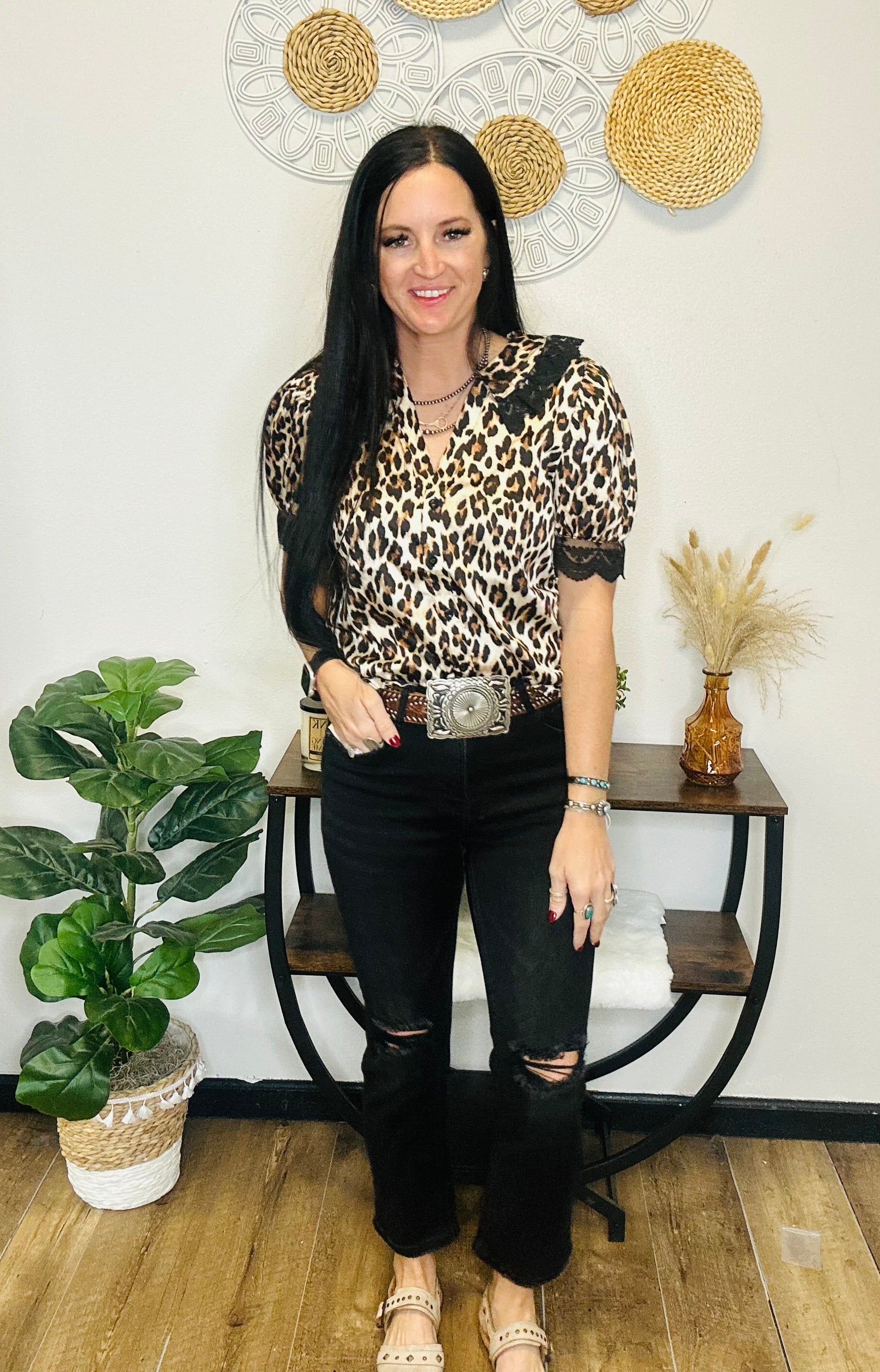 A little wild, a little romantic—this blouse brings all the charm. The Gretchen Top pairs a timeless leopard print with delicate black lace trim for a look that’s equal parts flirty and classy. The puff sleeves add that soft, feminine touch while the V-neckline keeps it flattering and easy to style. Dress it up with dark denim and boots for date night or tuck it into a skirt for a polished, western-chic vibe.