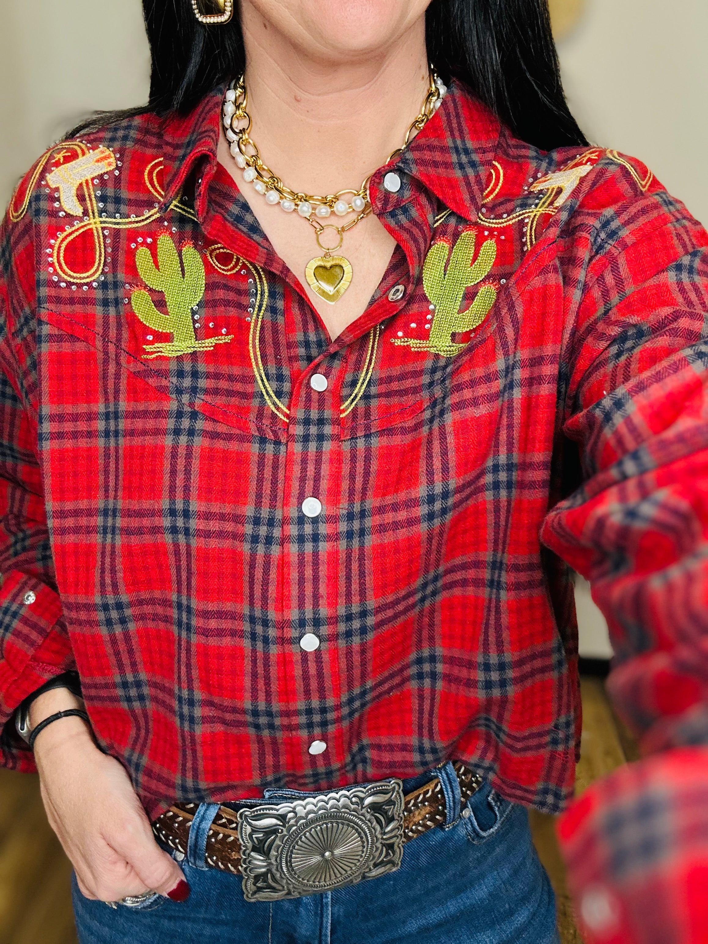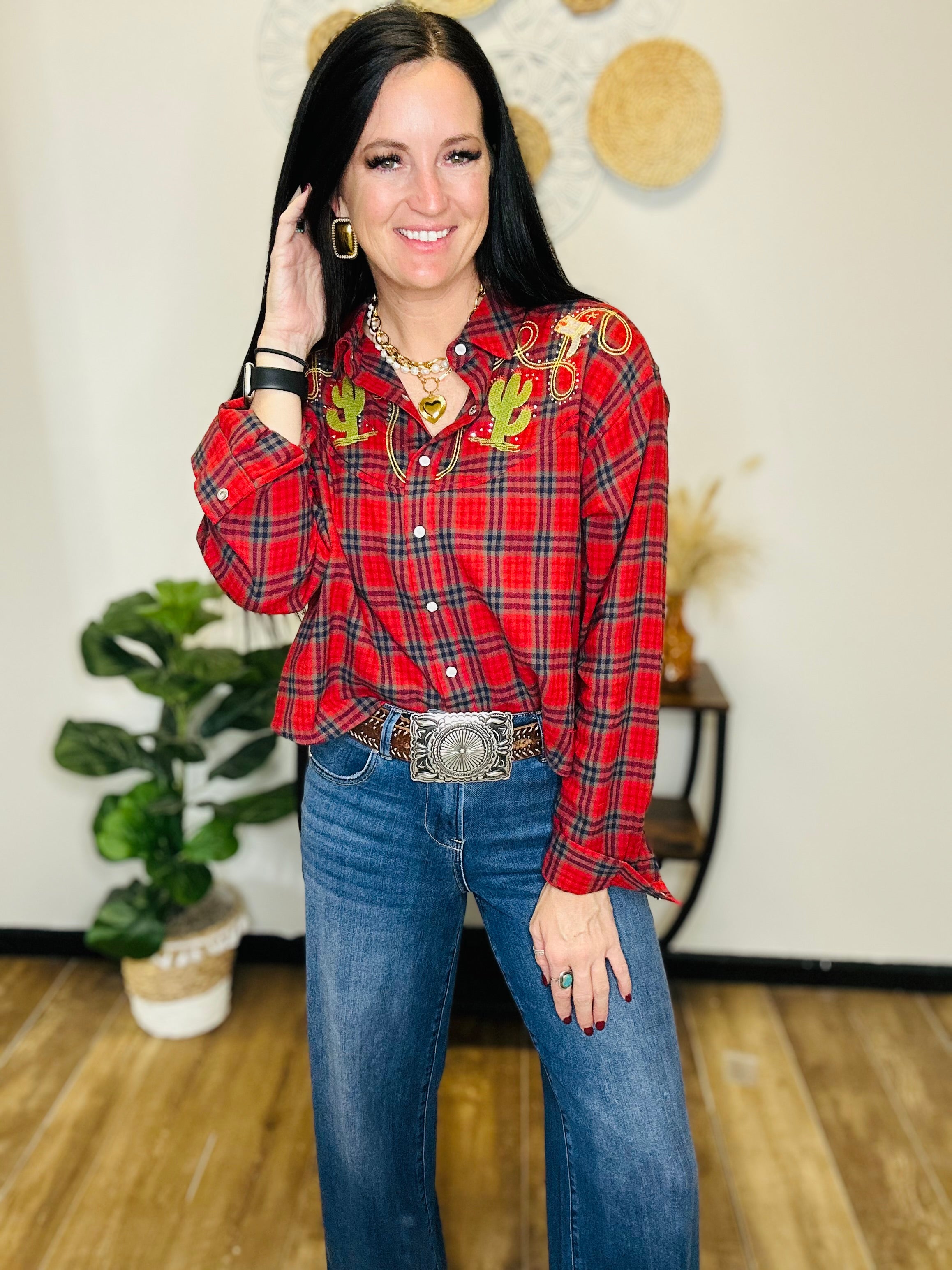 Western charm meets everyday comfort in the cutest way. The Josie Blouse brings that classic red plaid we all love and pairs it with bold embroidered yokes for a true cowgirl statement. Soft to the touch with a relaxed fit, this pearl snap beauty gives you that easy, lived-in feel while still keeping things stylish and put together. Pair it with denim and boots and you’re rodeo-ready in seconds.