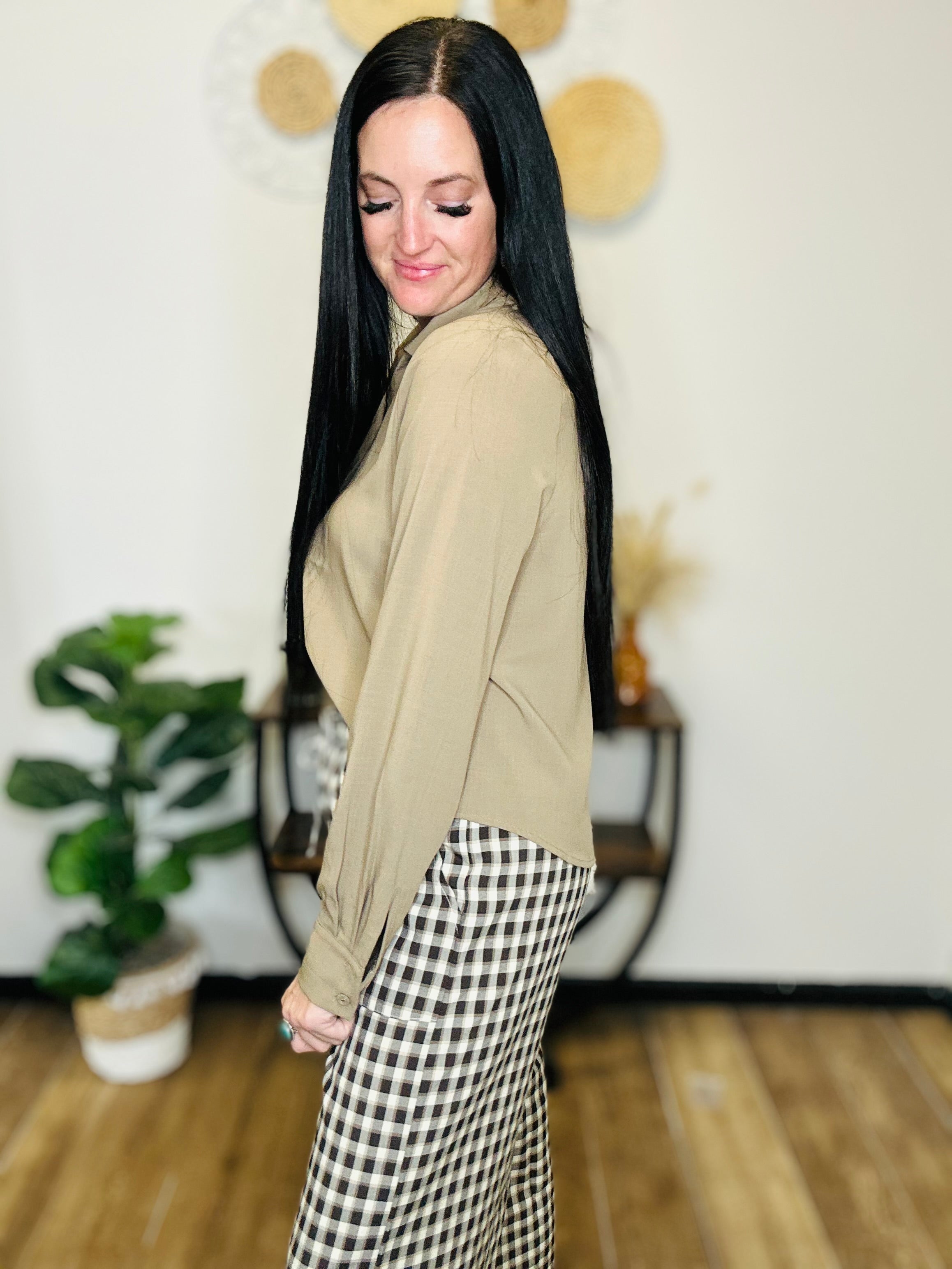 Women's Long Sleeve Mocha V Neck Button Front Basic Blouse