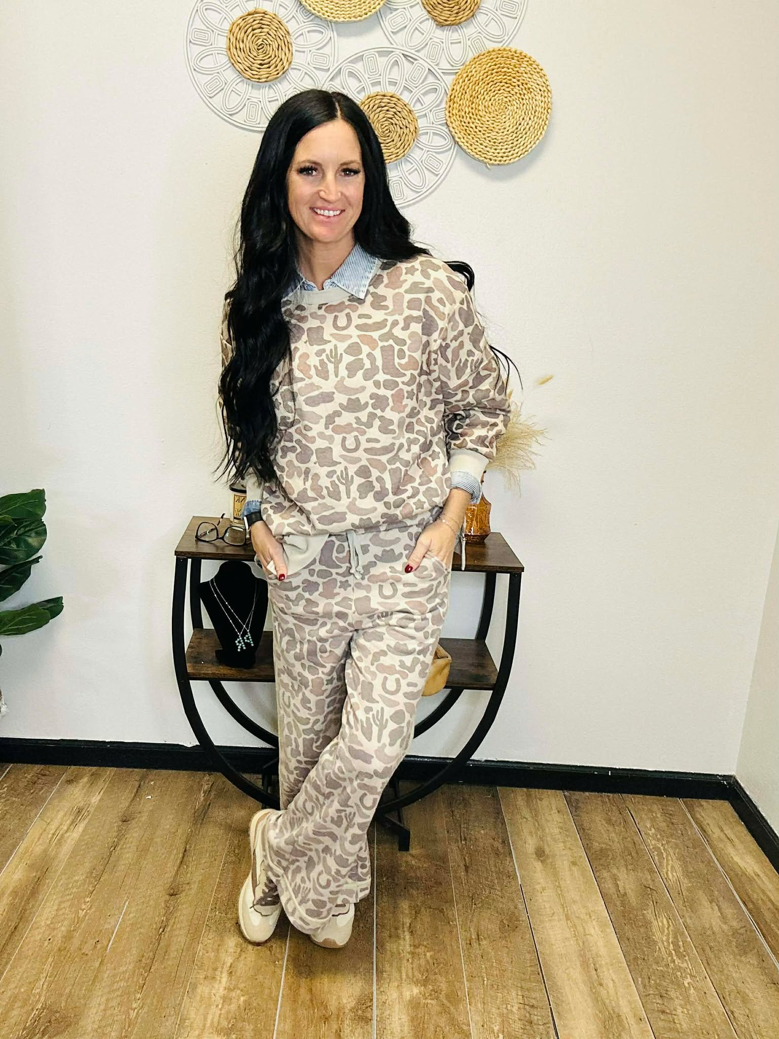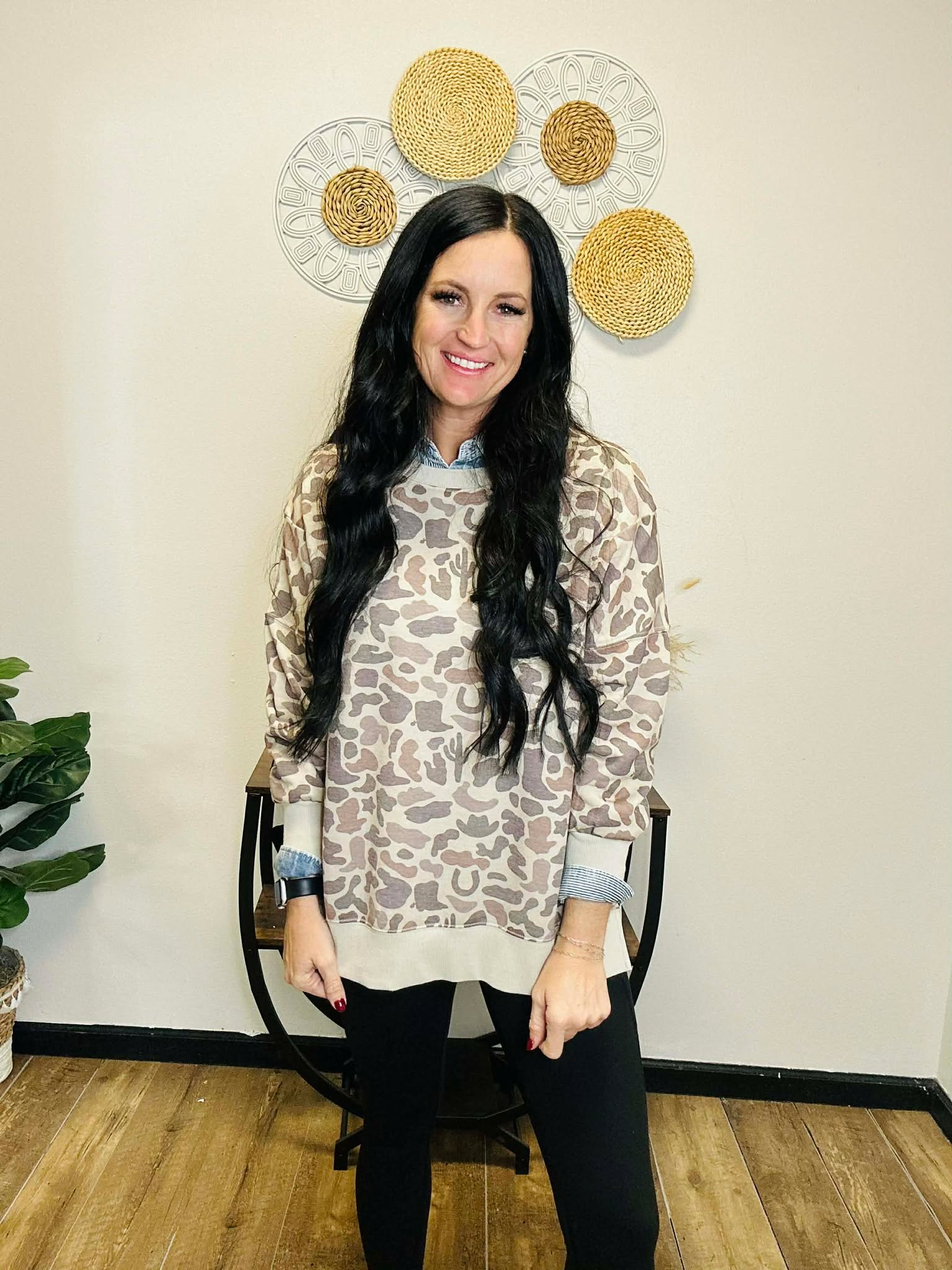 Wendy is that throw-on-and-go sweatshirt that still looks like you tried. This relaxed, oversized camo pullover has a fun western twist—look close and you’ll spot cactus, cowboy hats, and horseshoes hidden in the print. Vented sides and ribbed trim keep it comfy and flattering, whether you’re running kids to practice, headed to the rodeo, or just cozying up at home with leggings and boots.