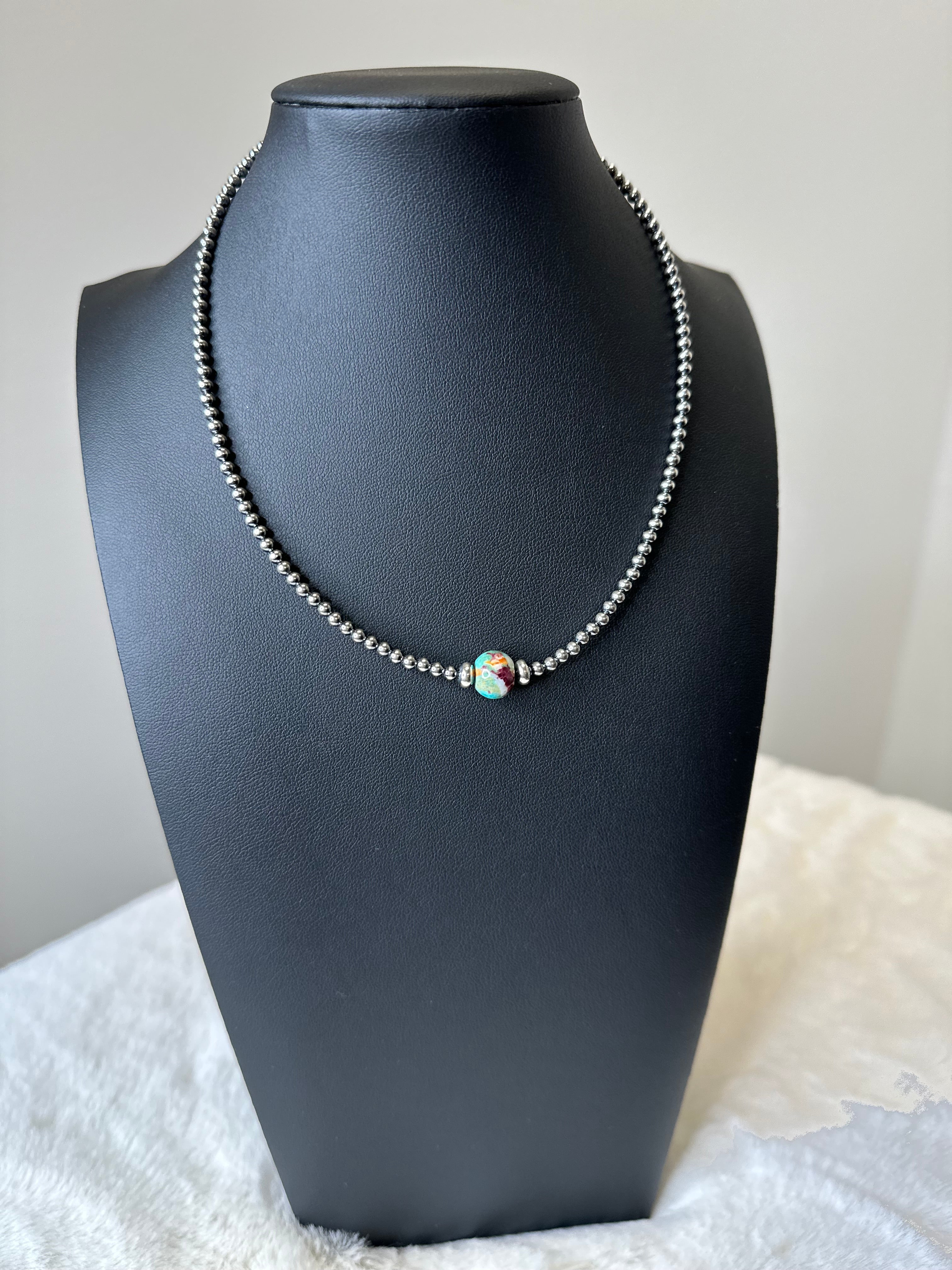 Crafted from genuine Sterling Silver .925, this necklace shines with quality and character. The design features a delicate strand of 3mm beads that build to a unique accent, with two 5mm saucer beads framing a magnificent Spiny Oyster Pearl This graduated pattern creates a dynamic and eye-catching flow that stands out on its own or perfectly complements your other beaded necklaces. The secure sterling silver lobster clasp ensures it stays put, whether you're at the rodeo or out for a night on the town.