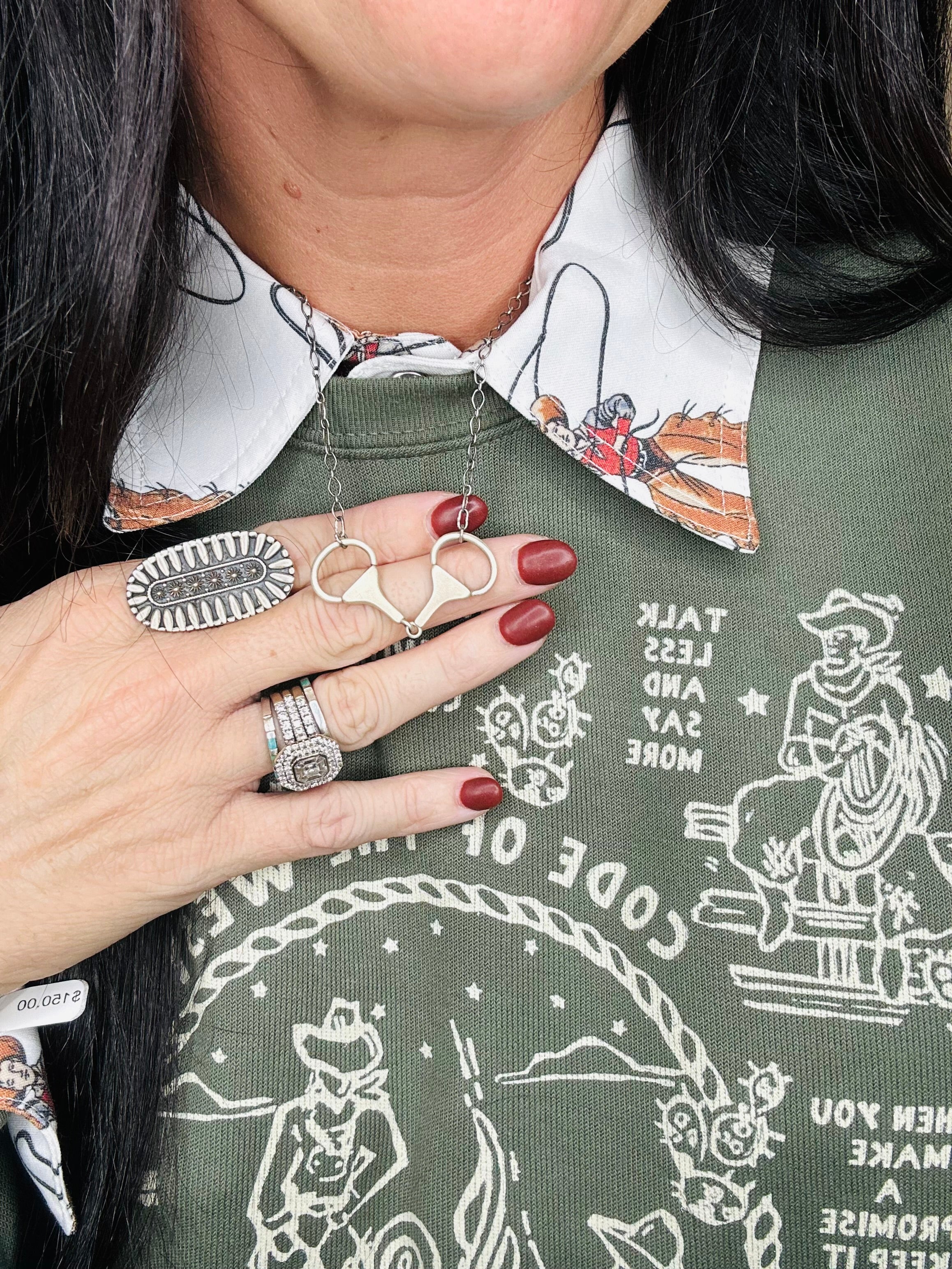 The Bandera Necklace is where western tradition meets timeless beauty. Handcrafted from genuine sterling silver, this piece features an authentic snaffle bit design that’s both bold and beautifully refined. It’s one of those pieces that feels classic yet meaningful — the kind you’ll reach for every day, whether you’re headed to the barn, a night out, or anywhere in between.