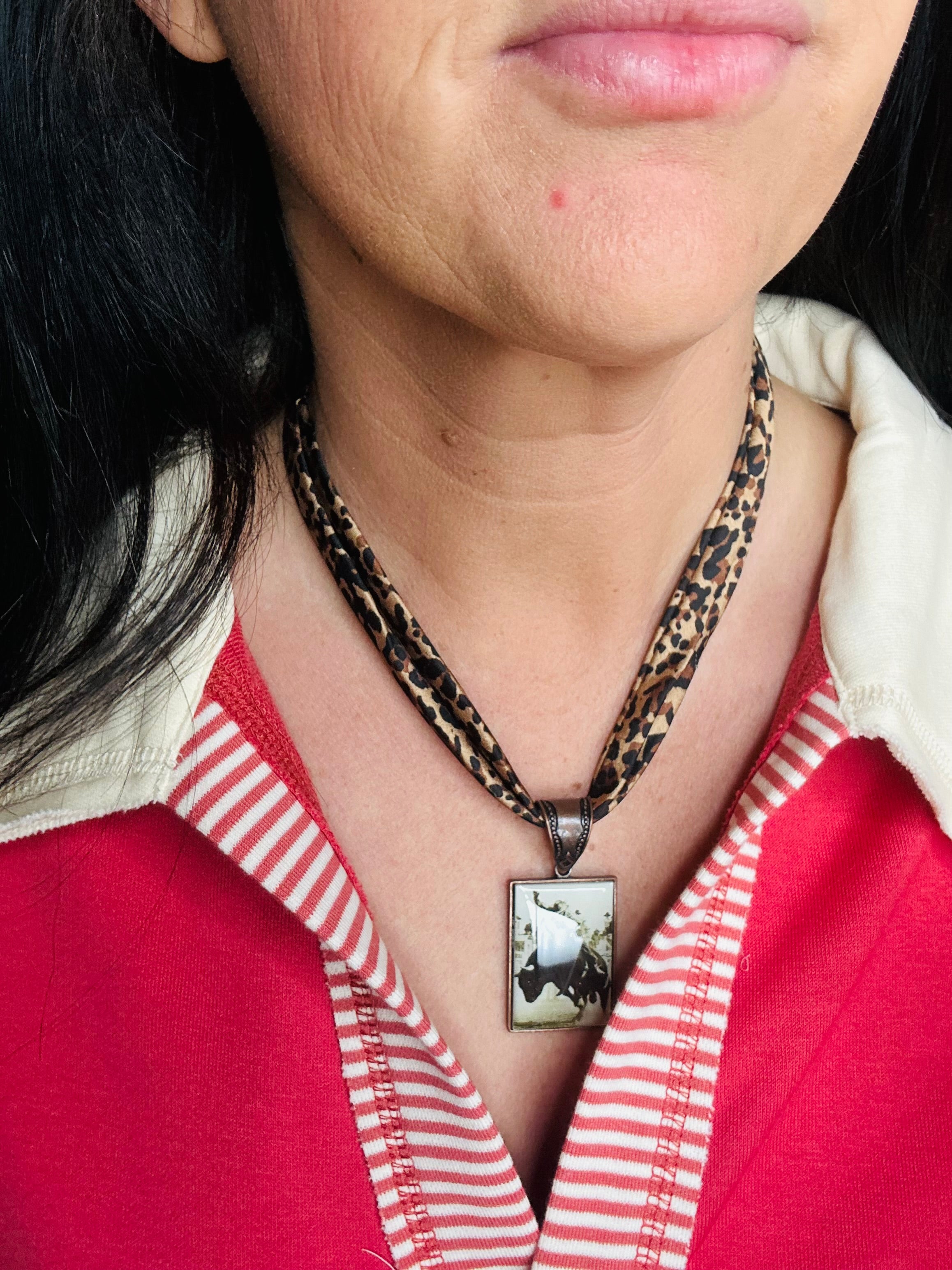 Leopard Scarf Necklace with Vintage Bull Rider Cowboy Pendant
