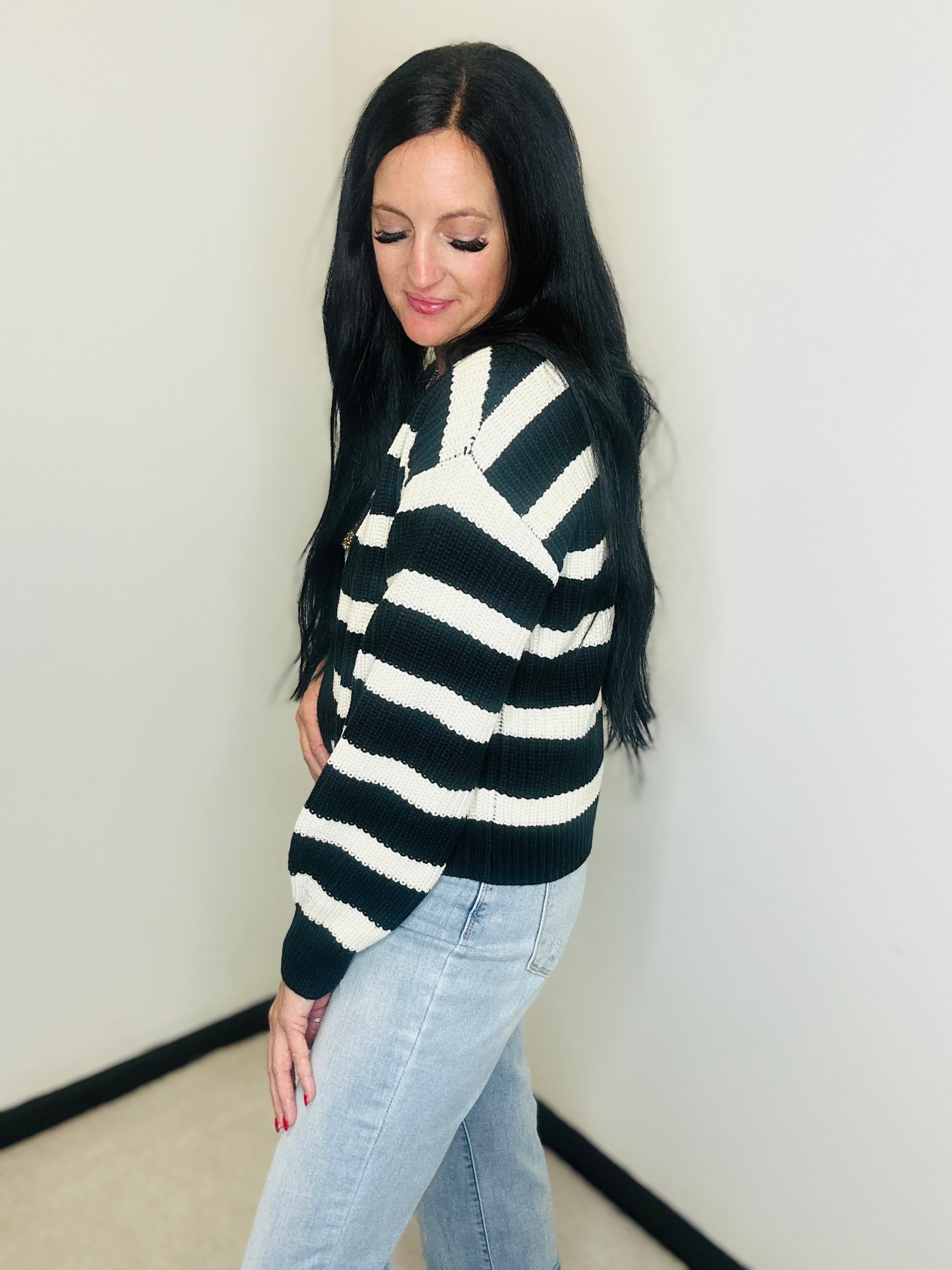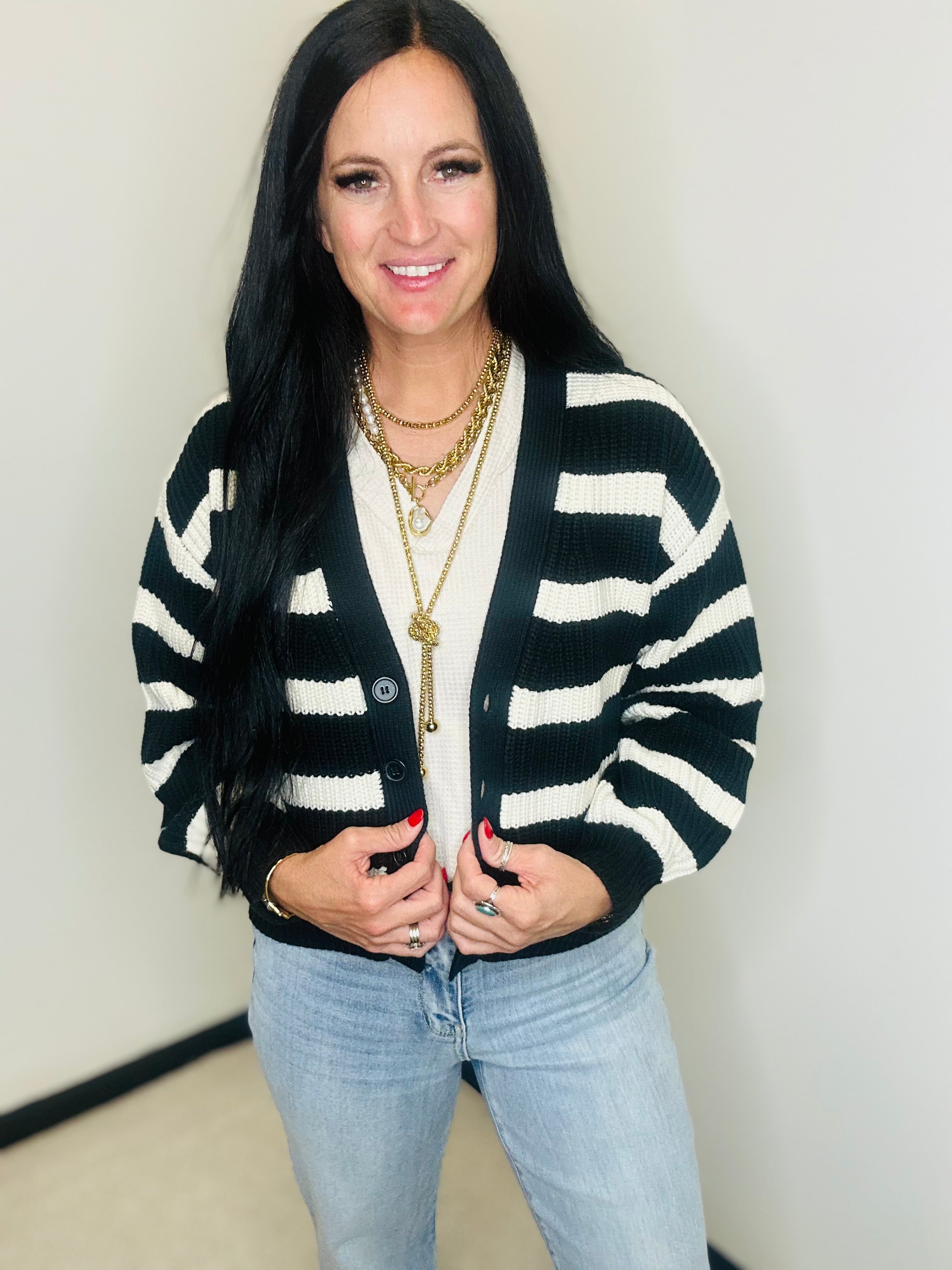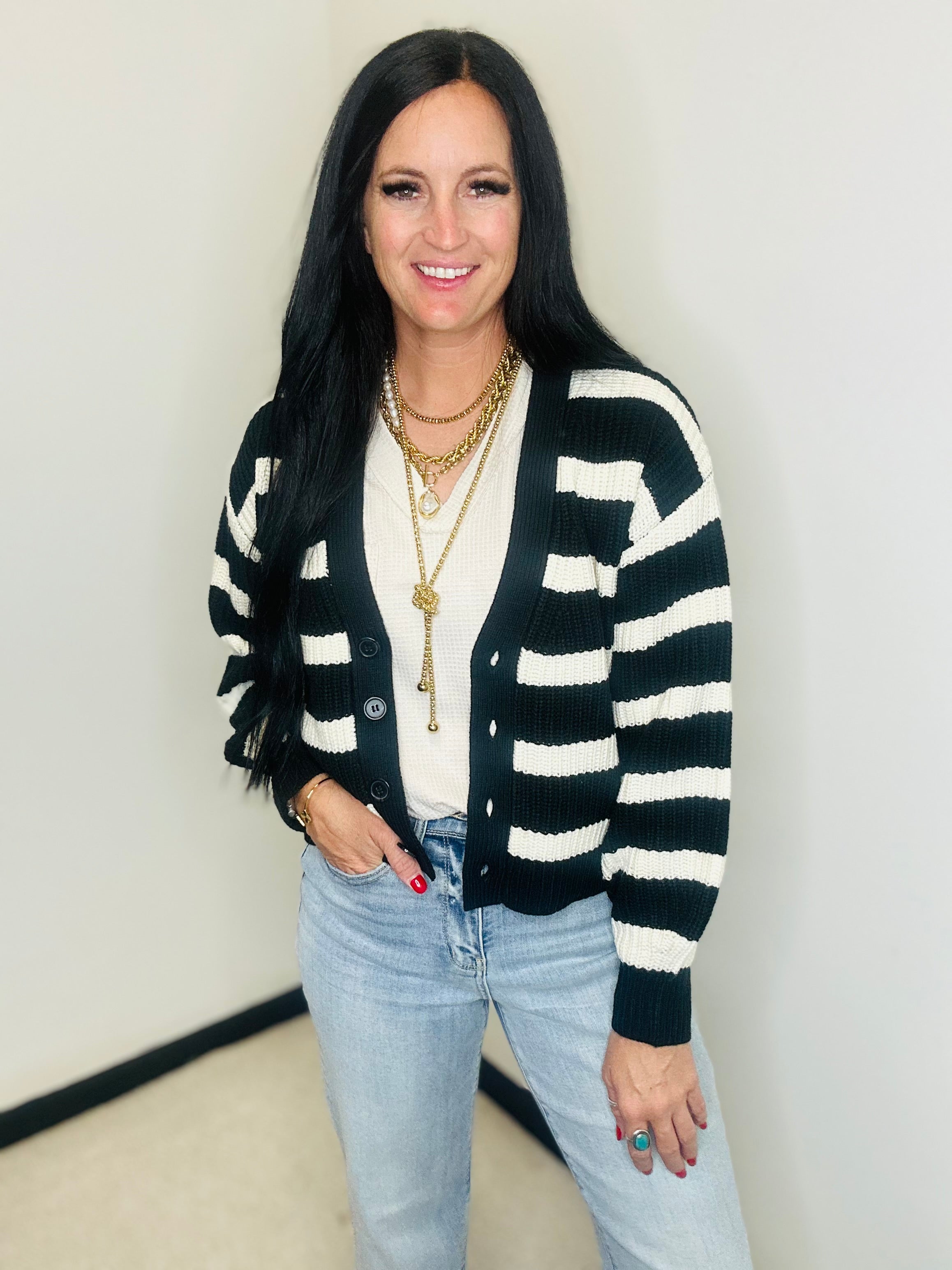Classic stripes meet cozy comfort in our Black & White Striped Button Front Sweater Cardigan. This timeless piece is the perfect layering essential—whether you’re tossing it on over a tee for a casual coffee run or dressing it up with denim and boots for a polished everyday look.