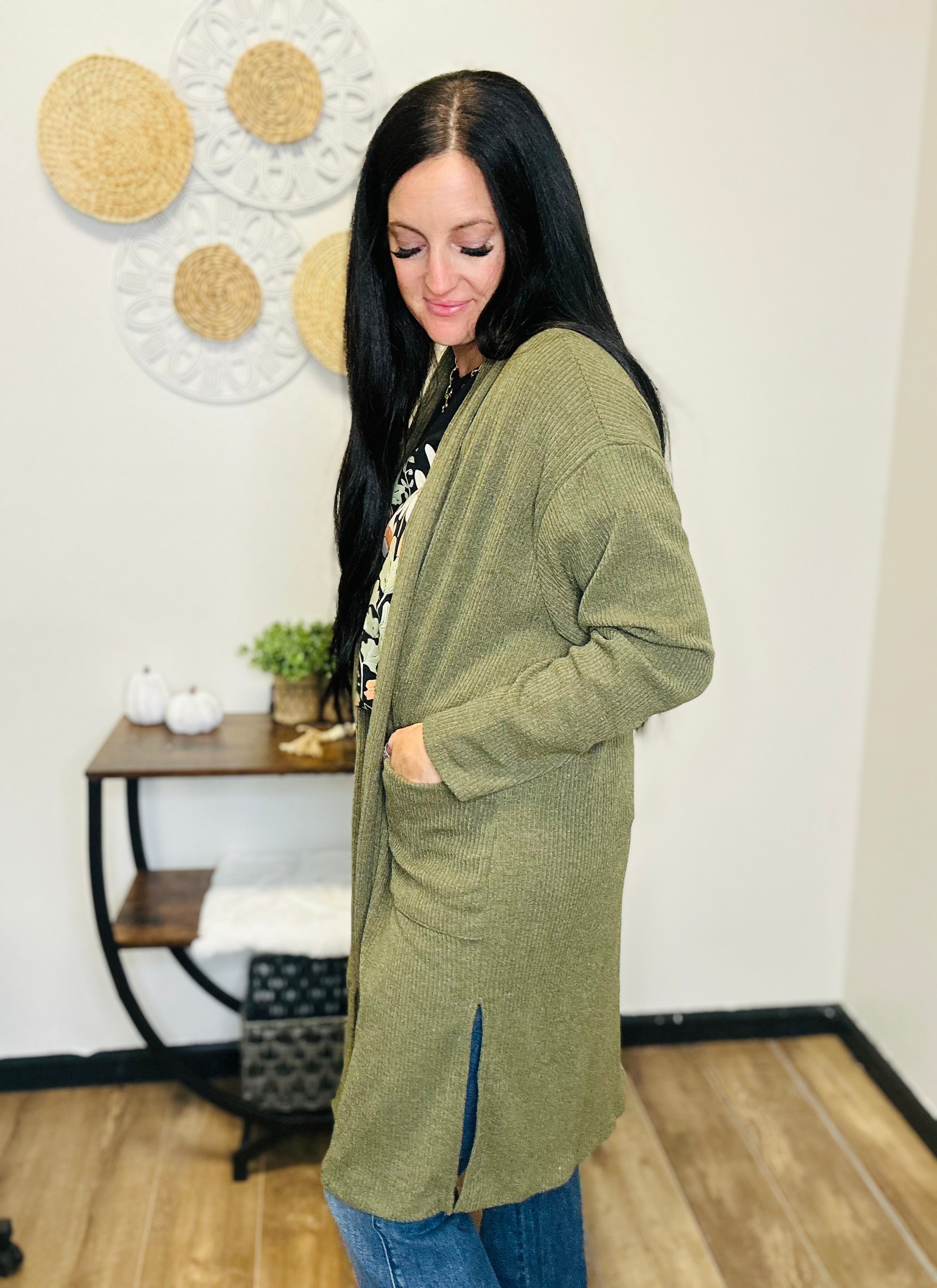 Meet the layering piece you’ll reach for on repeat. Our Jordan Open Front Cardigan in olive is the perfect mix of cozy and effortless. Designed in a soft ribbed knit, this cardigan features a relaxed fit with drop shoulders for that laid-back vibe we all love.