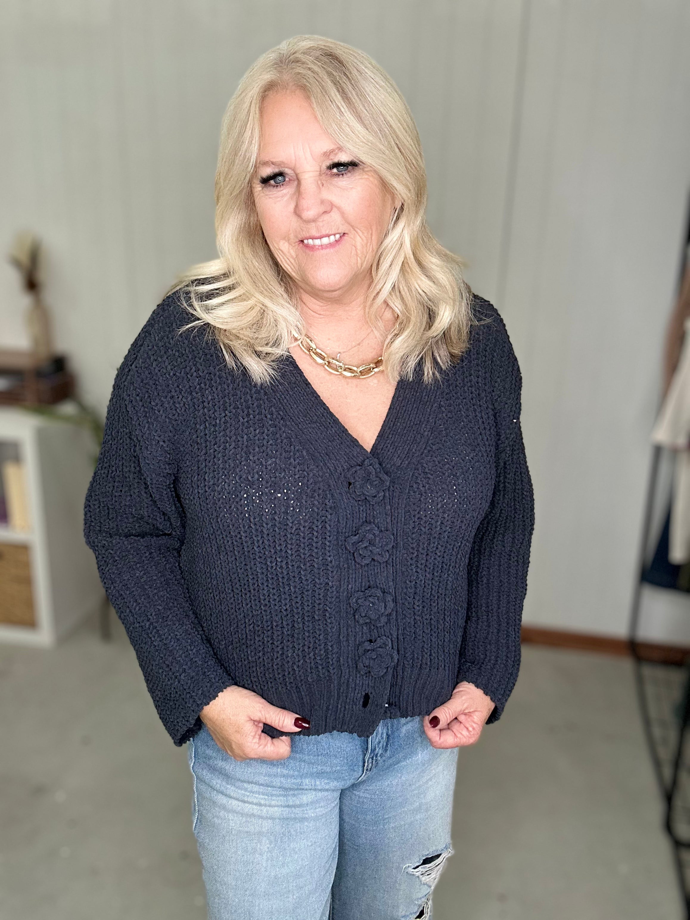 Cozy, oversized, and full of charm—The Cher is the cardigan you’ll be reaching for all season long. This waist-length beauty in a deep charcoal hue features a chunky cable knit design that brings texture and warmth to every outfit. The relaxed drop-shoulder fit makes it effortless to layer, while the crochet rosette-style buttons add the sweetest feminine touch. Whether you’re tossing it on over a tee and denim or styling it with your favorite dress, this oversized cardigan is the perfect blend of cozy and chic.