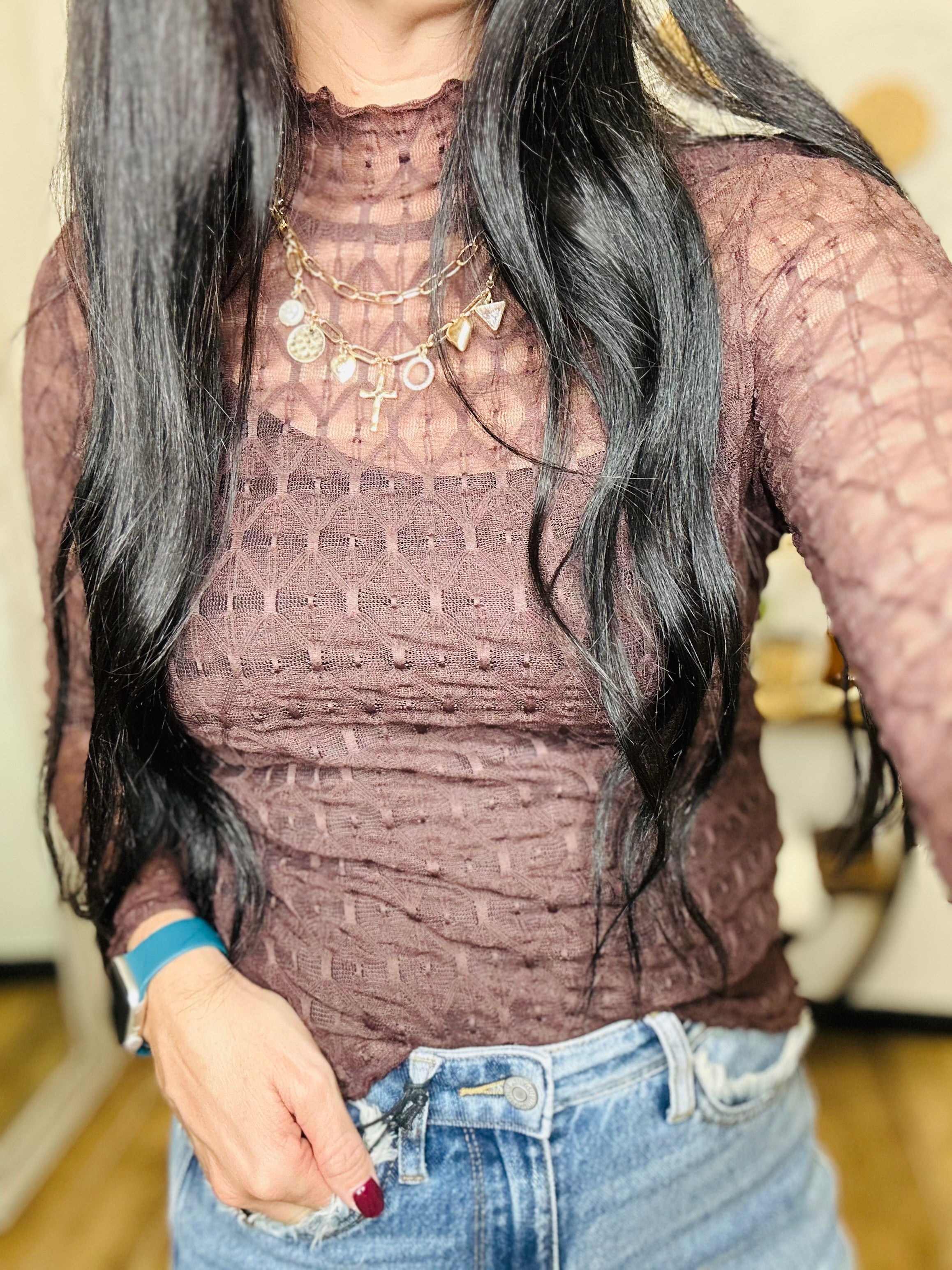 The CoCo Mesh Top is where edgy meets feminine. Designed in a sheer coffee-brown patterned mesh, this slim-fit top is the ultimate layering piece for every season. The delicate lettuce trim and mock neck detail give it just the right amount of sophistication, while the lightweight fabric makes it perfect for styling under a blazer, sweater, or your favorite graphic tee. Whether you dress it up or keep it casual, this versatile piece will instantly elevate your look.