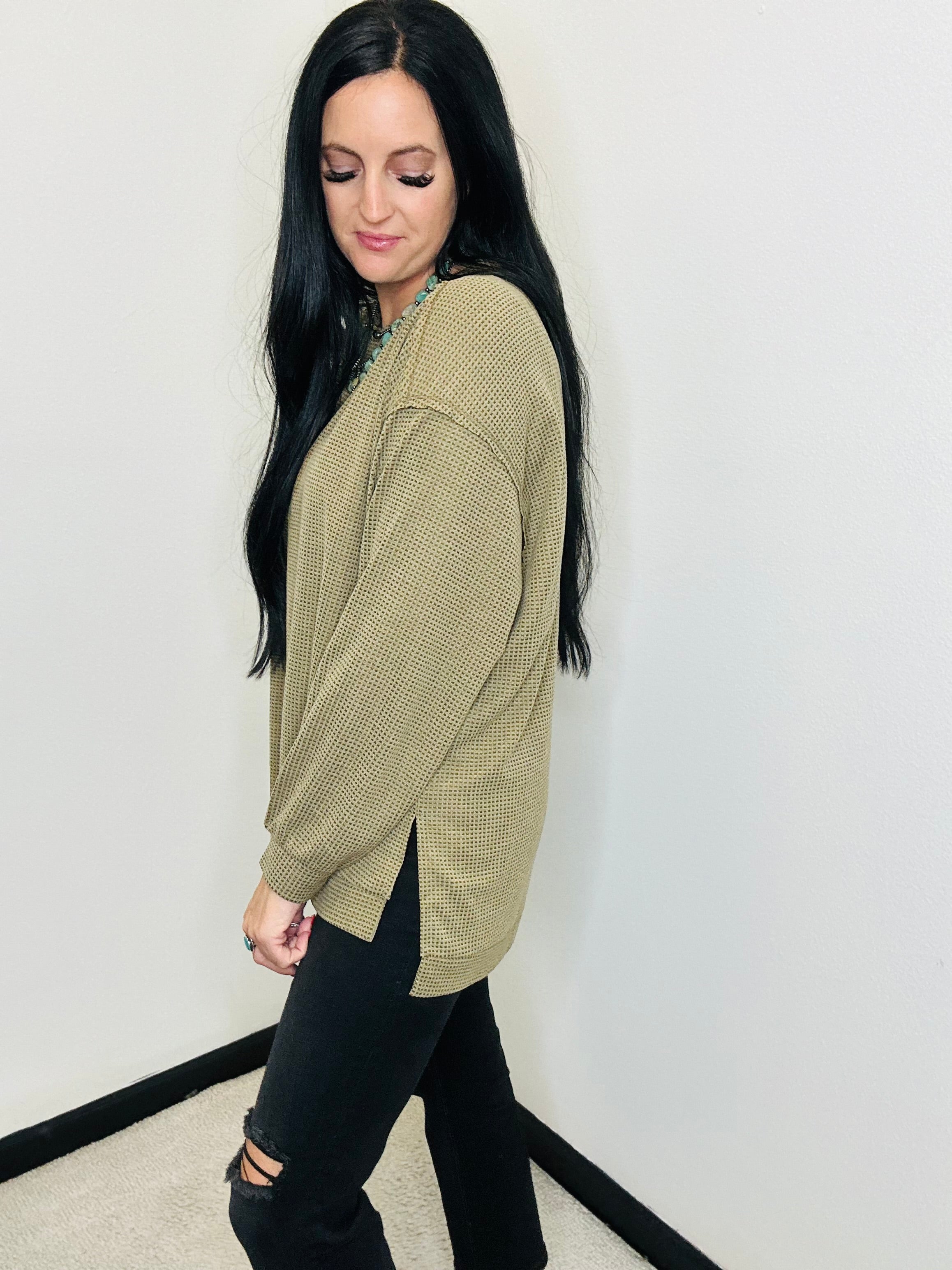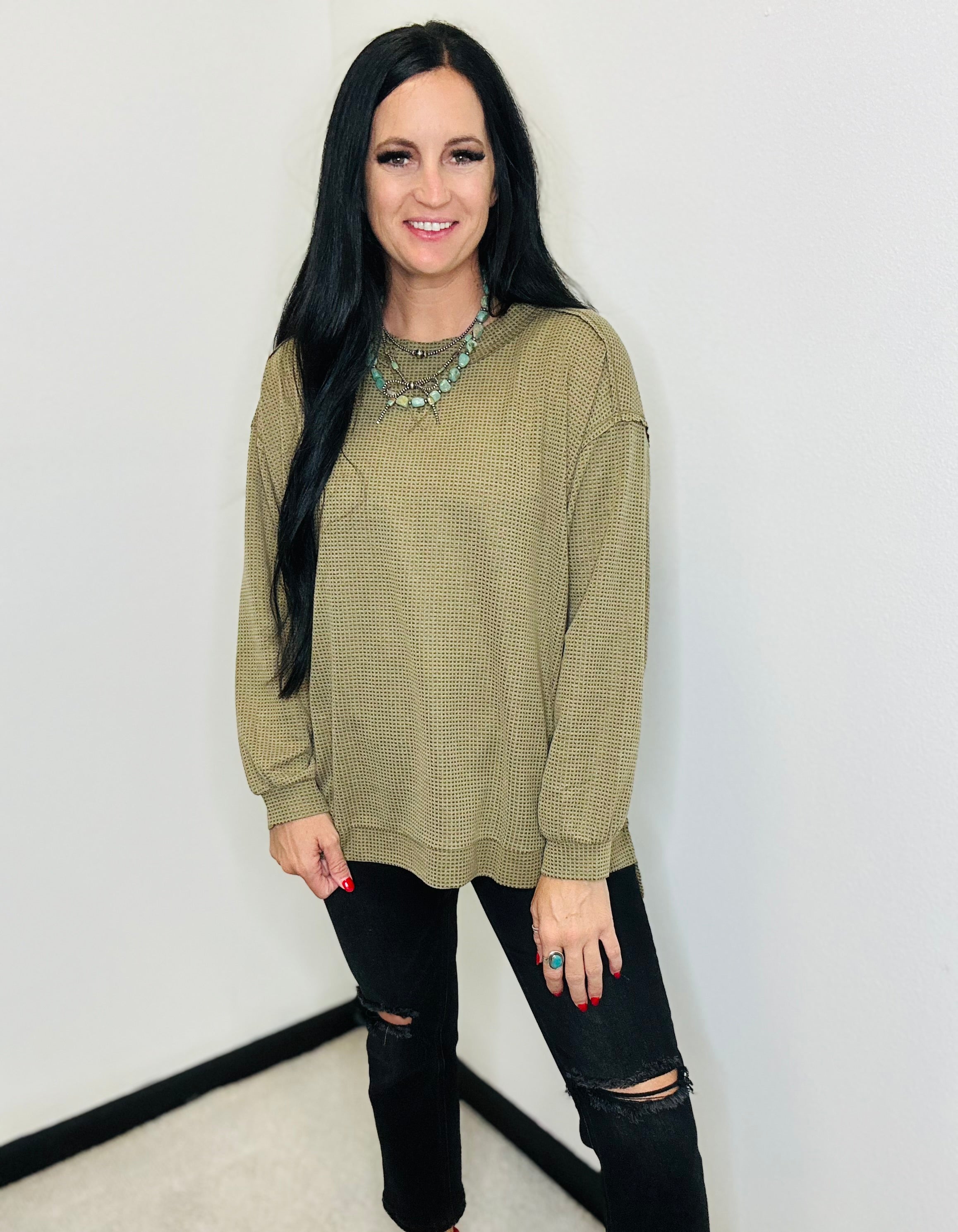 Oversized Long Sleeve Waffle Knit Top in Olive - Noel