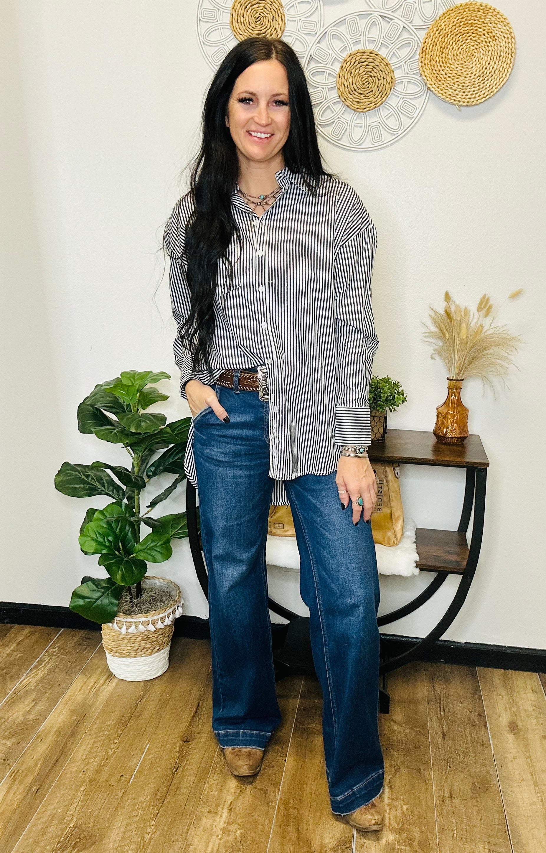 Classic meets cool with our Staci Oversized Button Down Blouse, the perfect piece to take you from day to night with effortless Motis style. Crafted from 100% cotton, this lightweight blouse features a timeless navy stripe pattern and a relaxed high-low fit that gives you that easy, put-together look. The collared neckline and front pocket add a polished touch, while the oversized silhouette keeps things casual and comfortable. Whether you’re layering it under a vest, pairing with denim, or knotting it at the waist, Staci is your go-to for that blend of everyday chic and western charm.