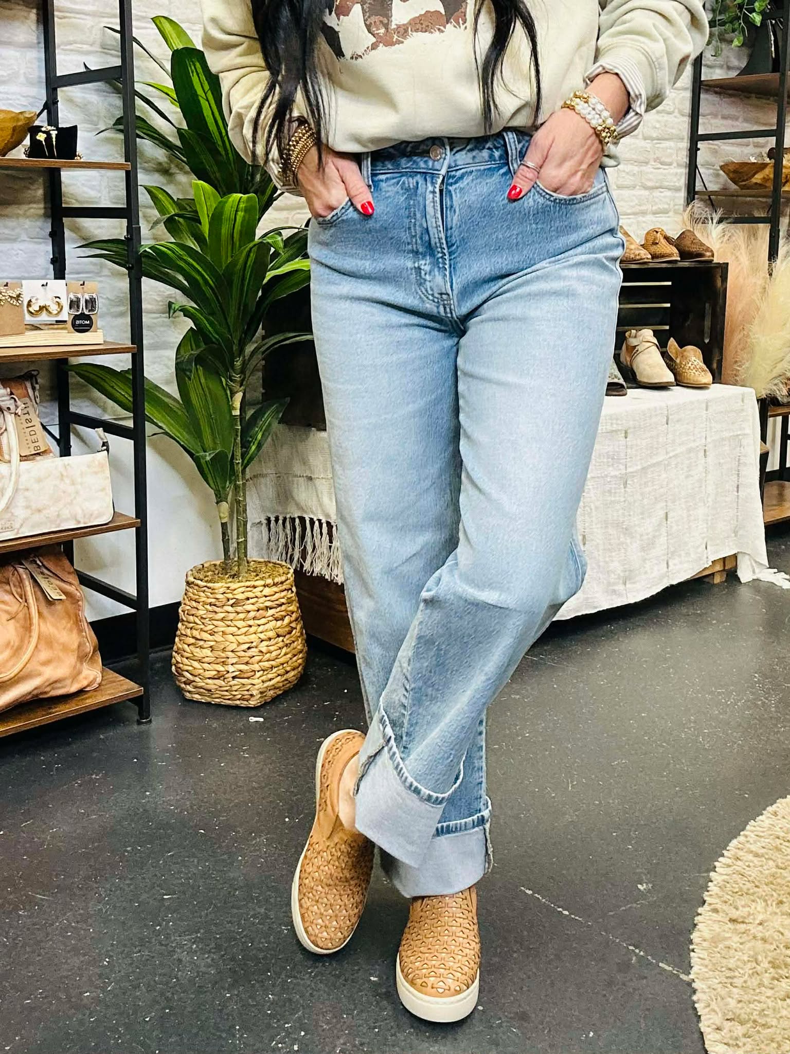 The Arlis High Rise Wide Leg Cuffed Jeans give you that flattering high-rise fit with a relaxed wide leg and bold wide cuff that makes the whole look feel intentional. The light wash keeps them fresh for spring and summer, while the structured denim holds its shape beautifully.