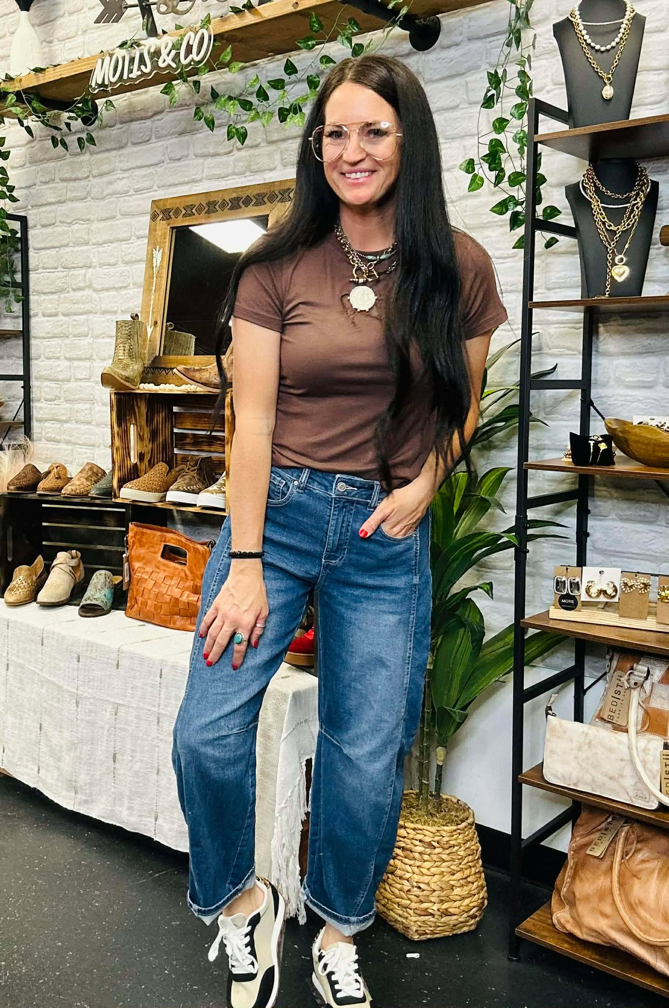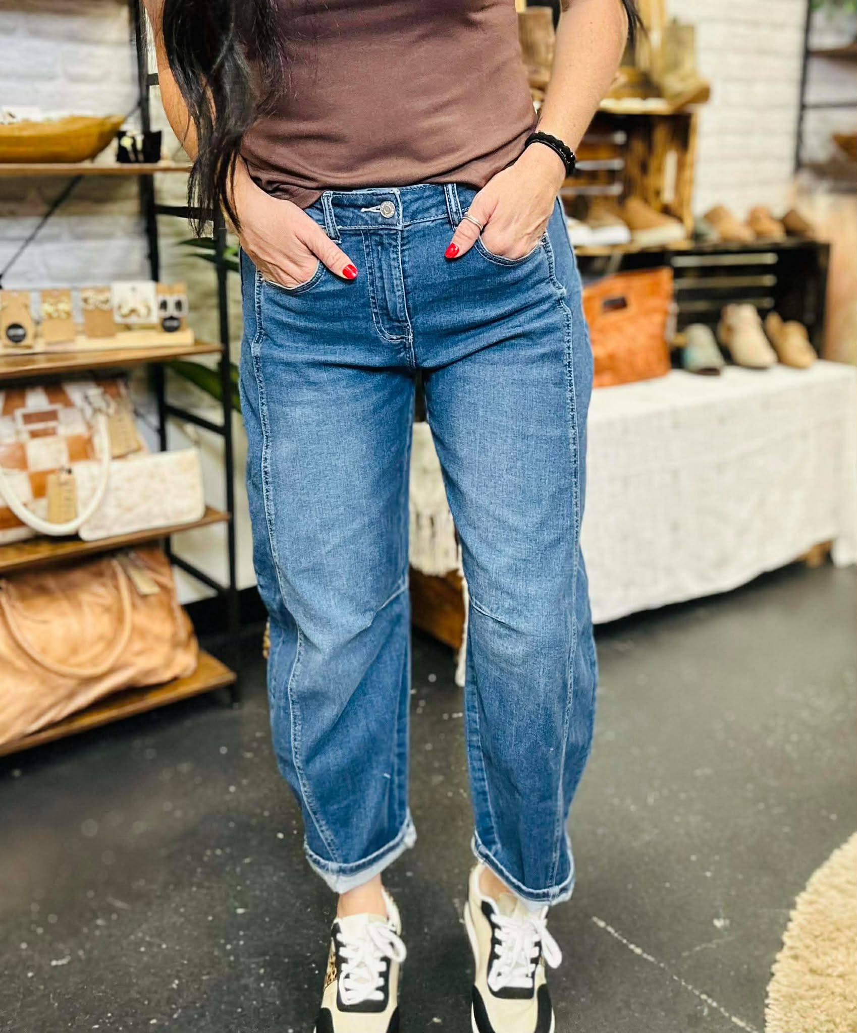 The Ben Cropped Barrel Jeans feature a flattering high rise with that subtle curved barrel leg that gives shape without feeling exaggerated. They’re modern, a little different, but still completely wearable. The medium wash keeps them versatile, and the cropped length makes them perfect for showing off your favorite boots, sneakers, or sandals.
