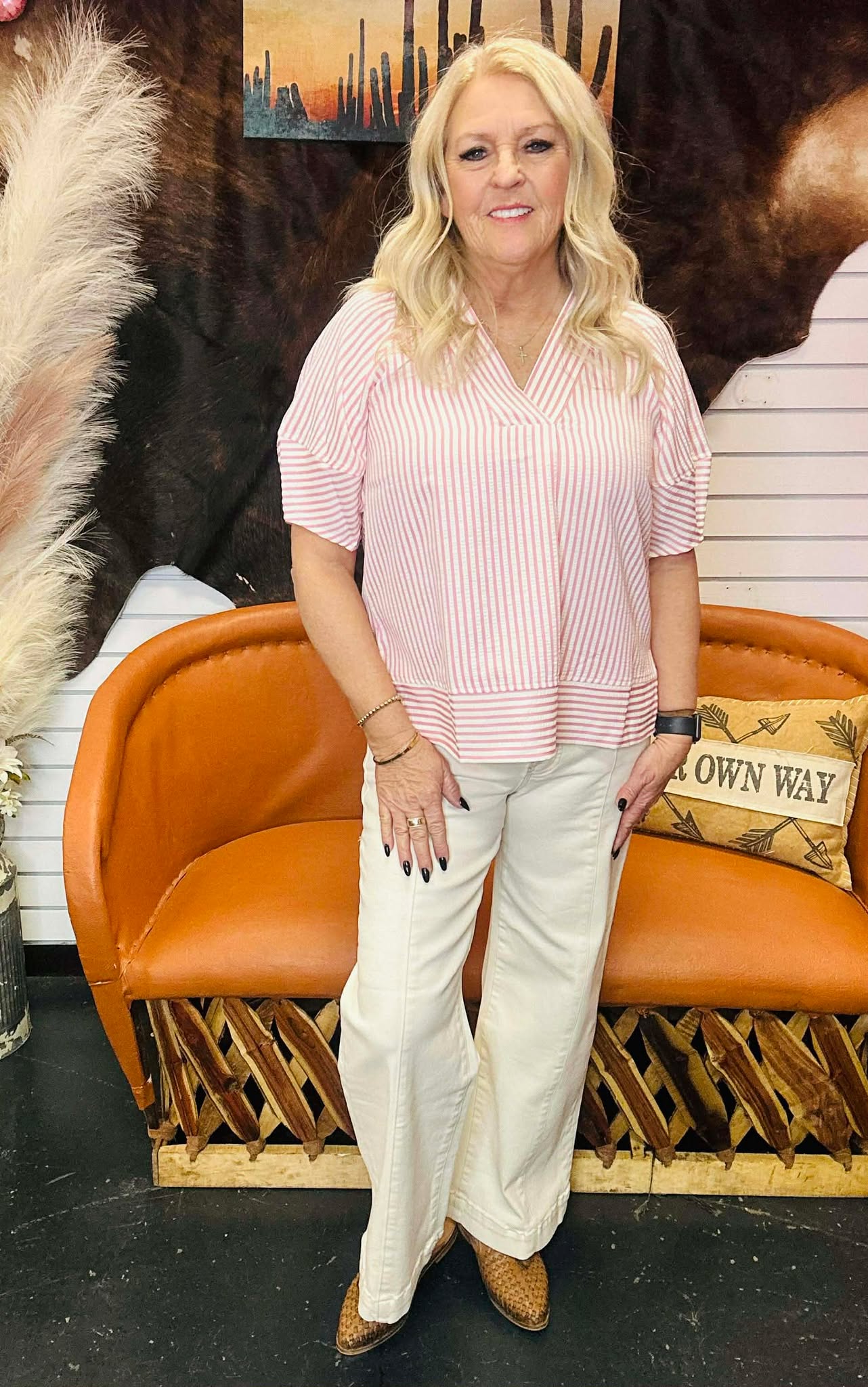 This is the kind of top that instantly brightens up your outfit. The Gracin Pink Striped Top features soft pink stripes with a flattering V-neckline and subtle puff sleeves that add just the right touch of charm. It’s sweet, easy, and perfect for that everyday girly country chic look we love.