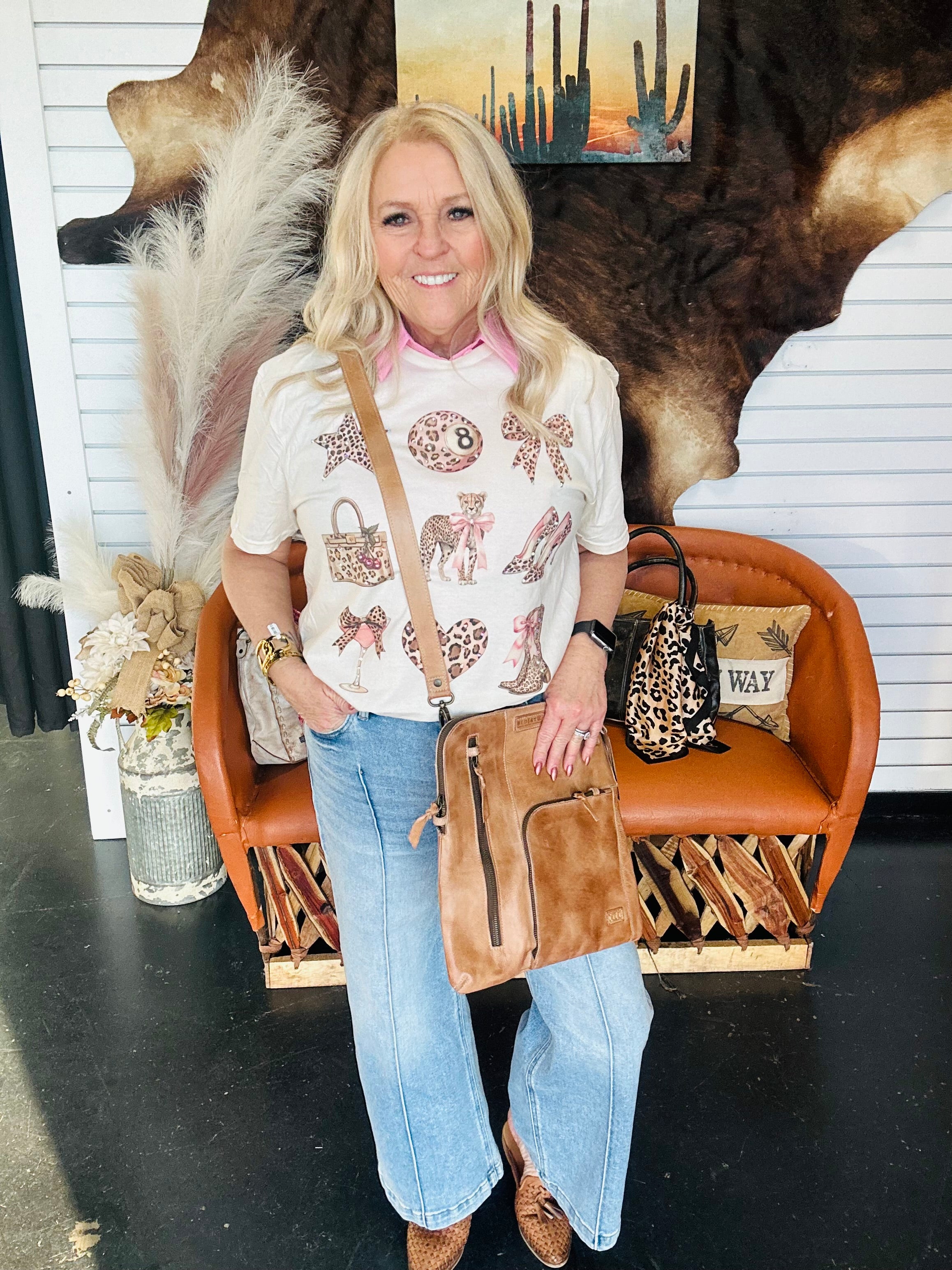 This tee is giving fun, feminine, and a little western sass — and we’re here for it. The Leopard Eight Ball Graphic Tee features a playful mix of leopard-print icons, soft pink accents, and subtle crystal details that add just the right touch of sparkle. It’s bold without being loud and fun without feeling overdone.