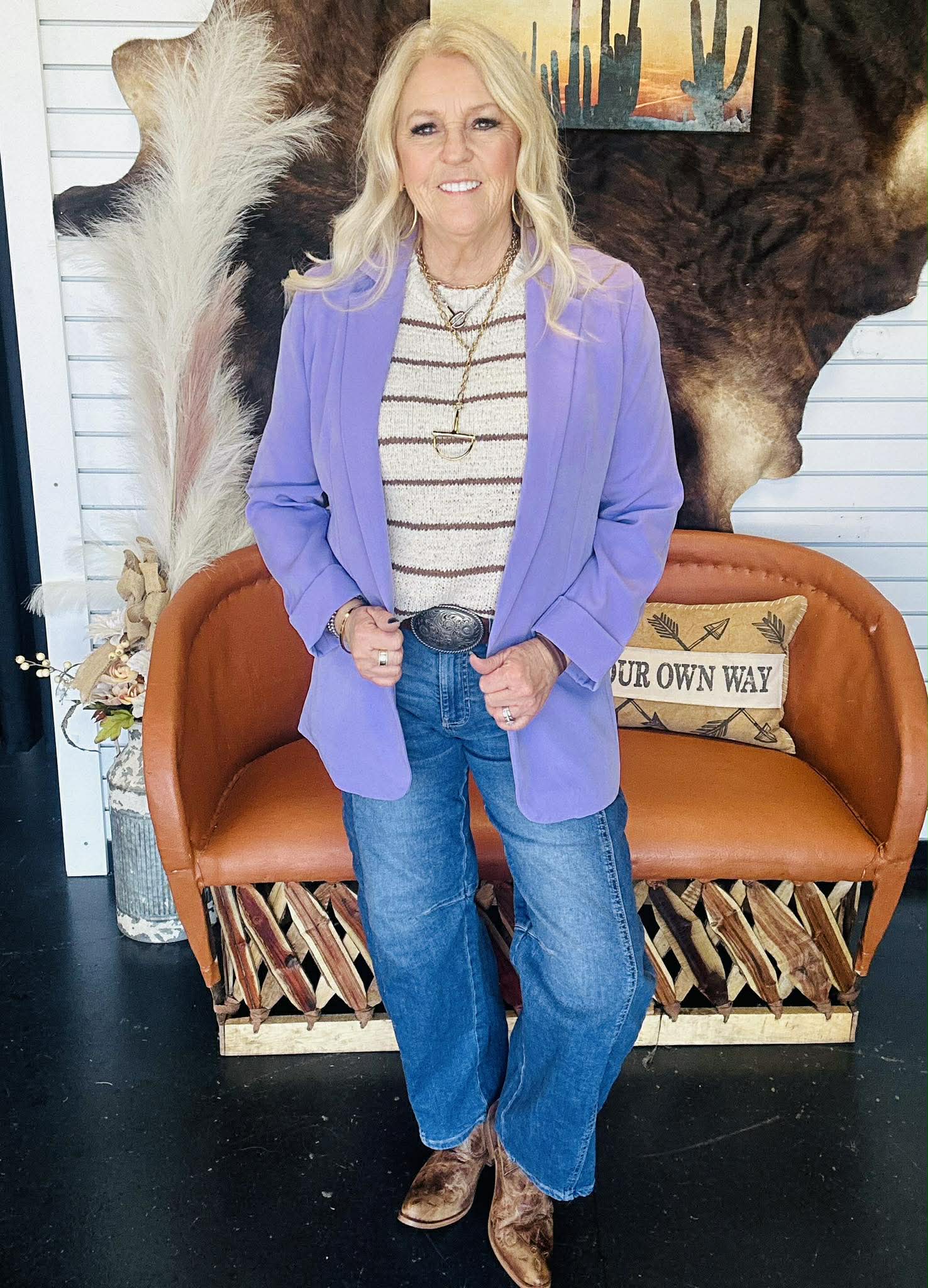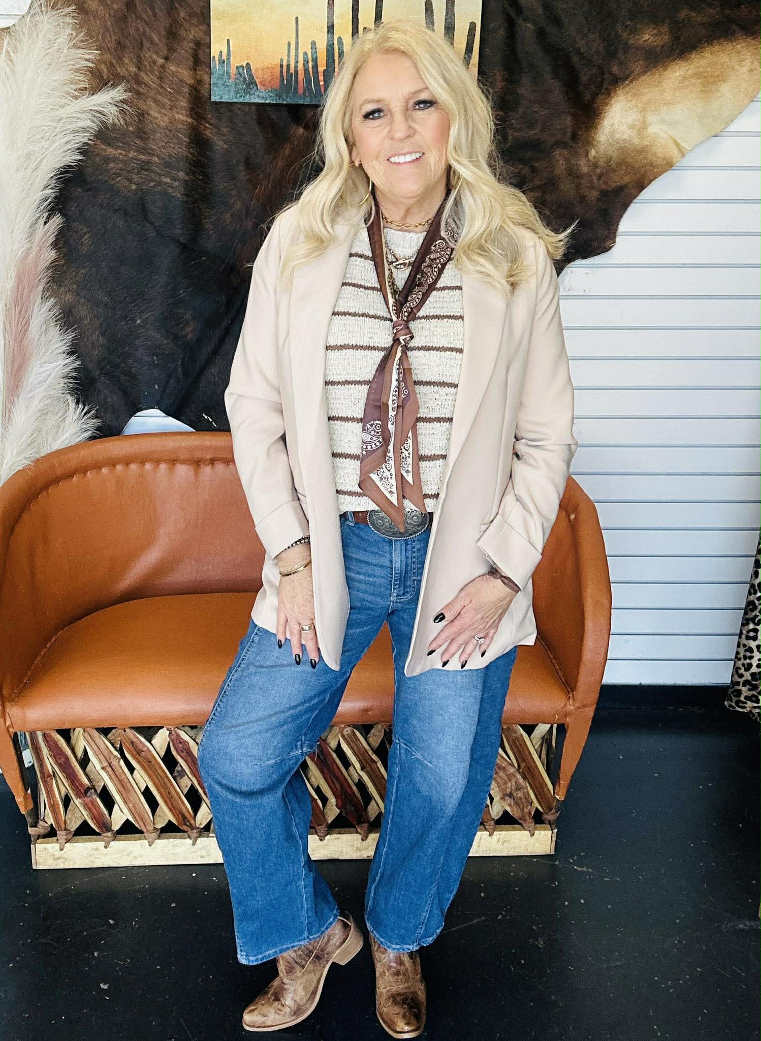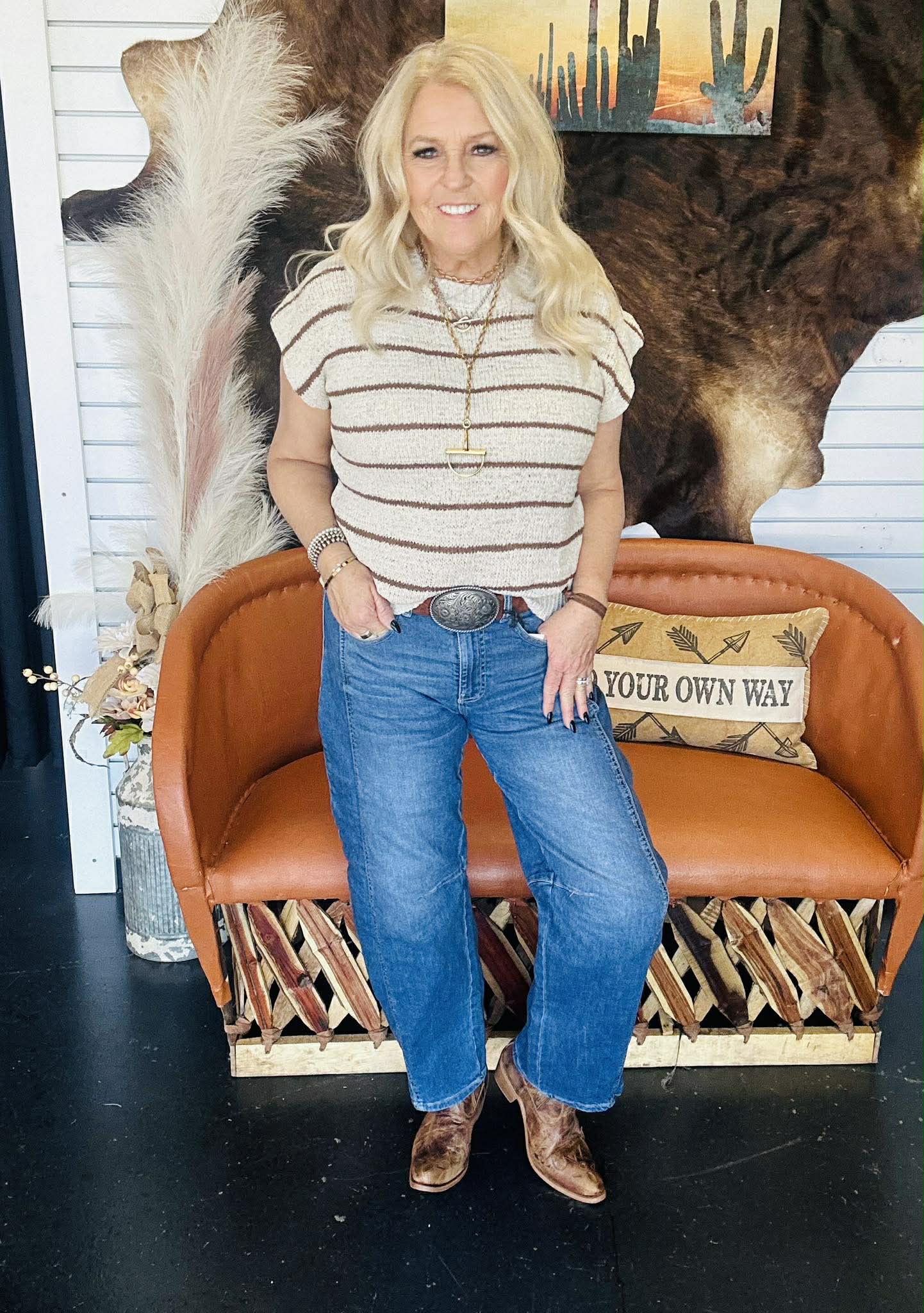 The Lori Beige Striped Sweater Top brings that effortless western chic feel with warm brown and beige tones that go with everything. It’s relaxed, easy, and gives you that “styled but not trying too hard” look we’re always after.