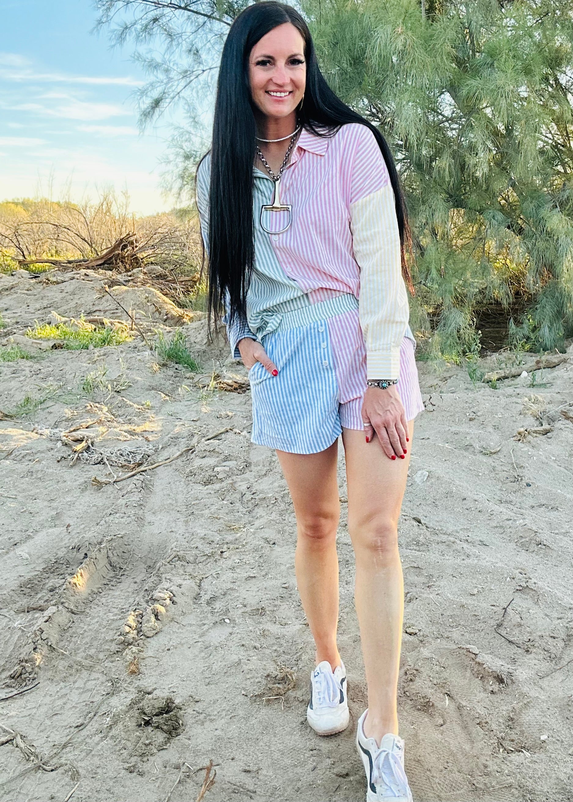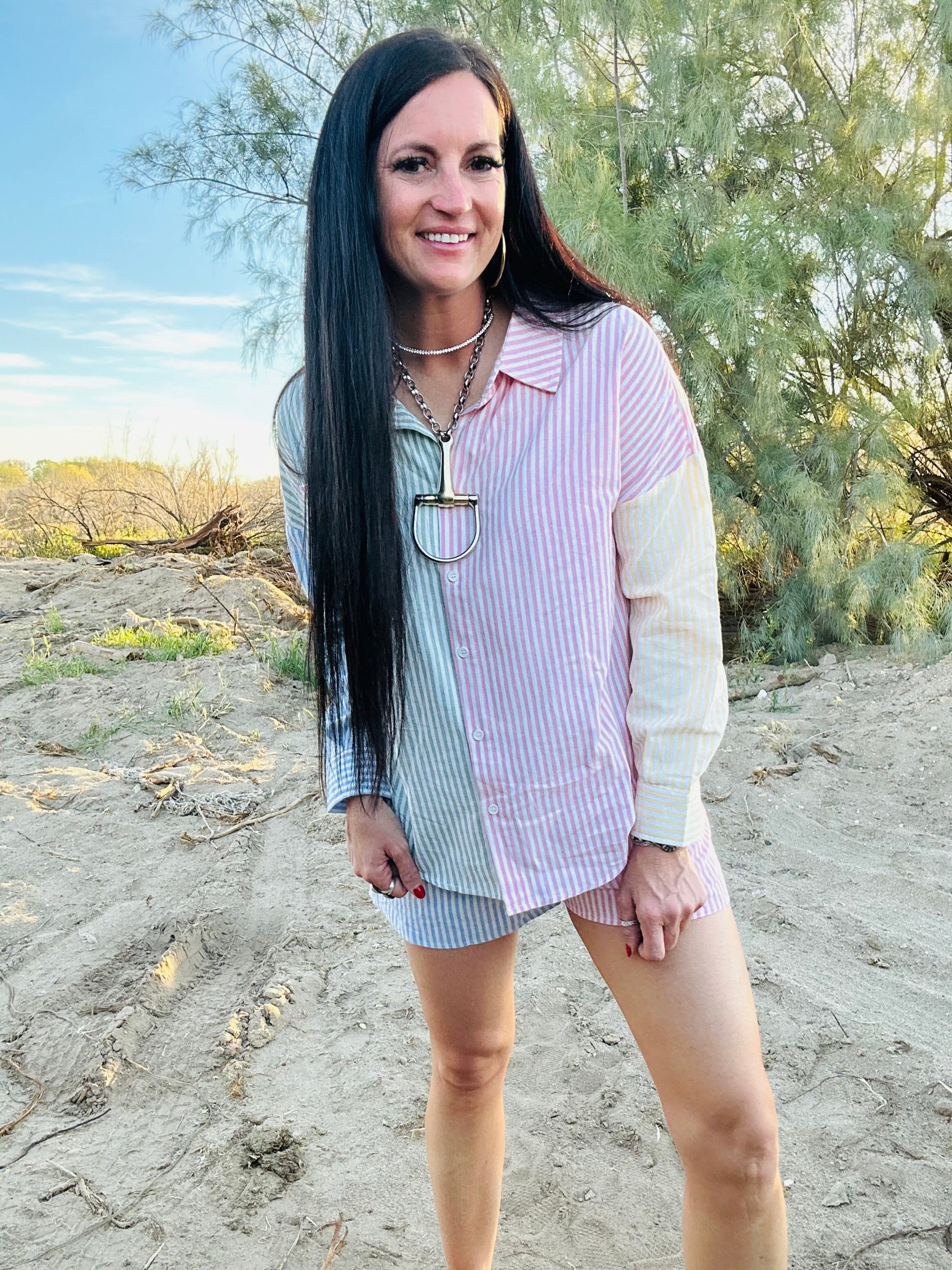 Meet the set that makes getting dressed easy. The Sara Striped Top and Short Set gives you that effortless oversized button-down look paired with relaxed boxer-style shorts that feel just as good as they look. The striped color block detail keeps it fresh and fun while still being neutral enough to style a hundred different ways.