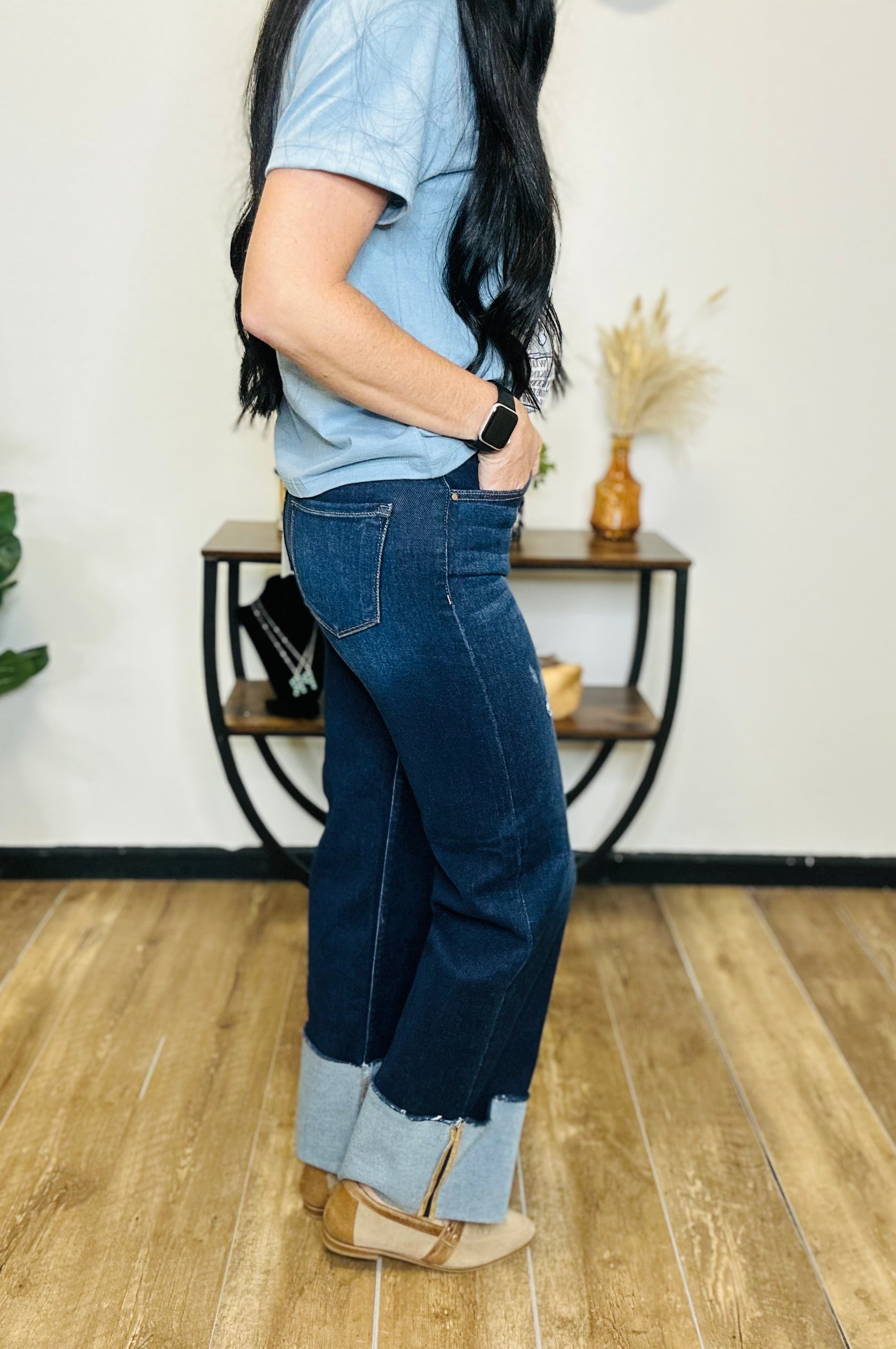 Meet the denim that makes every outfit feel intentional. The Seth Jeans by Risen feature a rich dark wash, a flattering high-rise waist, and a wide ankle cuff that gives them a modern, elevated twist. The structured yet comfortable stretch denim makes them perfect for styling with everything from graphic tees and sweaters to blouses and boots. Seth is that standout pair that brings easy sophistication to your everyday wardrobe.