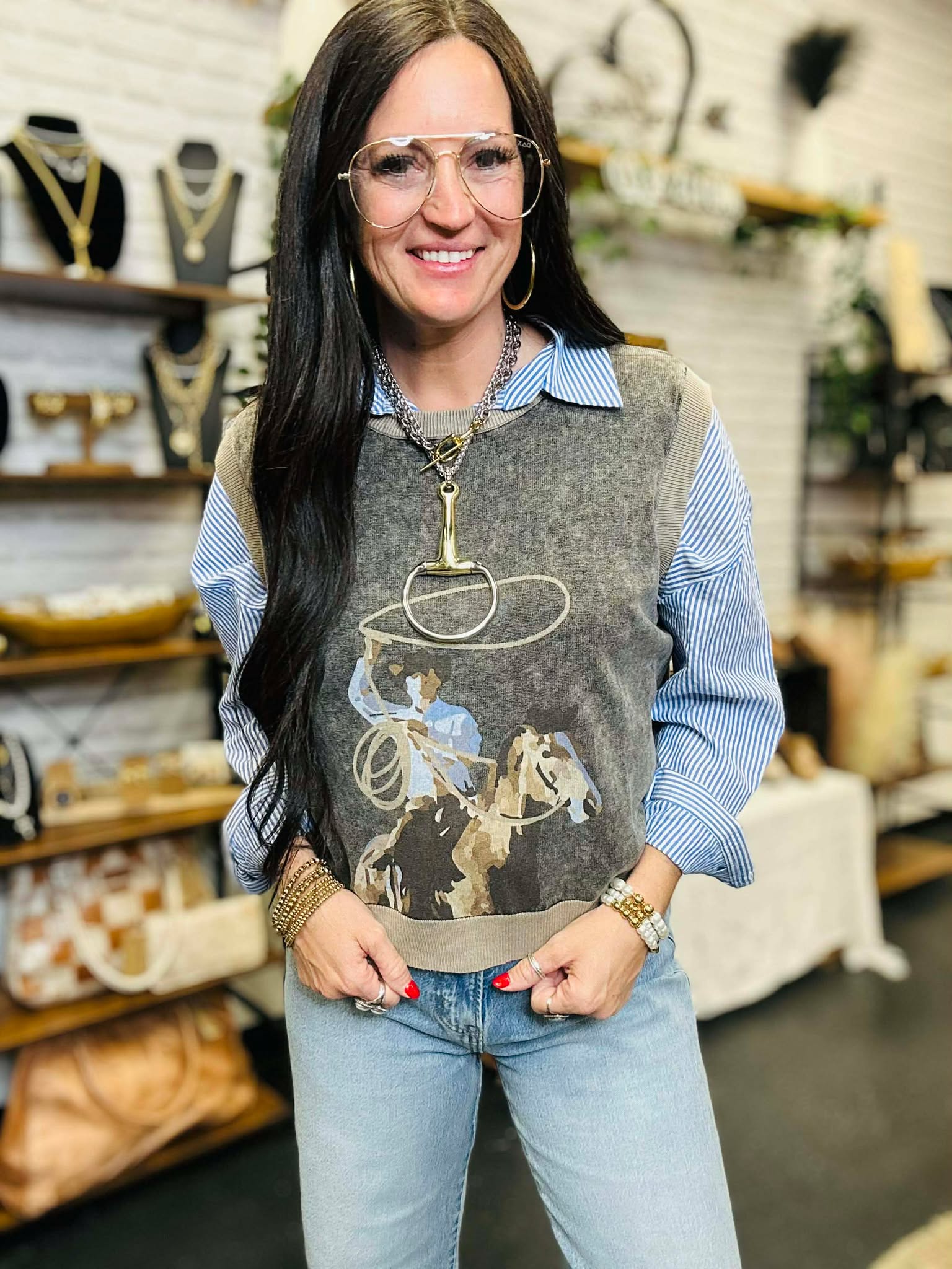 The Swing Wide Western Sweater Vest Top is the same boxy, easy style you’ve loved before — but this time we gave her a bold western cowboy graphic and the prettiest washed finish. The denim-toned graphic pops perfectly against the soft knit, giving you that laid-back ranch feel without trying too hard.