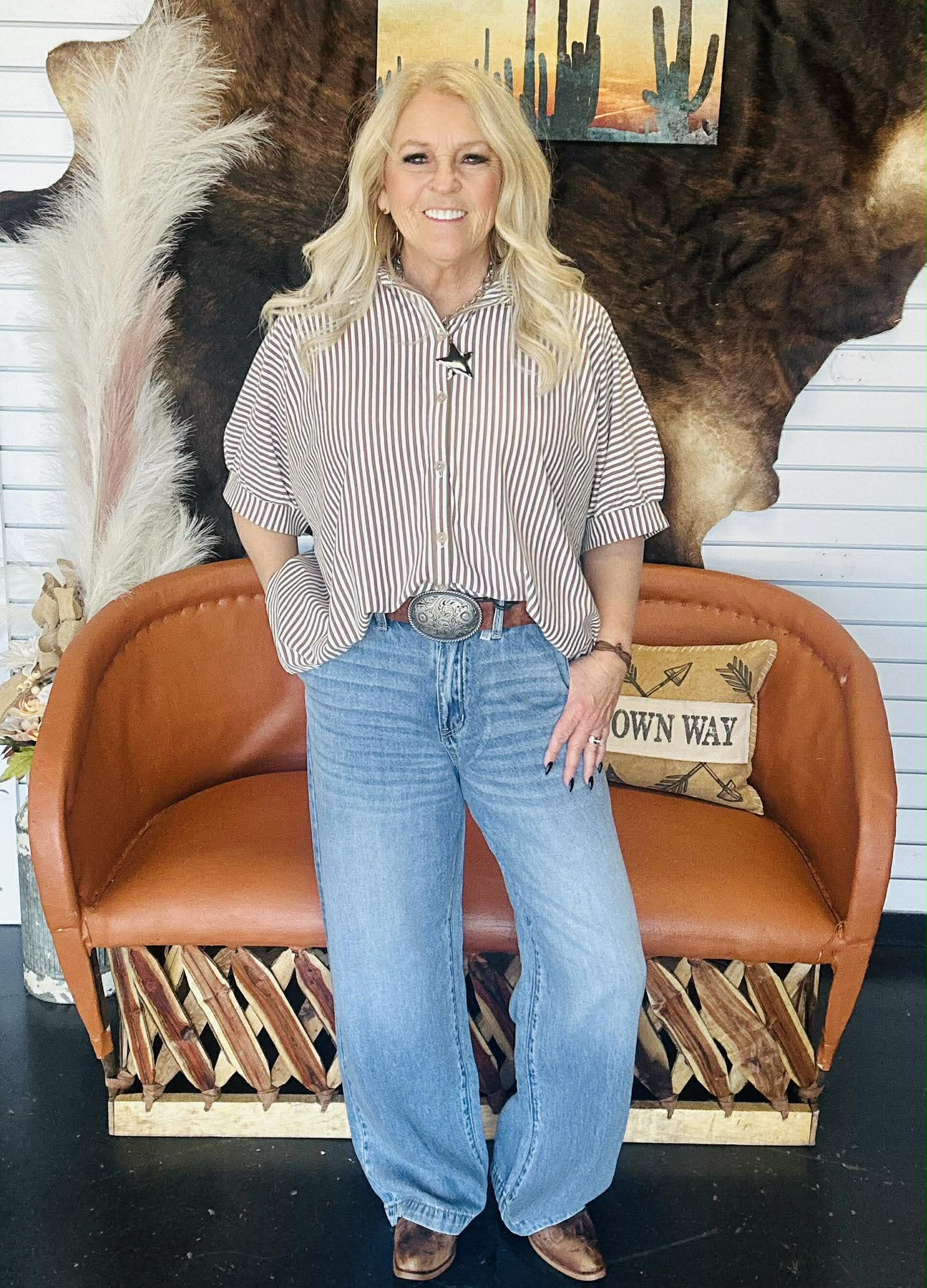 There’s just something about a good striped button-down that never goes out of style. The Tess Striped Oversized Blouse gives you that relaxed, effortless look with soft tan stripes that feel neutral, easy, and endlessly wearable.