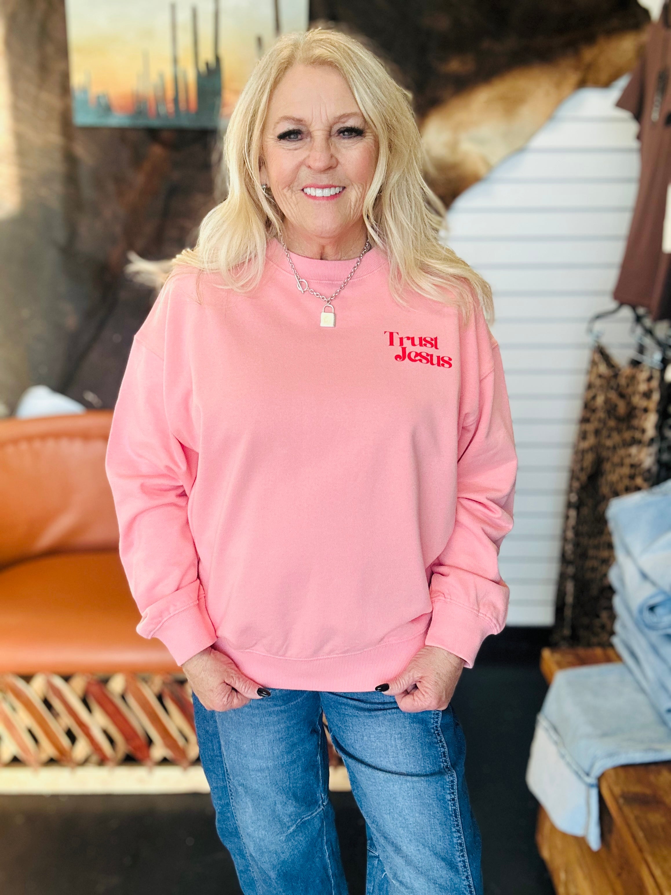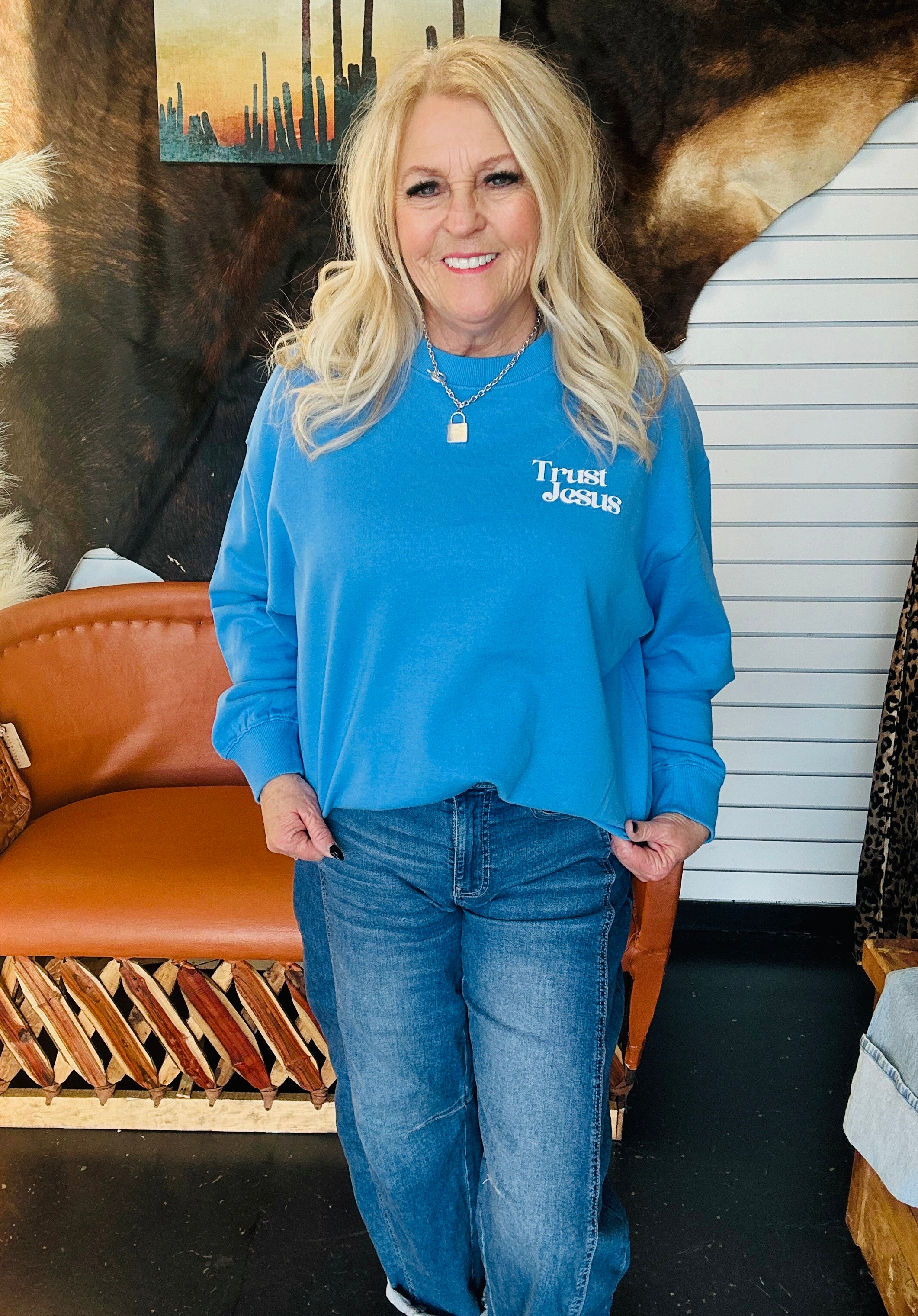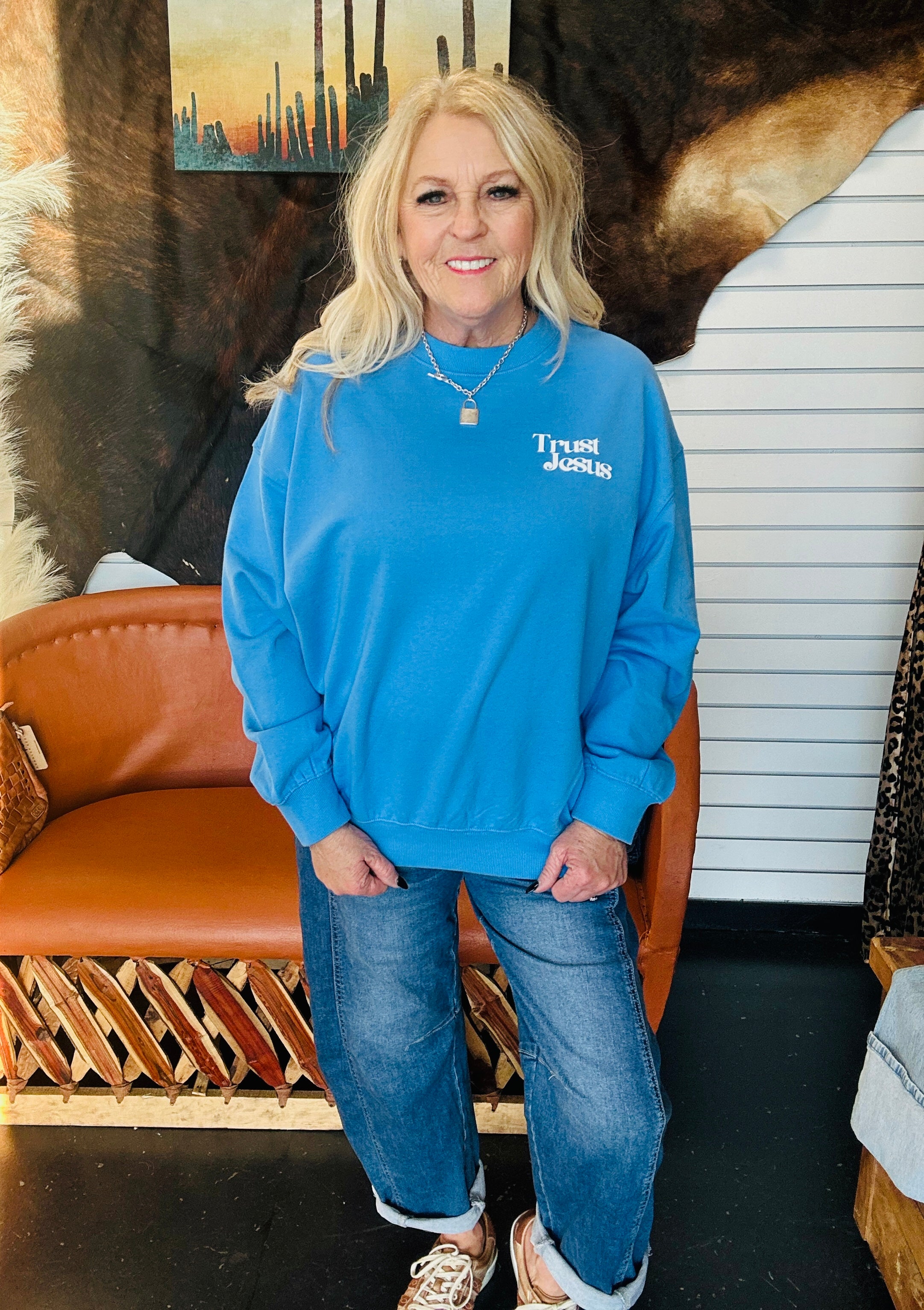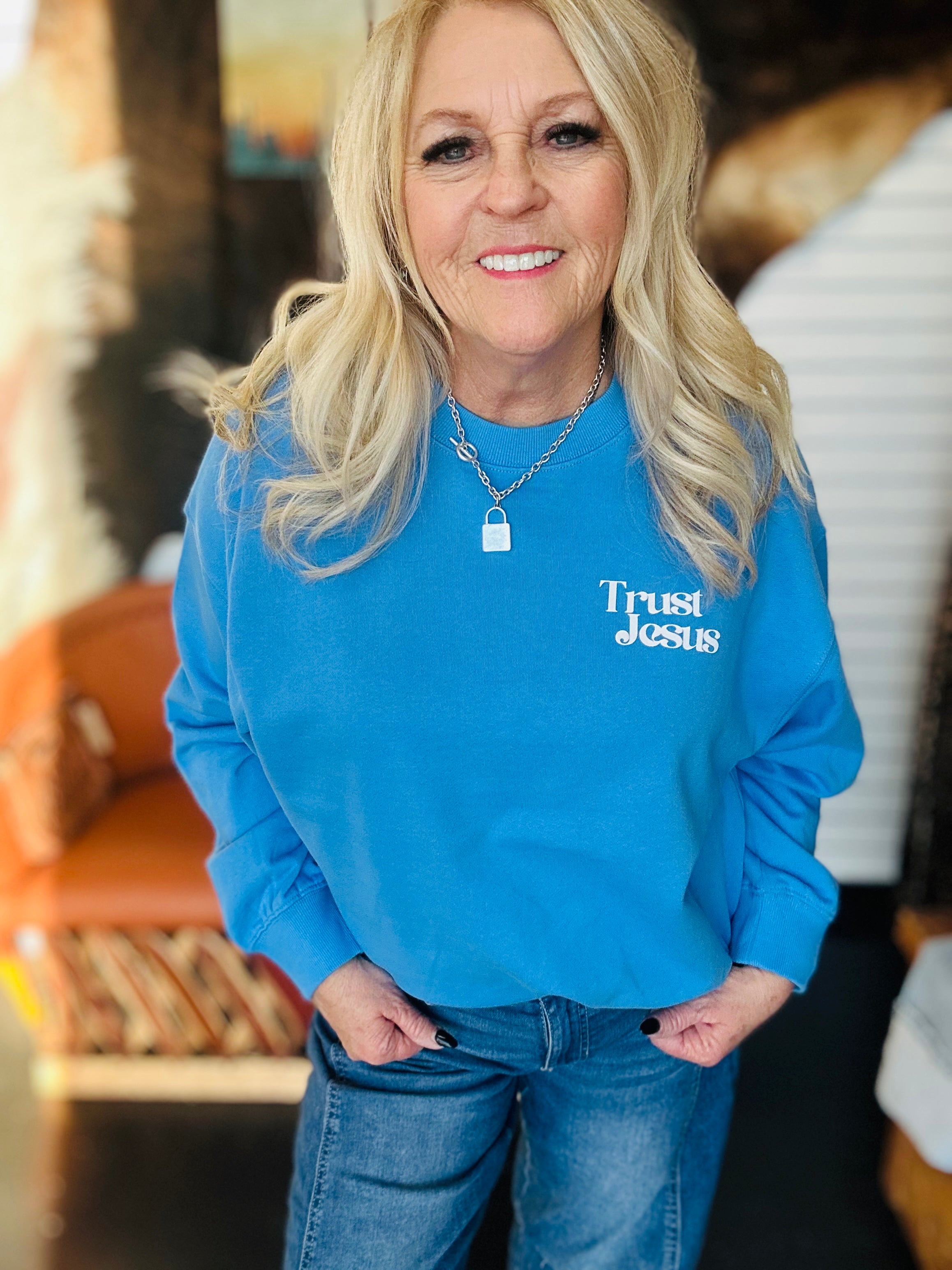 The Trust Jesus Graphic Sweatshirt features a front chest graphic that reads “Trust Jesus” and a full back statement design that declares “The Way, The Truth, The Life – John 14:6.” It’s bold in message but easy in style — the kind of piece that speaks without shouting.