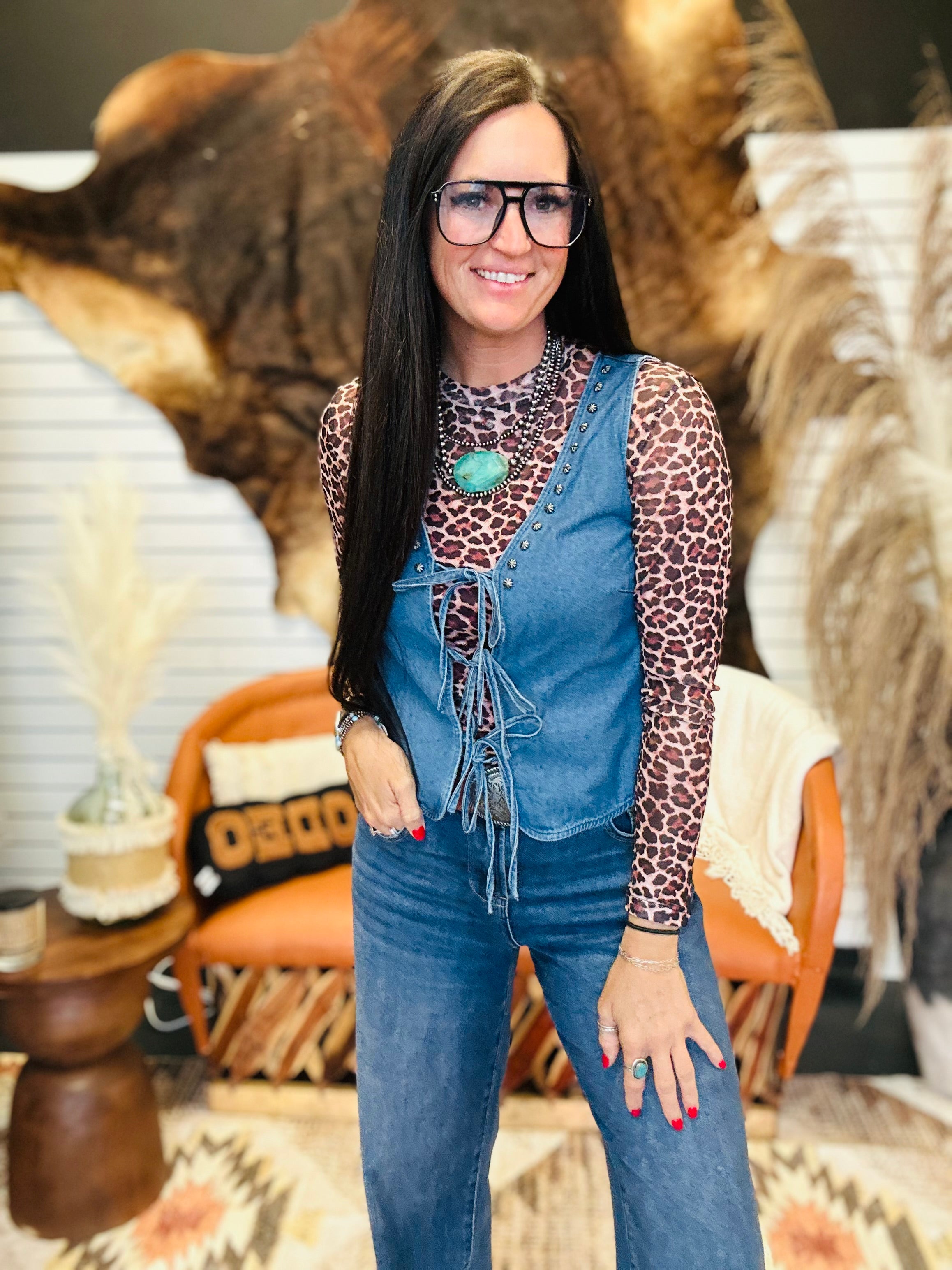 When your outfit feels a little too basic, this vest fixes it fast. The Ali Studded Denim Tie Vest adds that instant western chic edge with a lightweight denim feel you can wear year-round. The triple tie front gives it a fun, flattering shape, and the studded trim at the neckline brings just the right amount of detail without being over the top. It’s the perfect throw-on layer when you want to look styled in seconds—cute, easy, and so wearable.