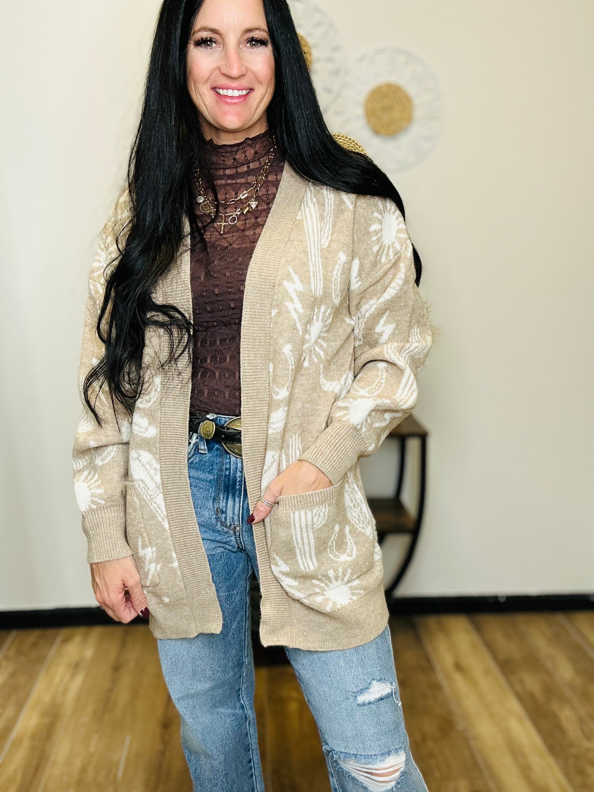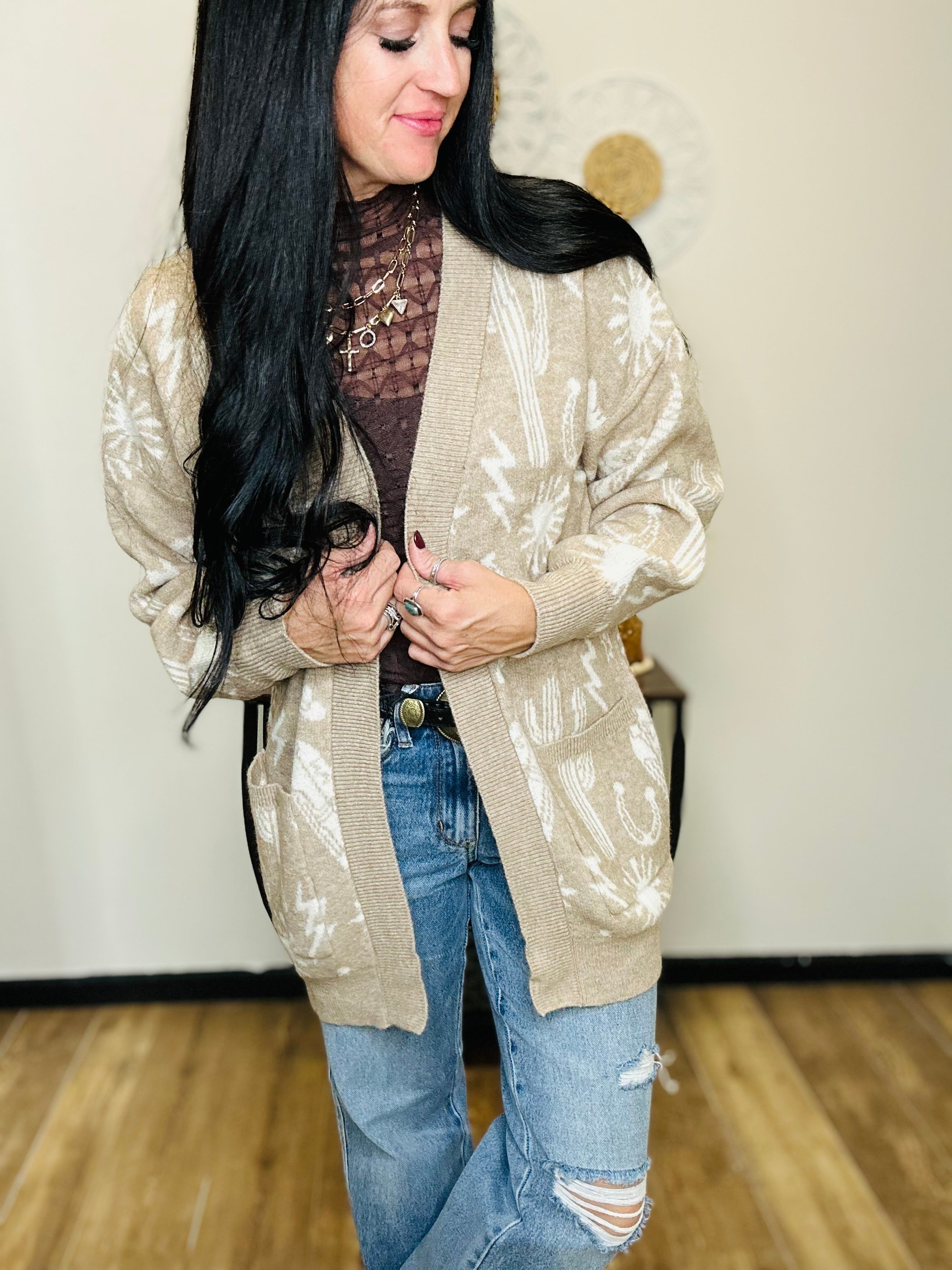 Make a bold statement with the Willa Western Graphic Sweater Cardigan. Designed with an oversized fit and eye-catching western-inspired knit pattern, this cardigan blends cozy comfort with standout style. The open front design, tunic length, and drop shoulders create that effortlessly relaxed silhouette we all love. Finished with front pockets for practicality, the Willa is the perfect layering piece to throw on over your favorite denim and boots for an authentic boho-western vibe.