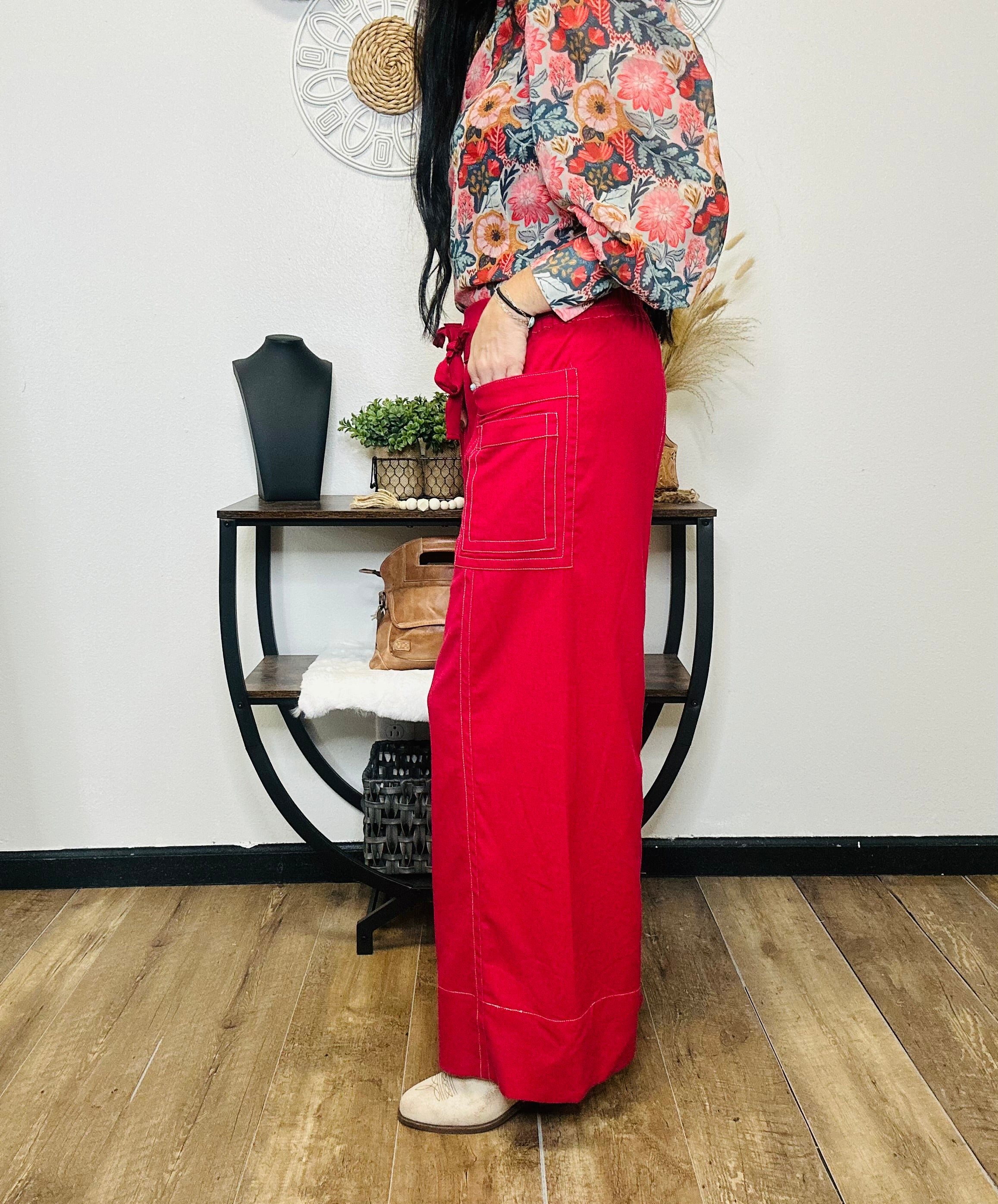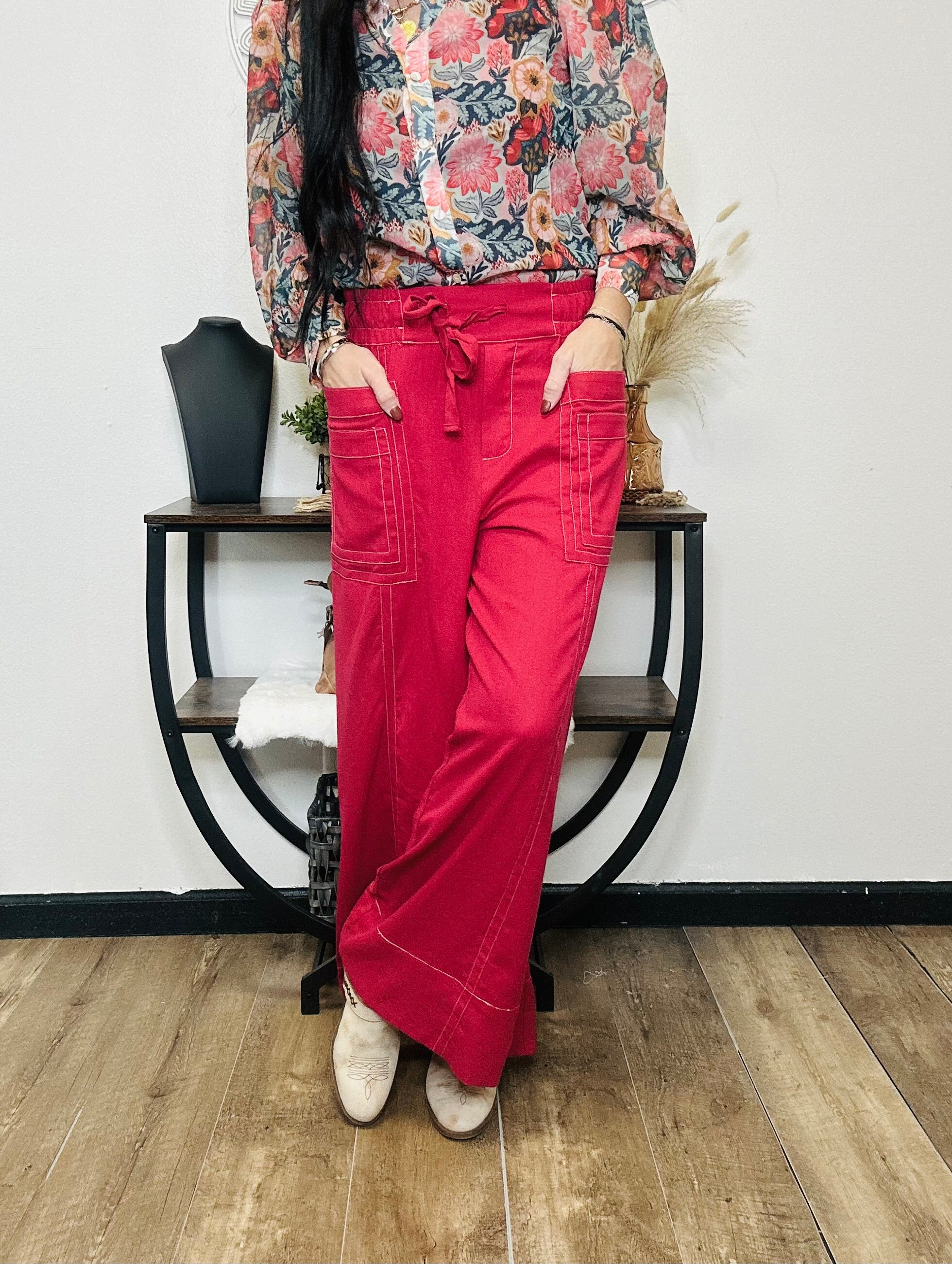 The Jonah Pants are that perfect mix of laid-back comfort and bold, confident style. Made with a soft linen blend and a flattering wide leg, these pants move with you — breezy, comfortable, and effortlessly chic. The bold red color and contrast stitching add just the right amount of detail, while the stretchy waistband and wide tie front keep things easy and flattering.
