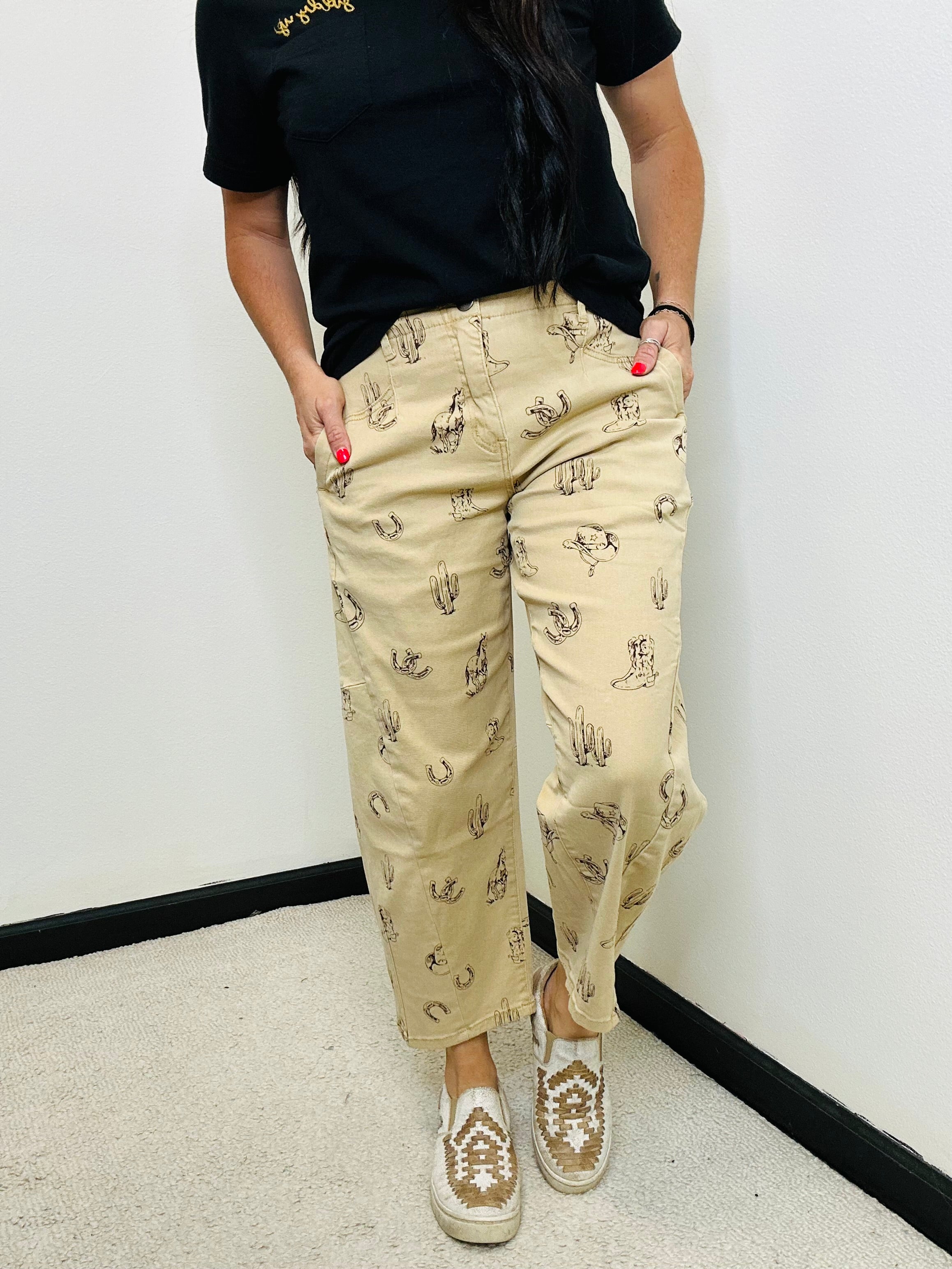 Easel Western Print Khaki Barrel Style Cropped Jeans