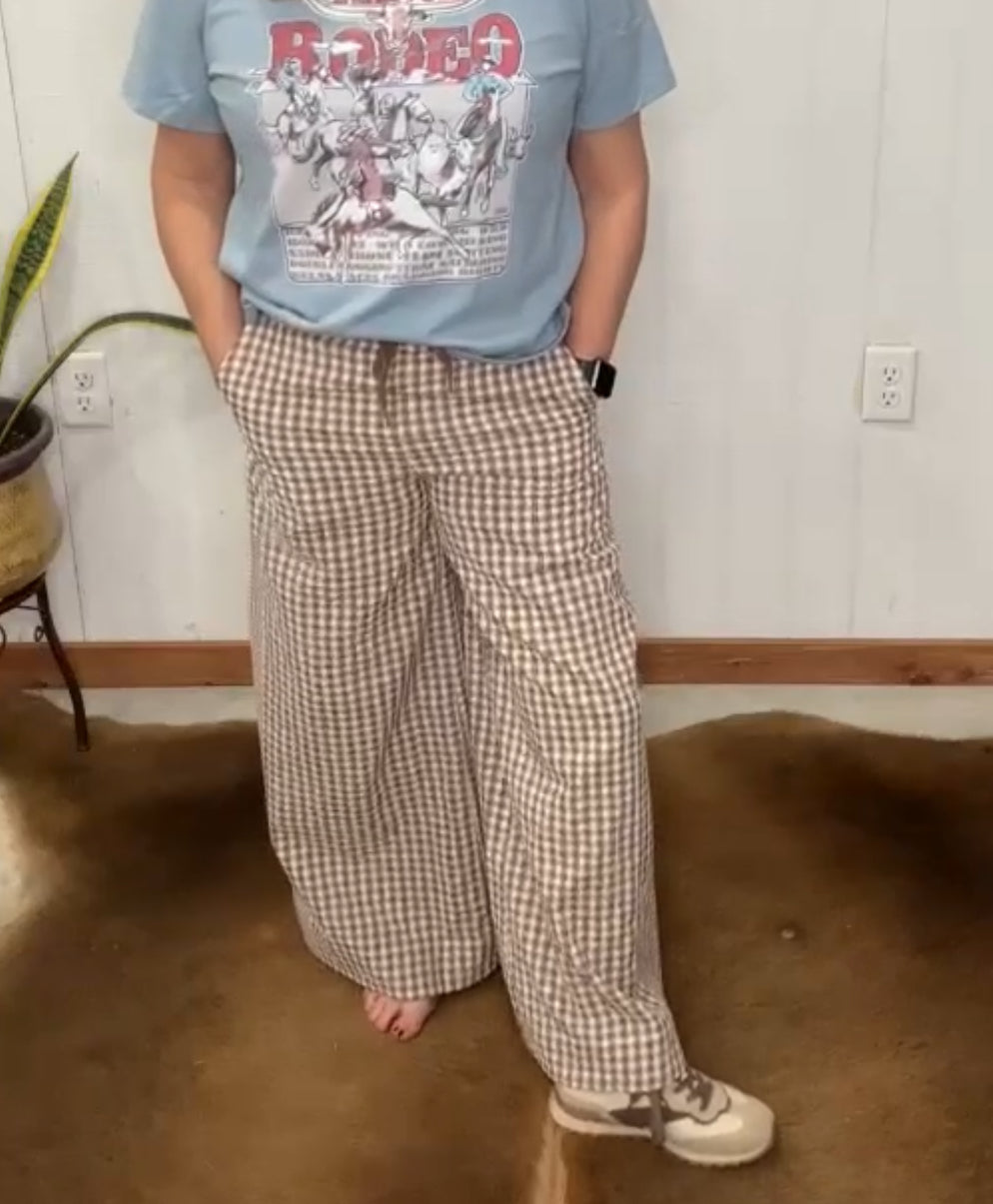 Women's Wide Leg Mocha and White Checkered Wide Leg Seersucker Pants